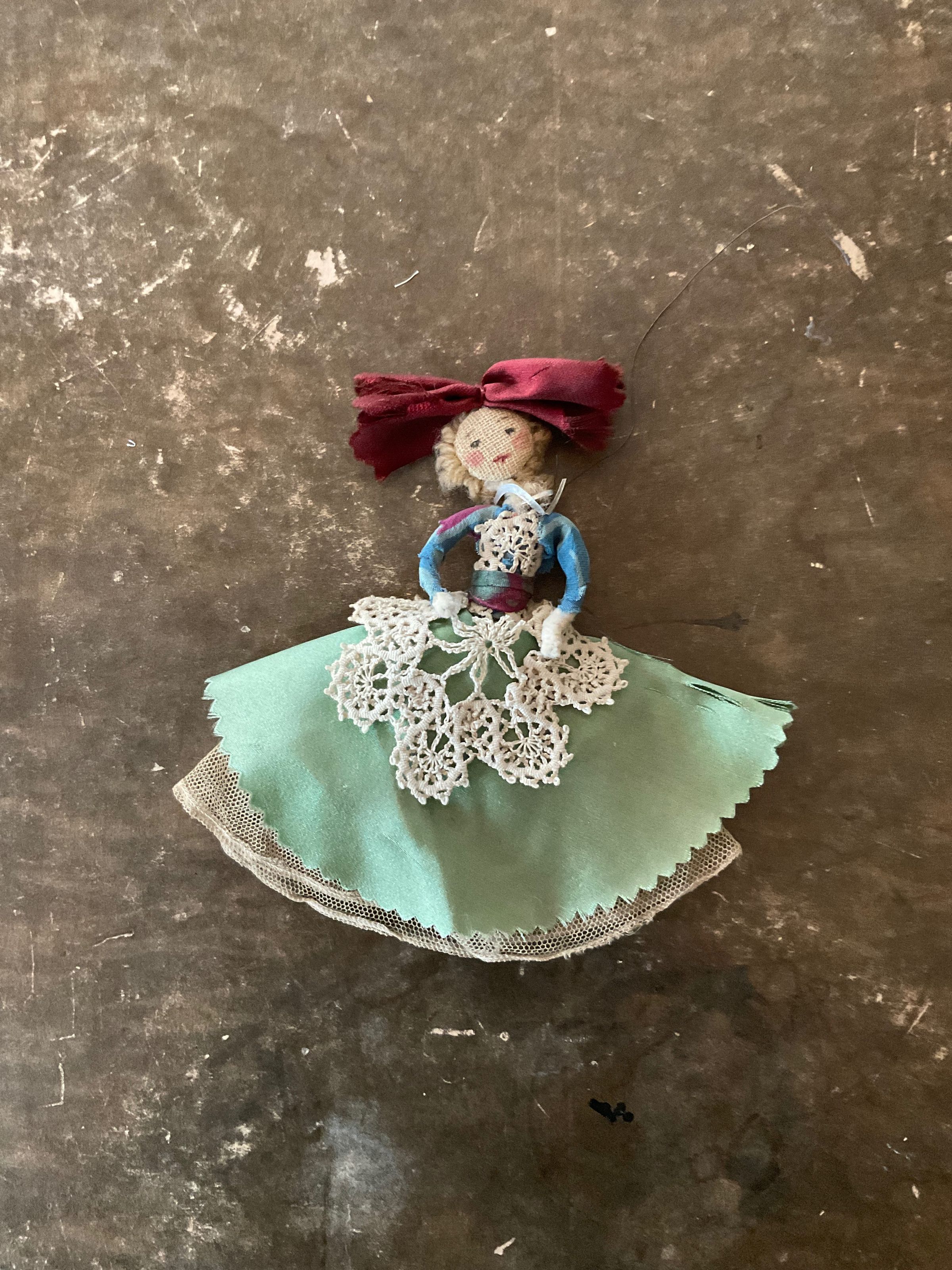 Doll made out of pipe cleaners and fabric. There is a string attached to the head, making it seem like it was meant to be an ornament or hanging decoration. The doll has blonde hair, a big red ribbon on her head, a greed dress and lace embroidery.Collection