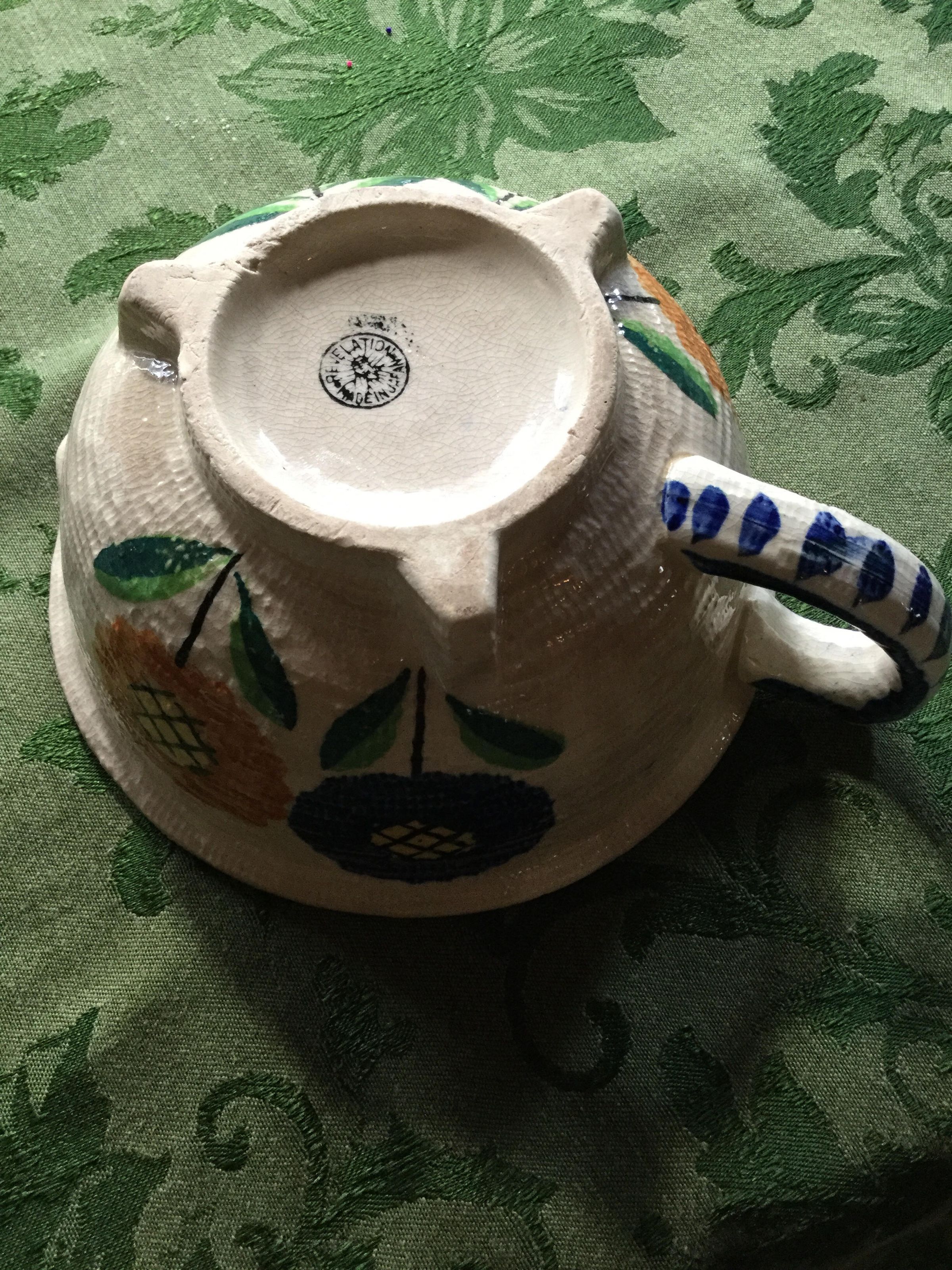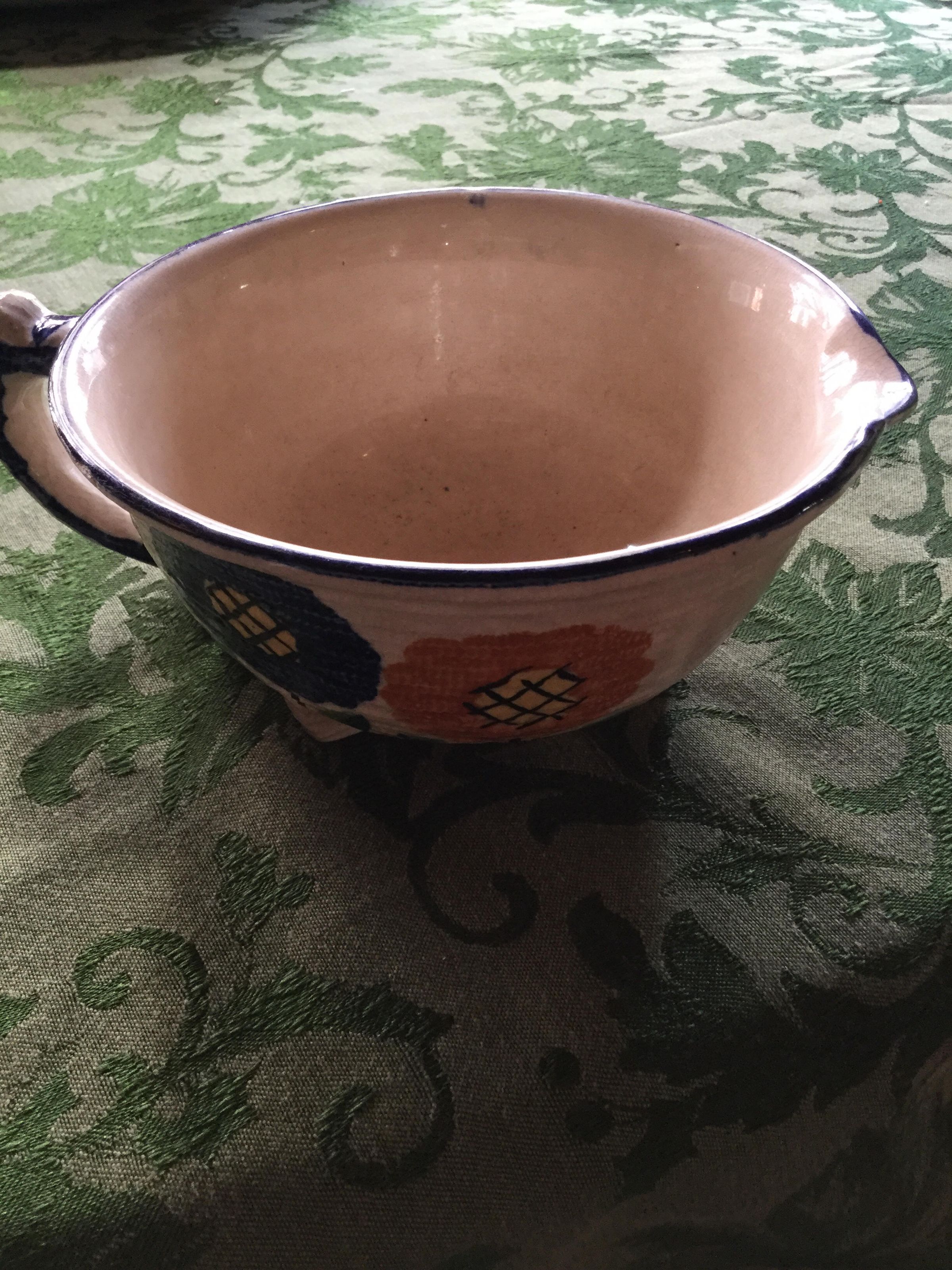 Wide mouthed ceramic pitcher with dark blue edging around the top with orange, green and red flowers around outsideInscription/Signature/Marks