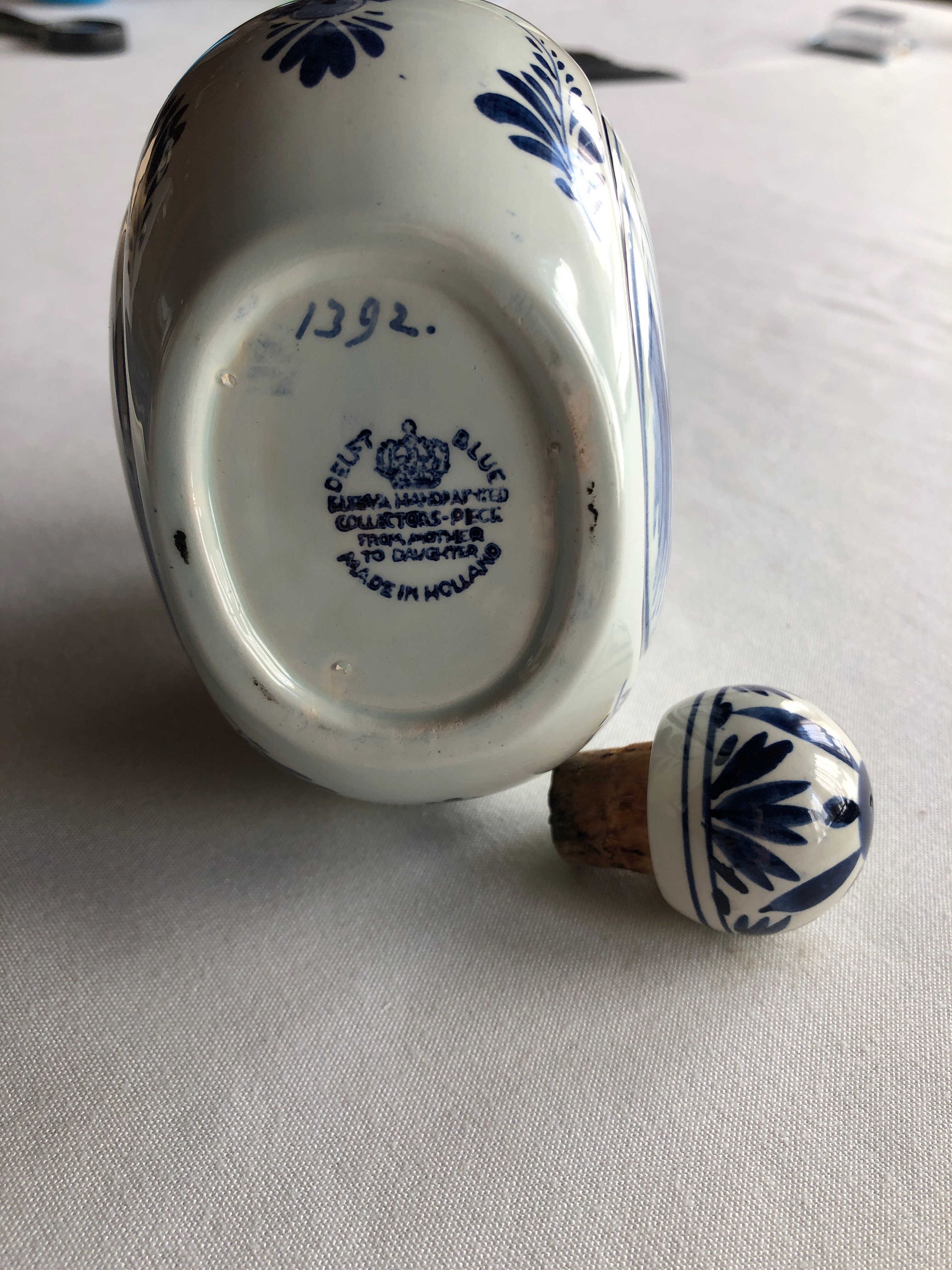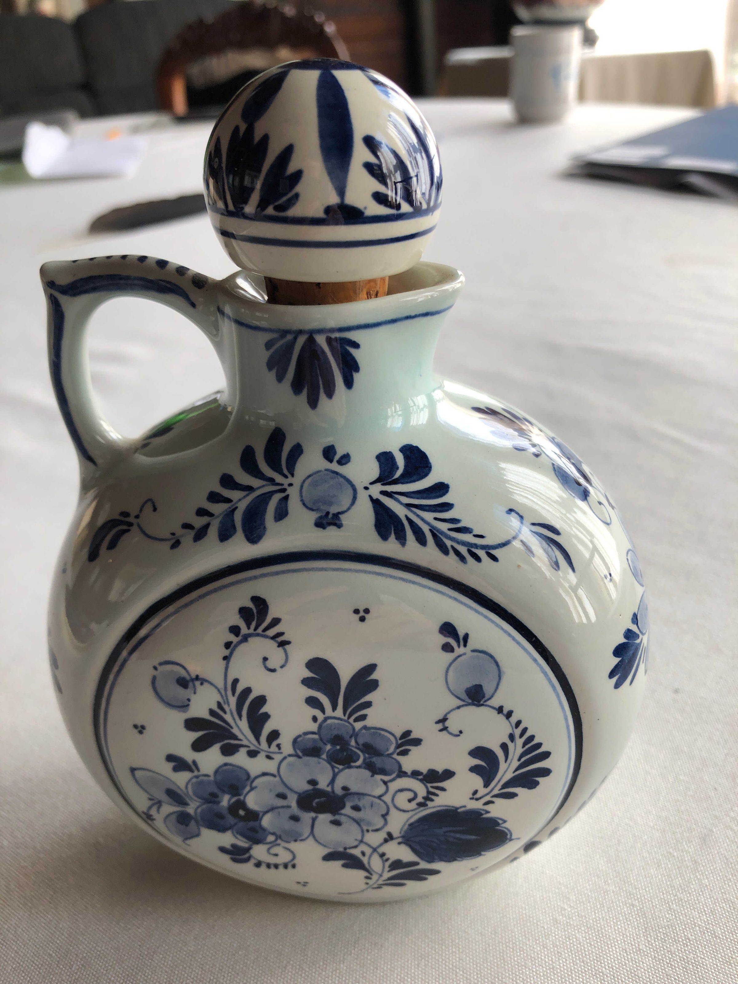 Ceramic pitcher, flattened spherical shape, done in cobalt blue over white background, cork stopper, single finger loopInscription/Signature/Marks