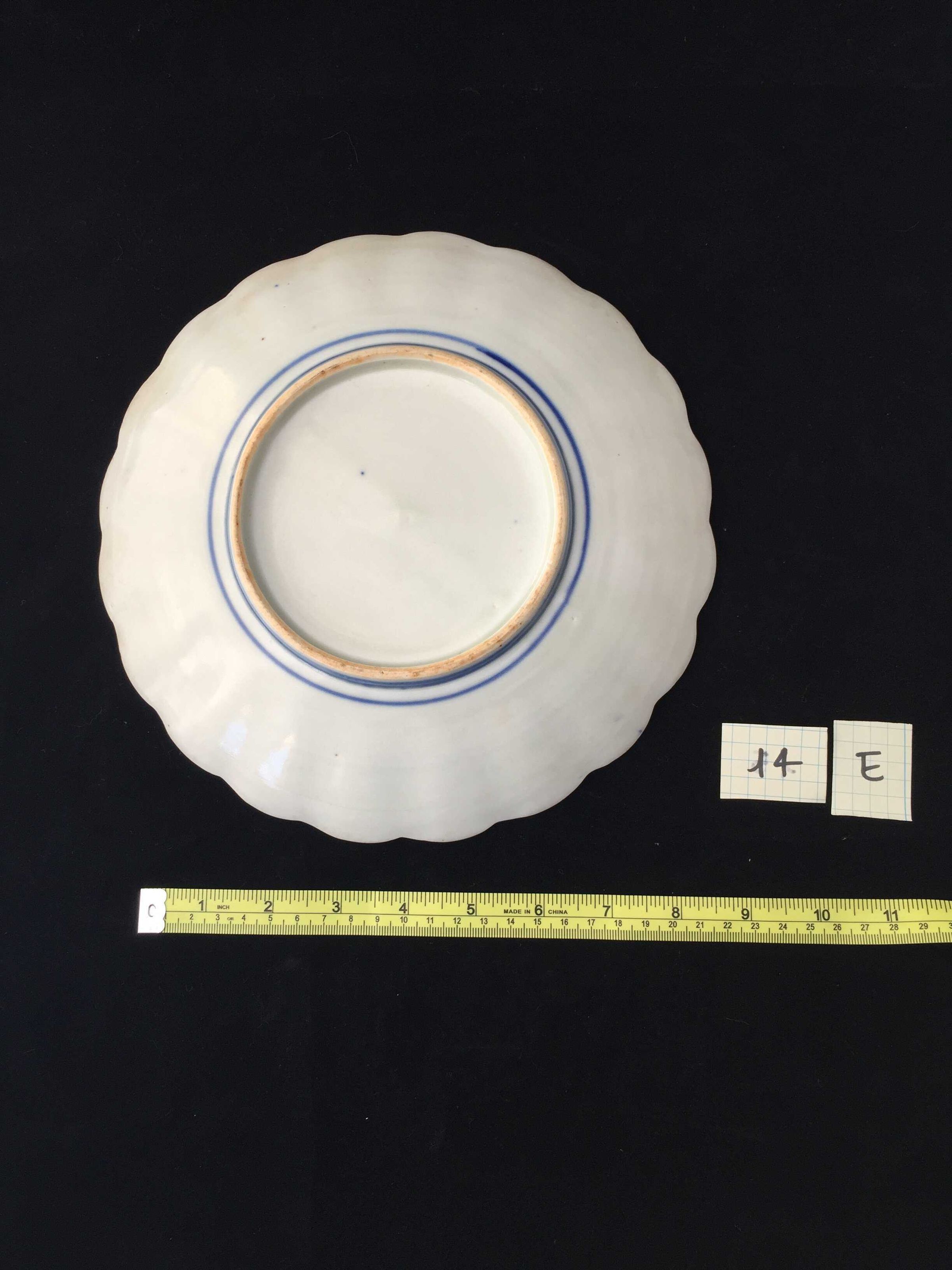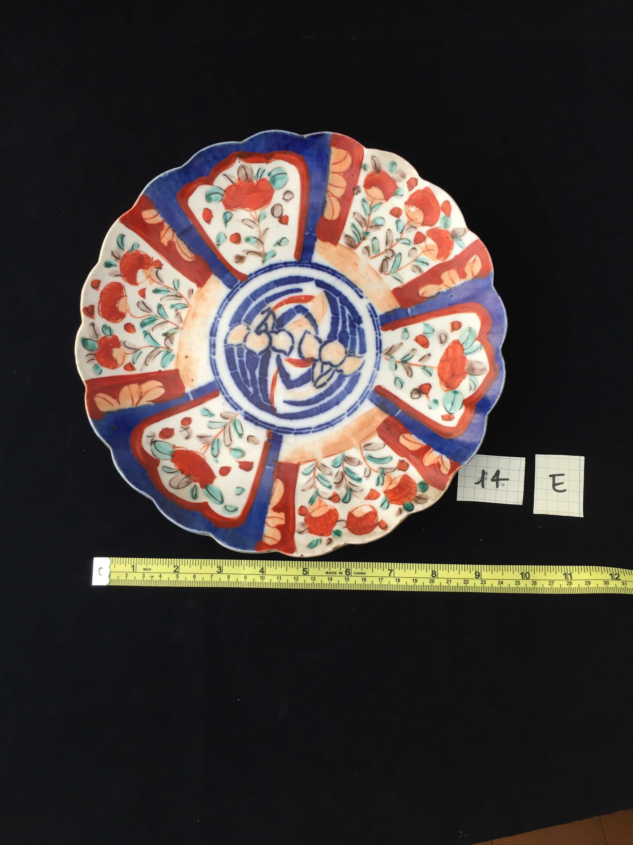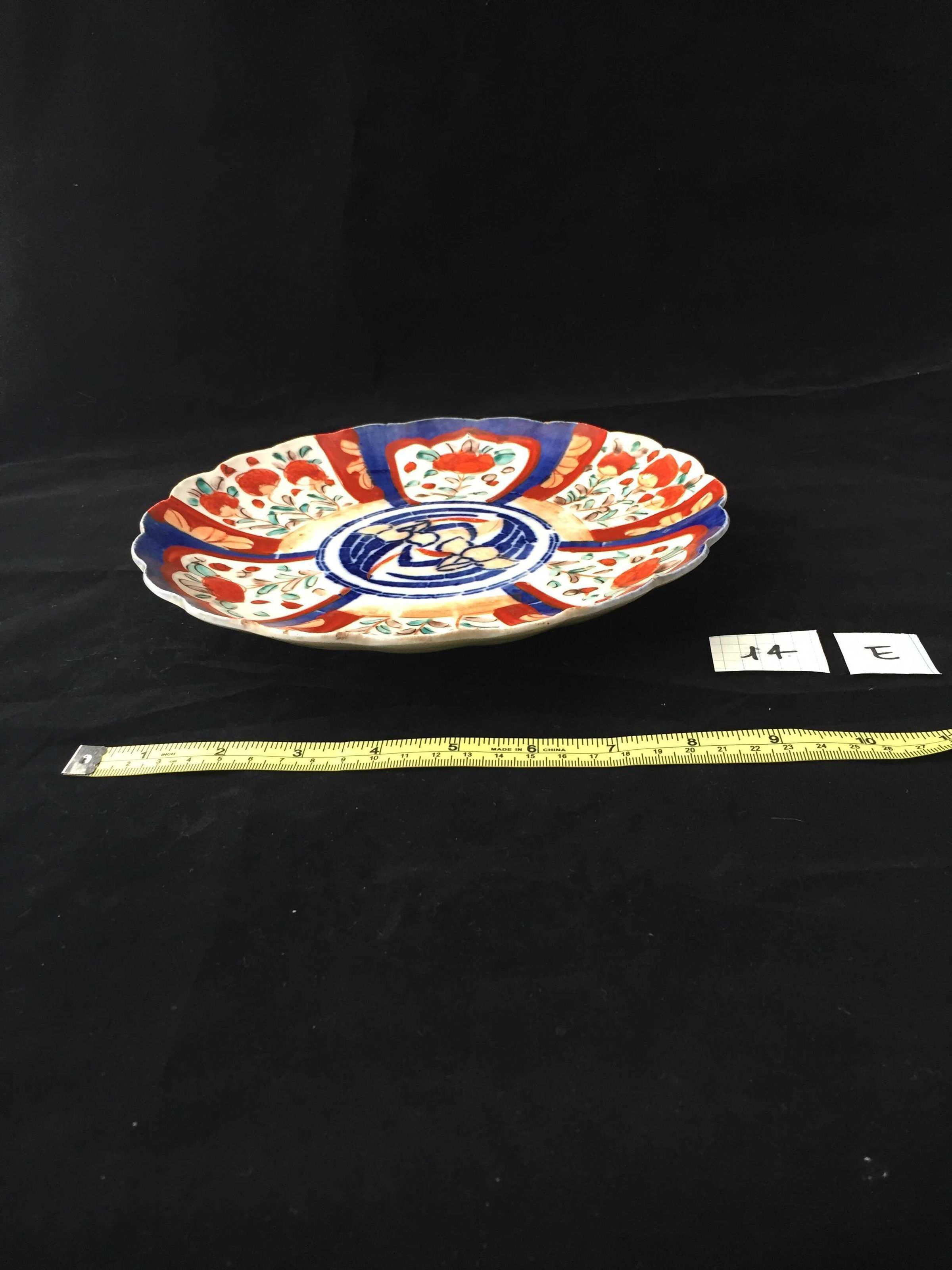 Blue and red floral design, scalloped rim, two lines of blue glaze on base, stoneware Chinese