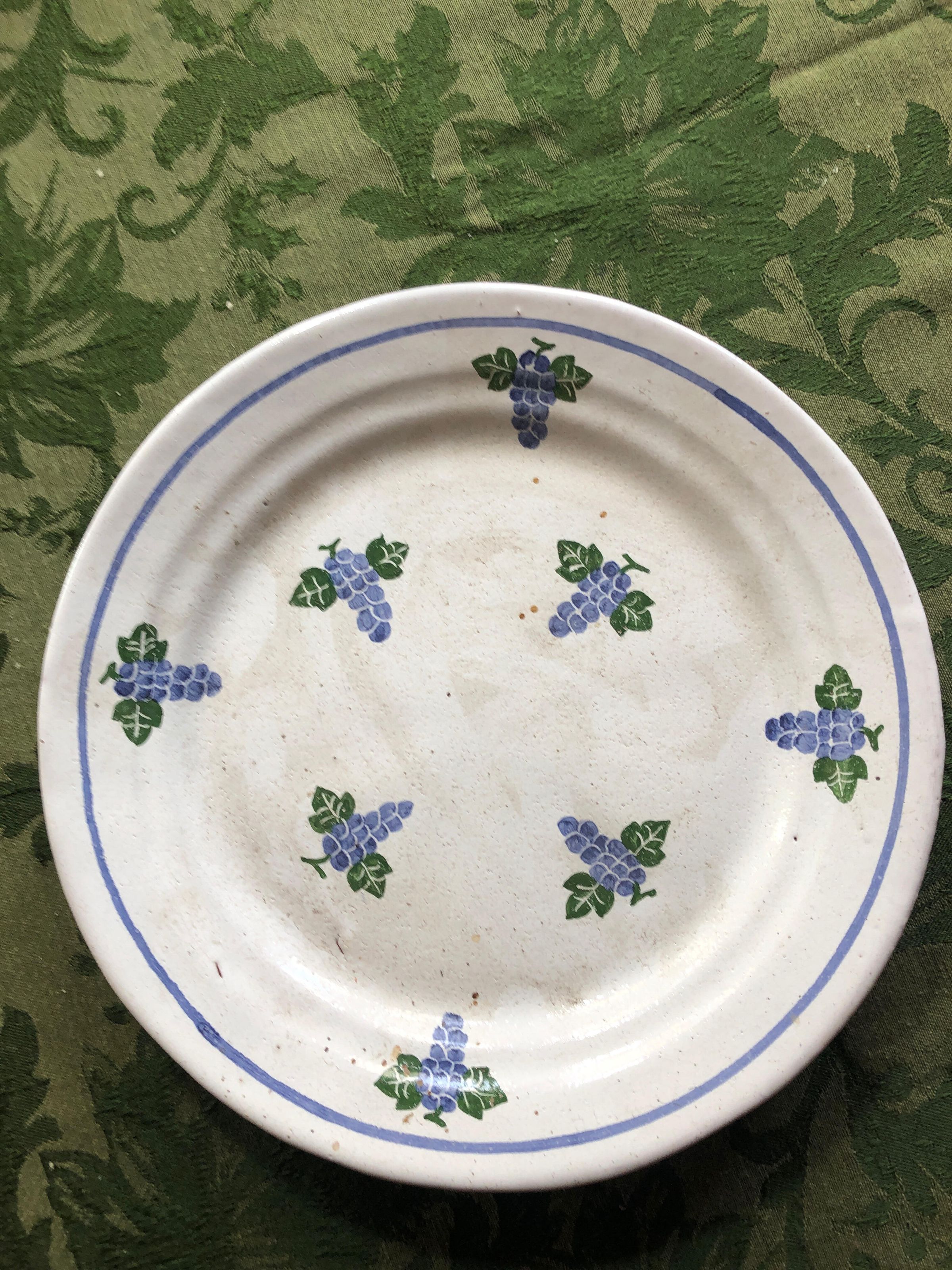 White ceramic dinner plate with one concentric blue circle on outer edge with hand painted grape clusters and green leavesInscription/Signature/Marks