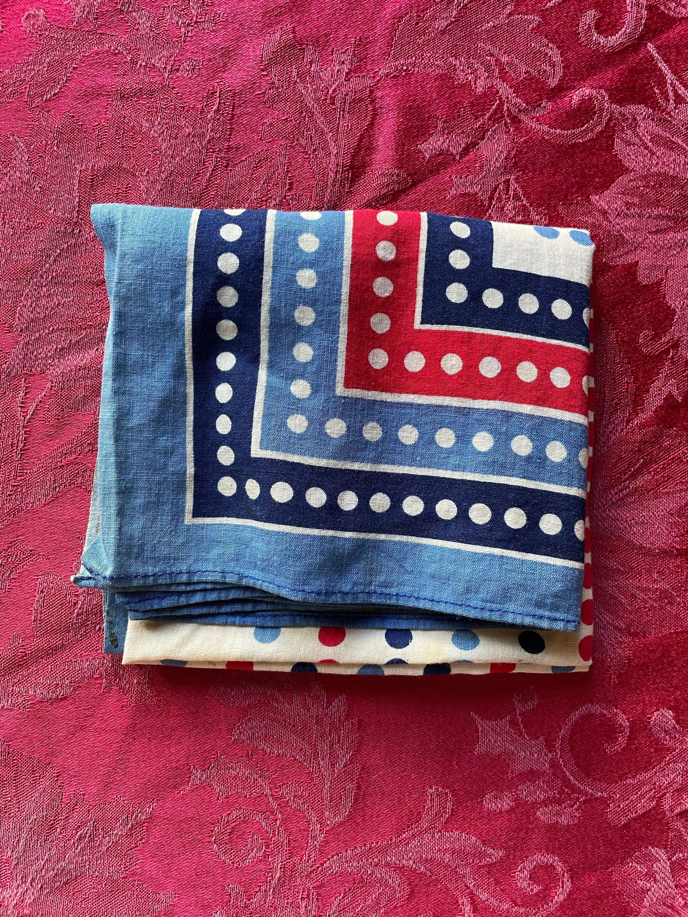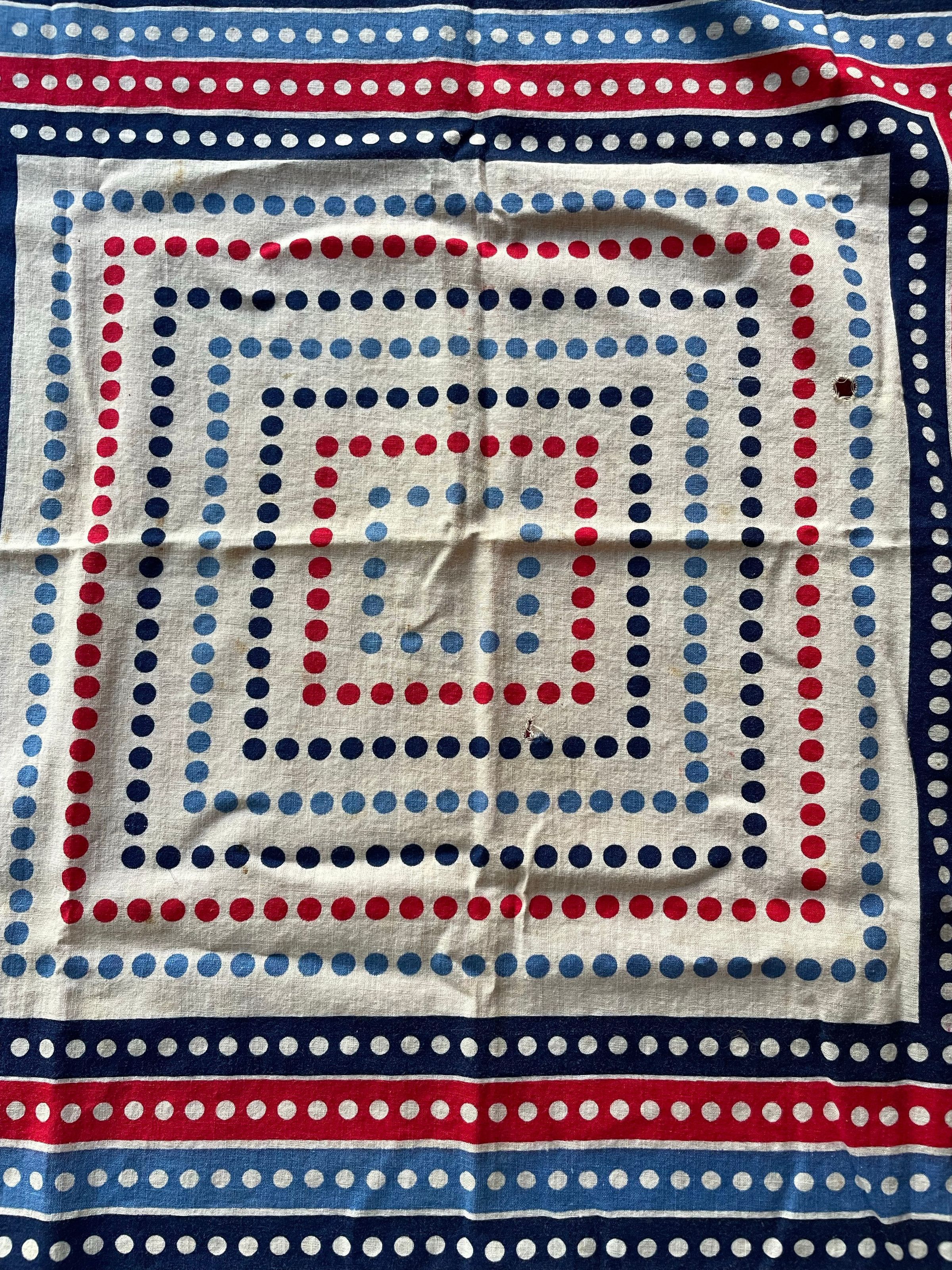 A multicolored patterned scarf with white, blue, and red stripes.