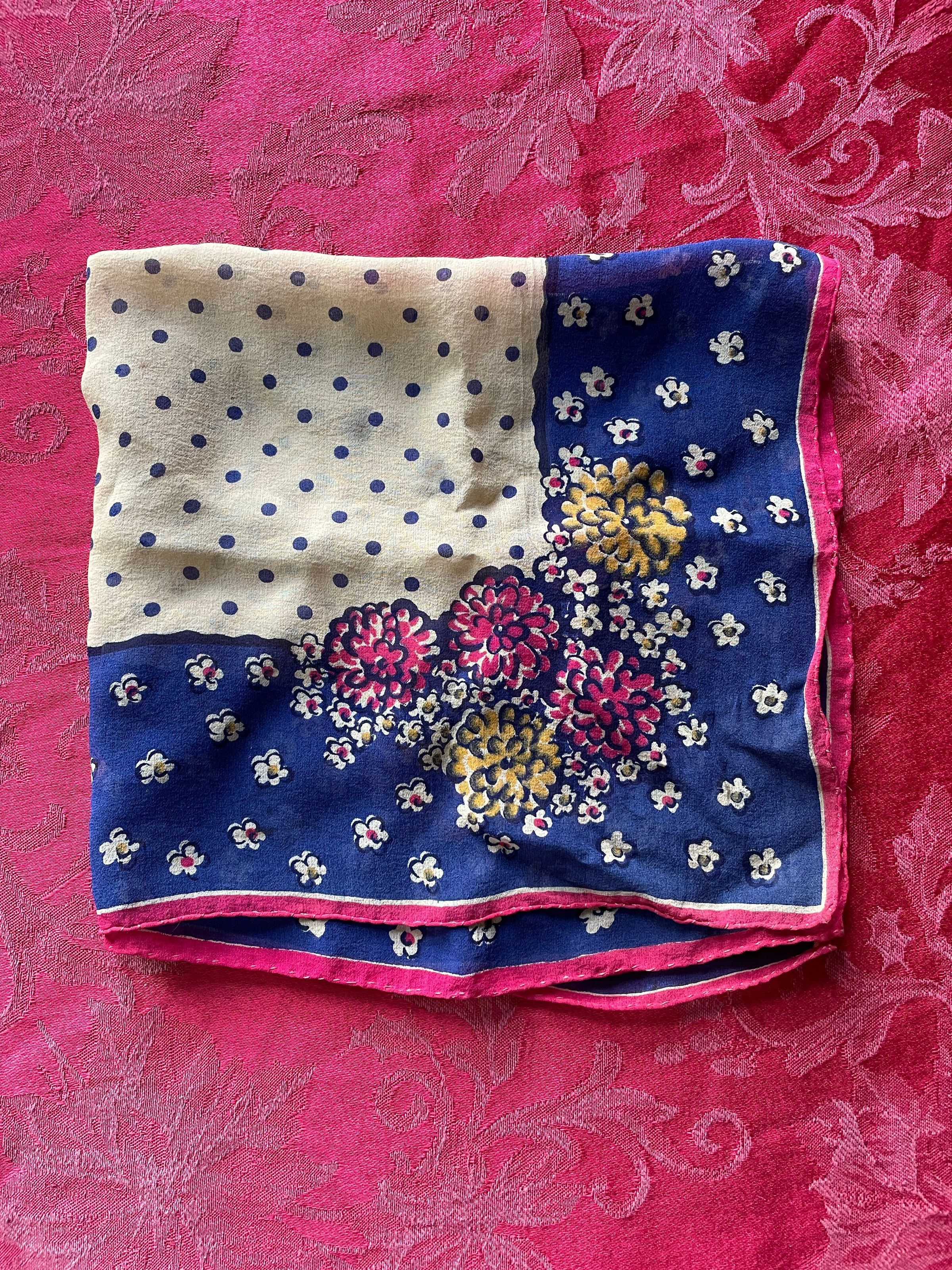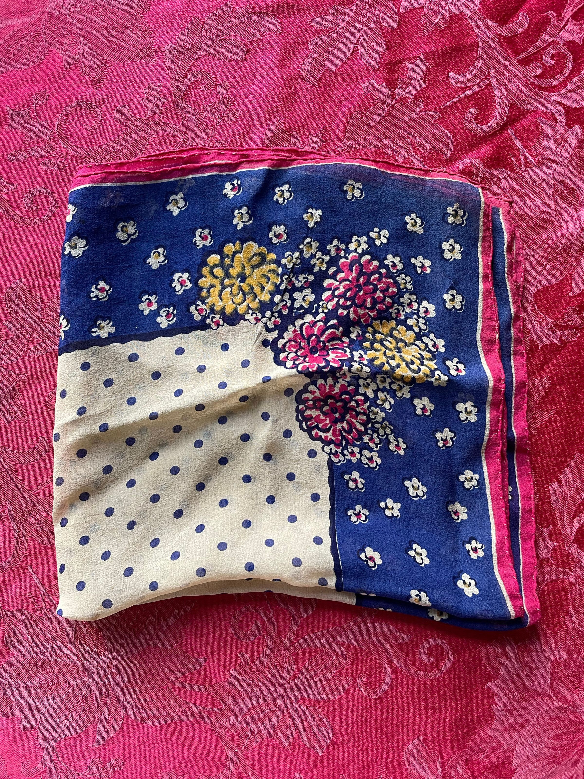 A multicolored polka dot patterned scarf with flower decorations lining the border.