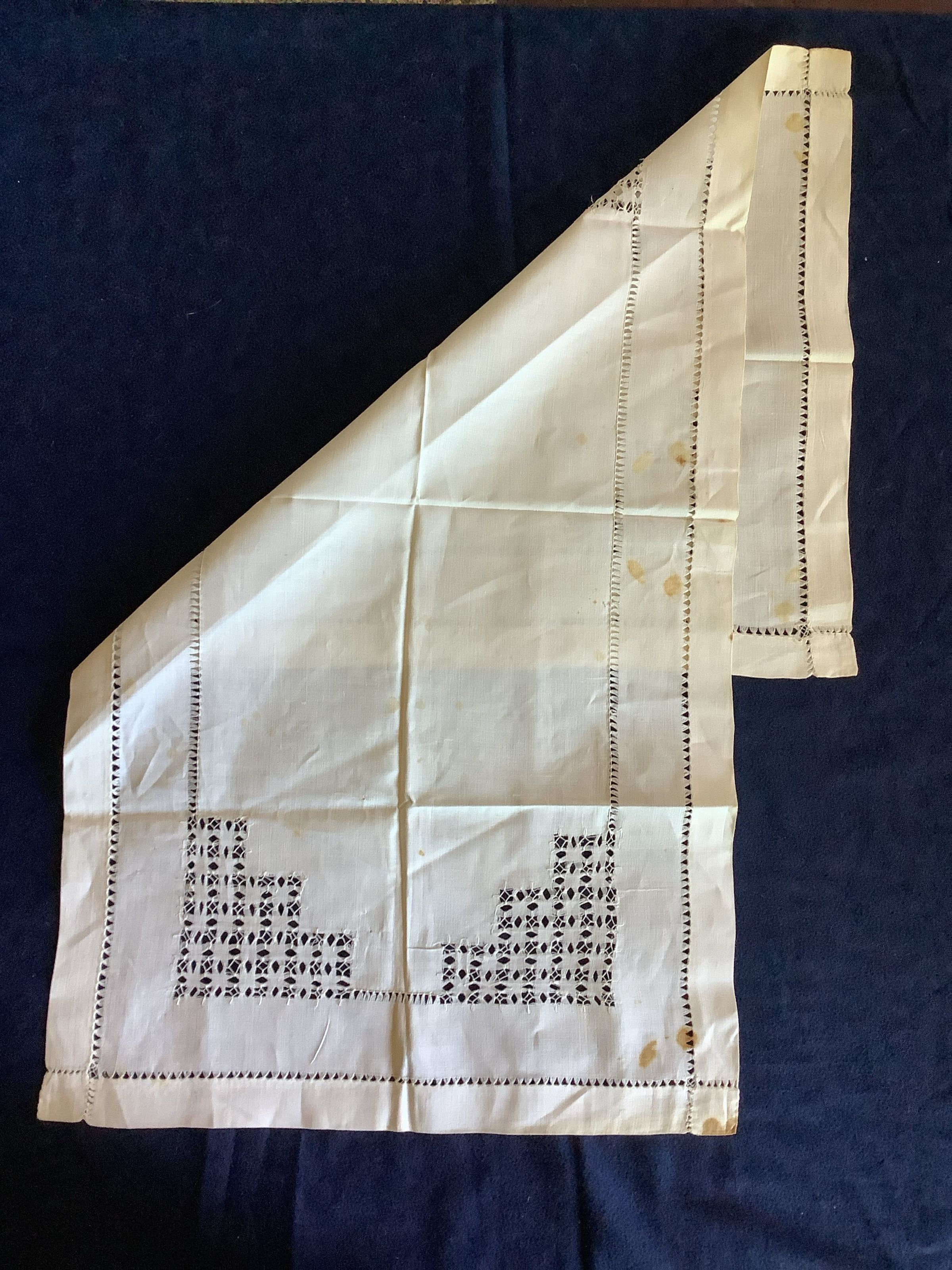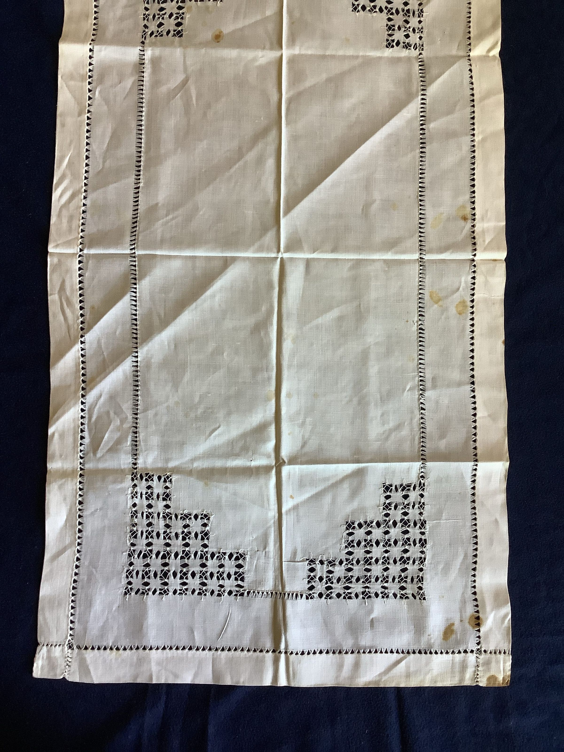 This is a rectangular decorative textile with a hemmed design. It has brown and yellow stains