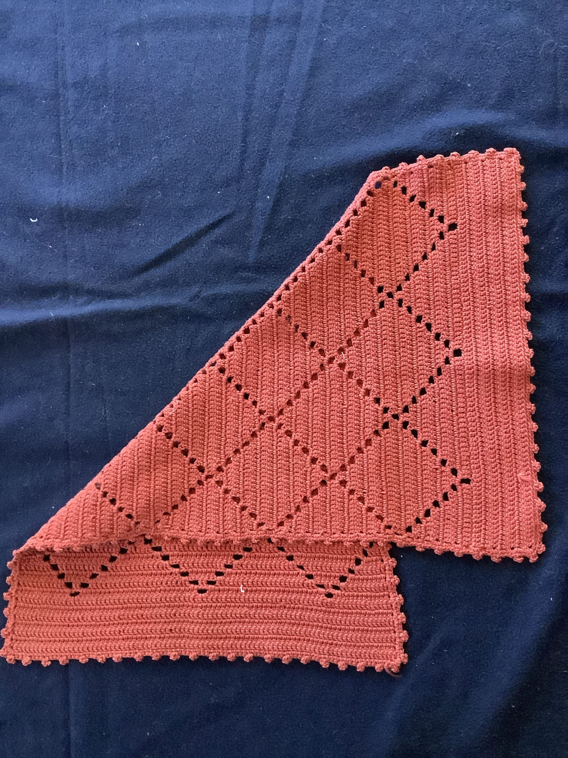 This is a crocheted textile in a rectangle shape, with a diamond design. It was possibly used as an antimacassar.