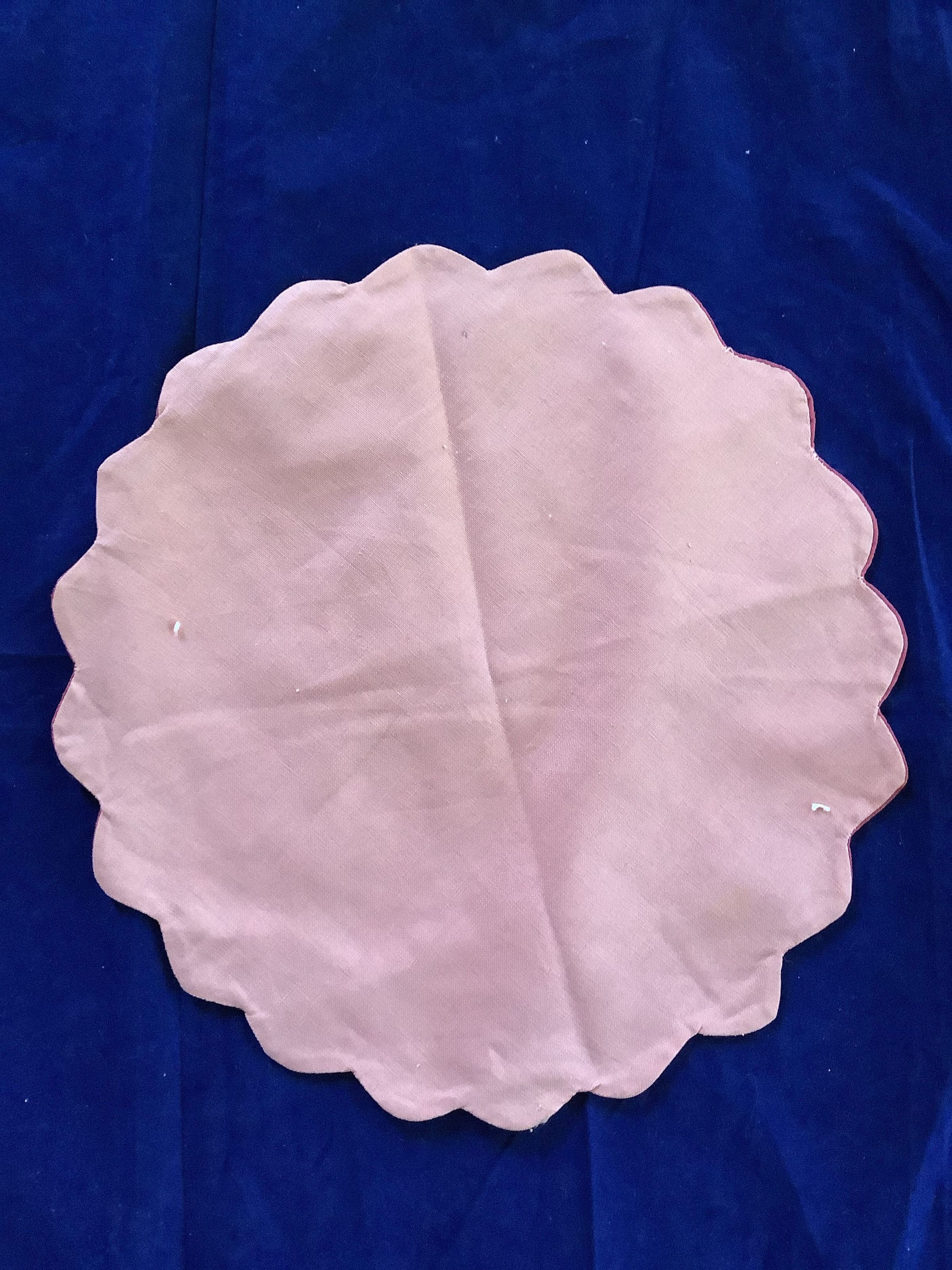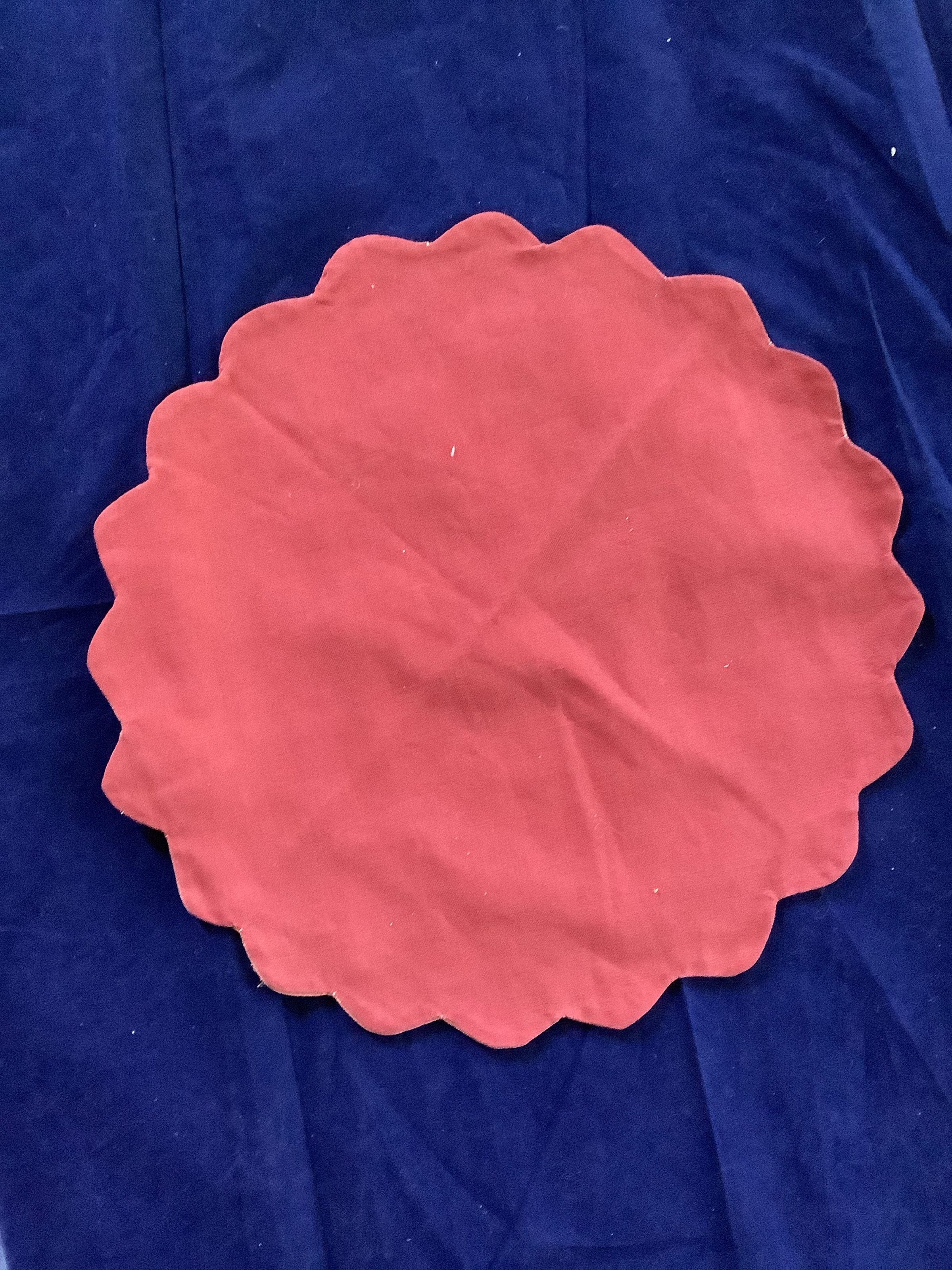 Placemat, dark red on red side and light red on the other. Scalloped edge, it consists of two fabrics sewn together.