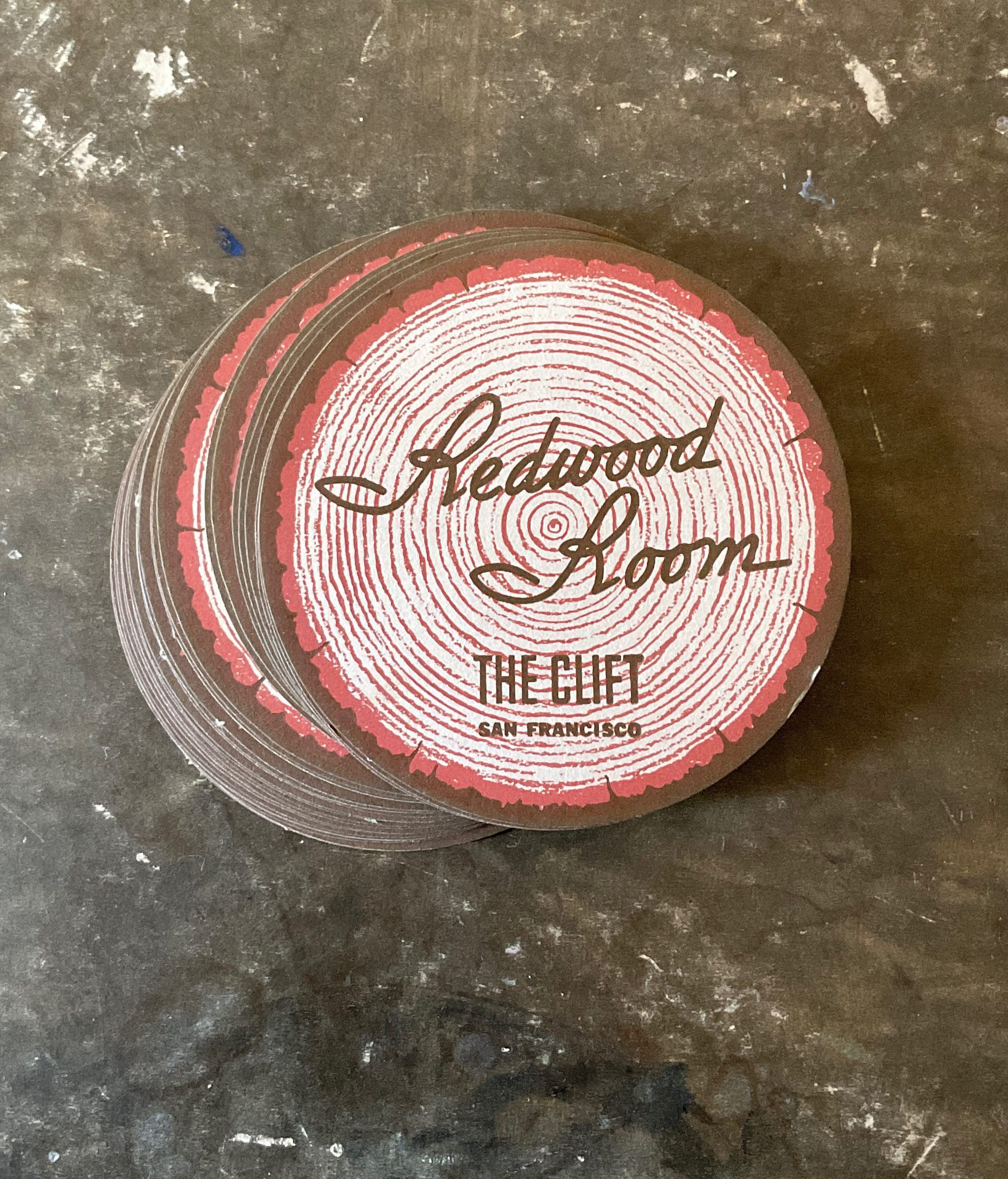 Coasters from the Redwood Room at the Clift Hotel in San Francisco. The coasters are made from a thick paper and are circular. The picture resembles what a trunk of a redwood tree looks like when cut. There are 29 coasters.Collection