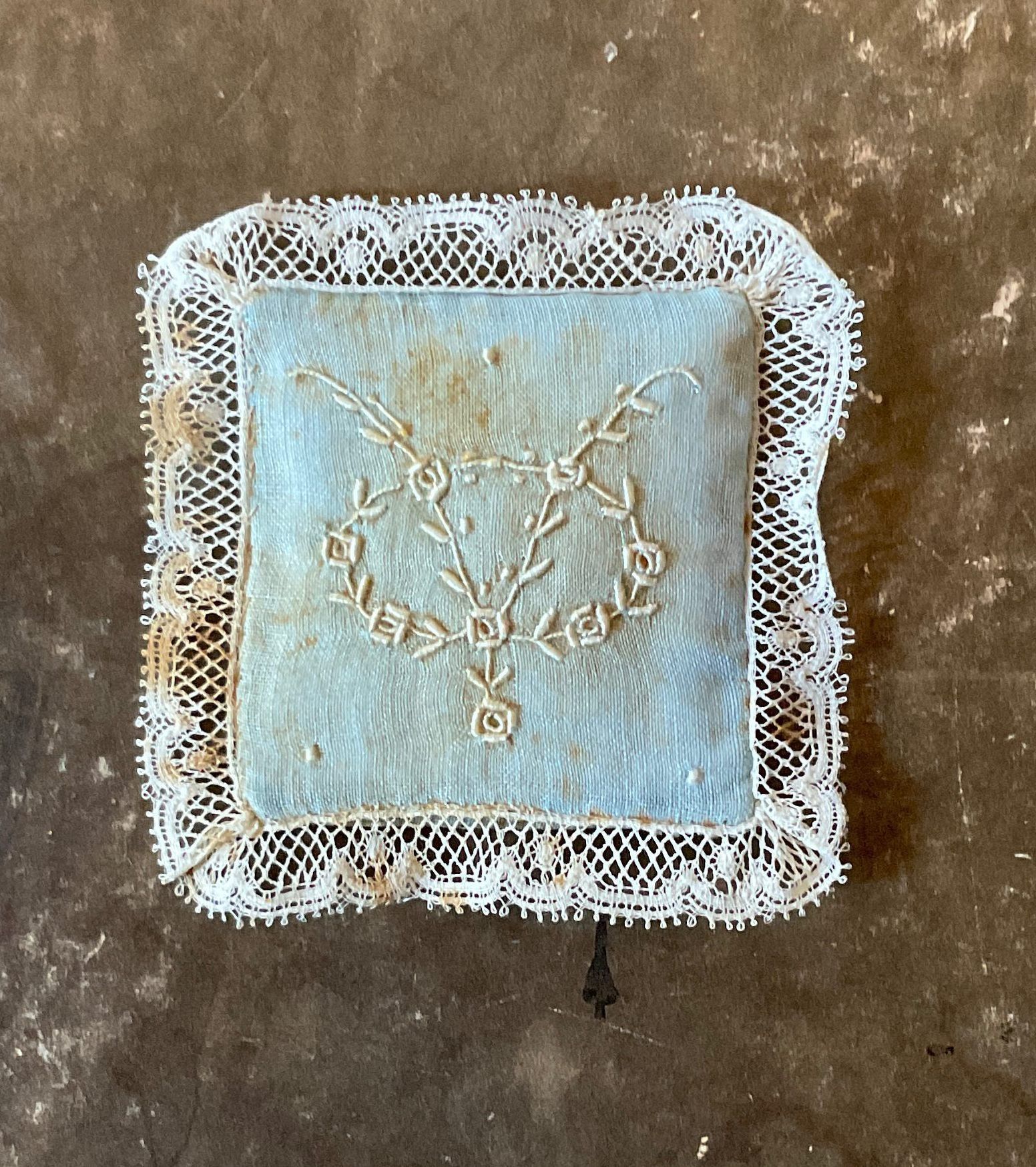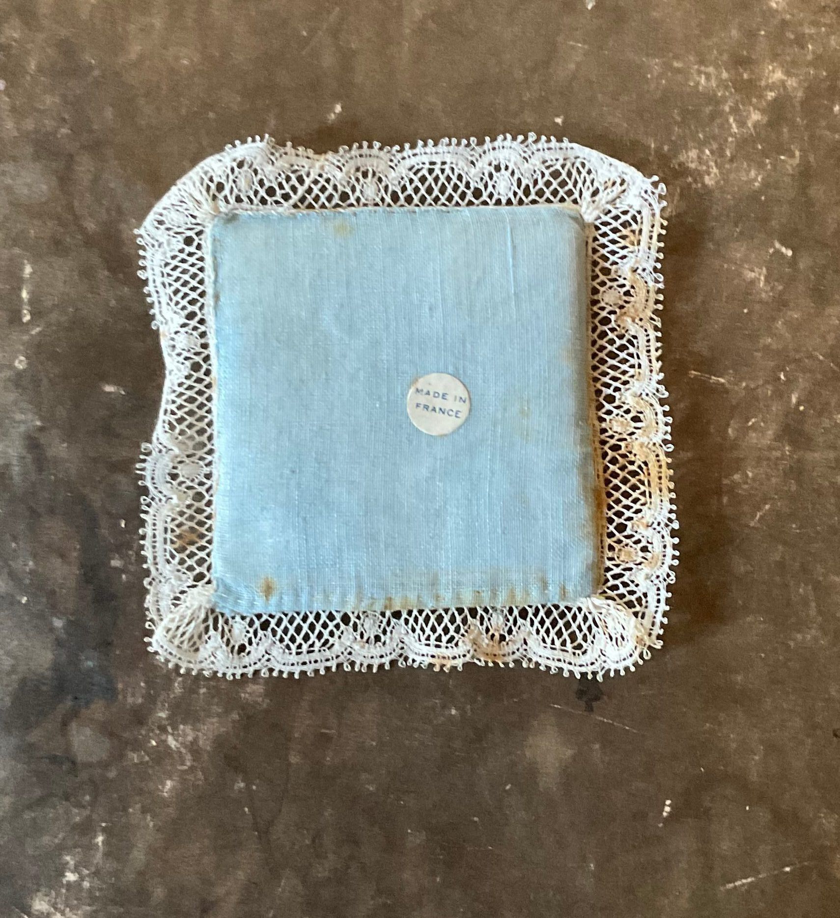 Blue embroidered sashay with a lace trim all around the border. The embroidery is of some flowers creating an oval and running through it more flowers creating the letter “v”. The embroidery pattern is at the center of the sashay. The back of the object is blue with a single sticker that reads “made in France”.Collection