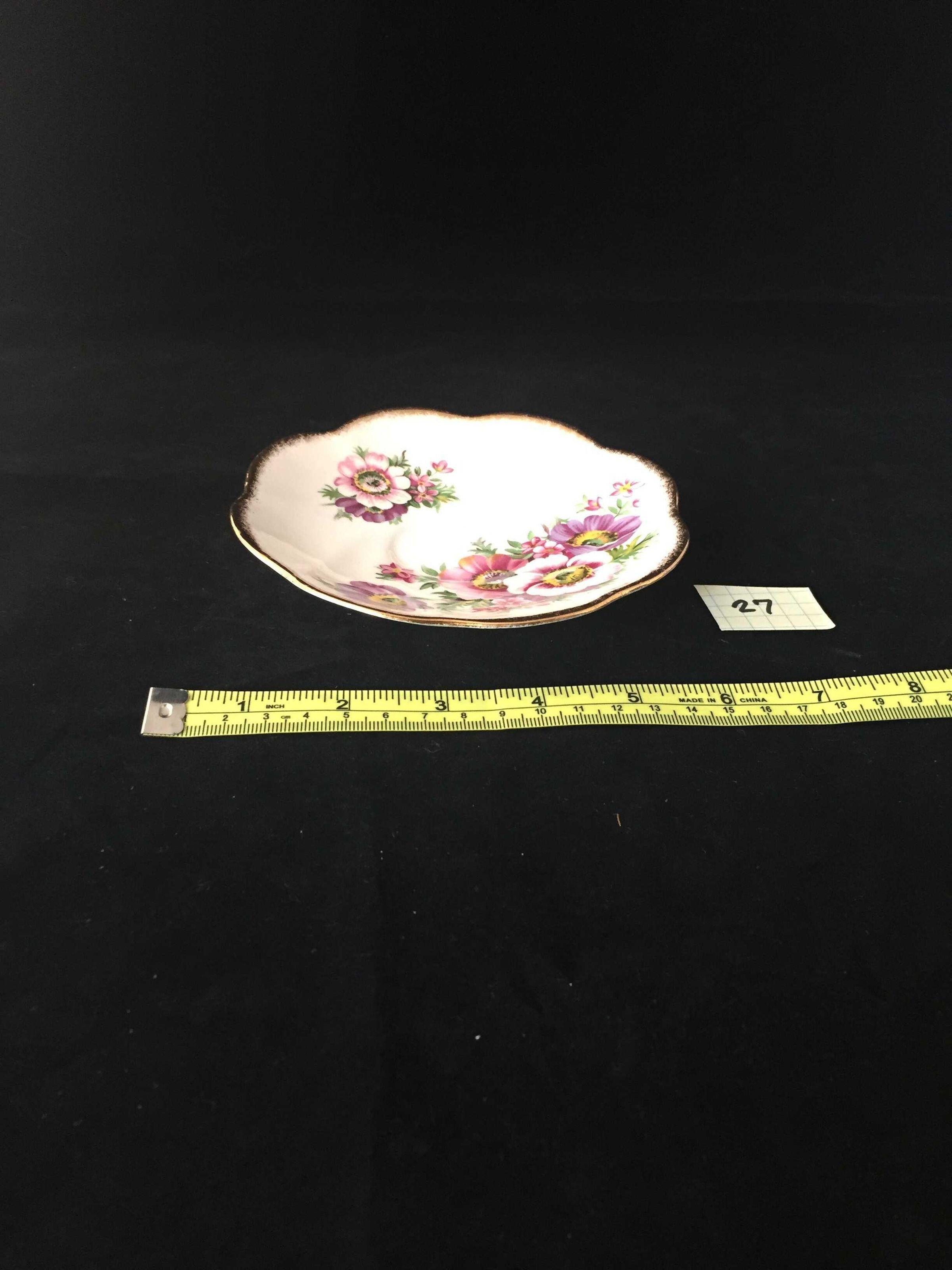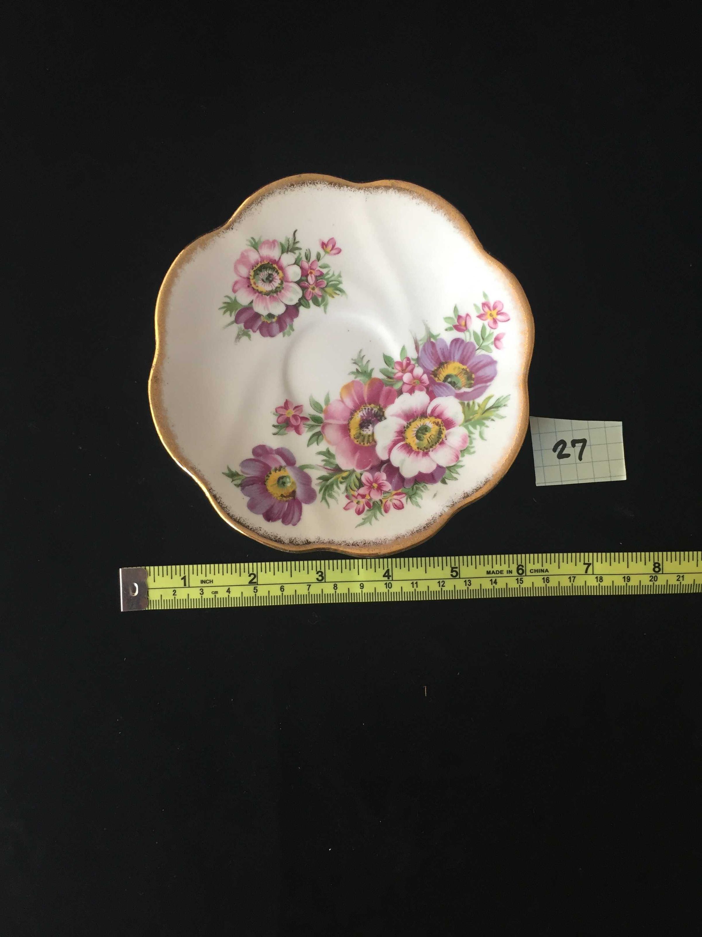 White base with blue, yellow and pink floral design, scalloped and gilded edge