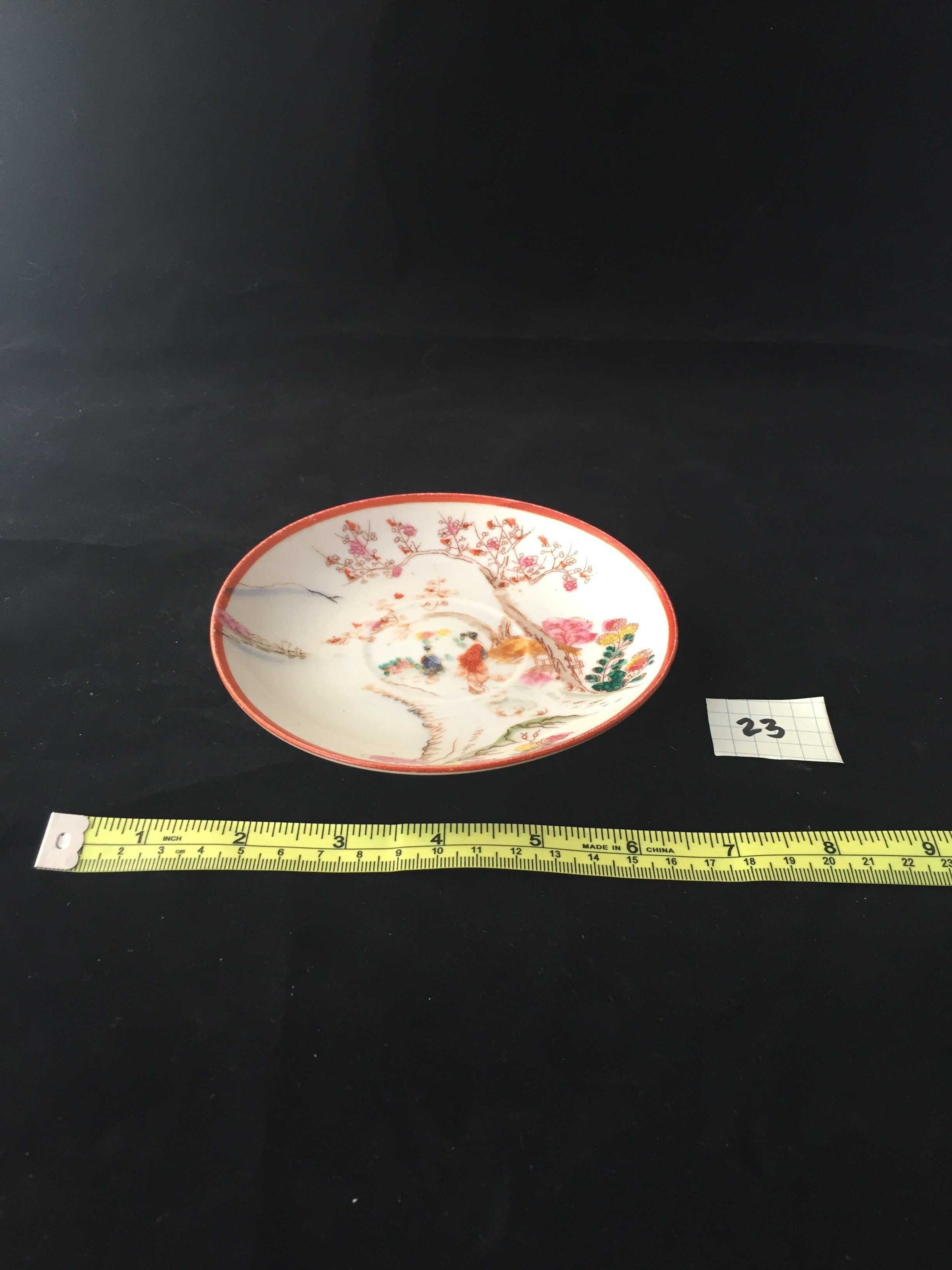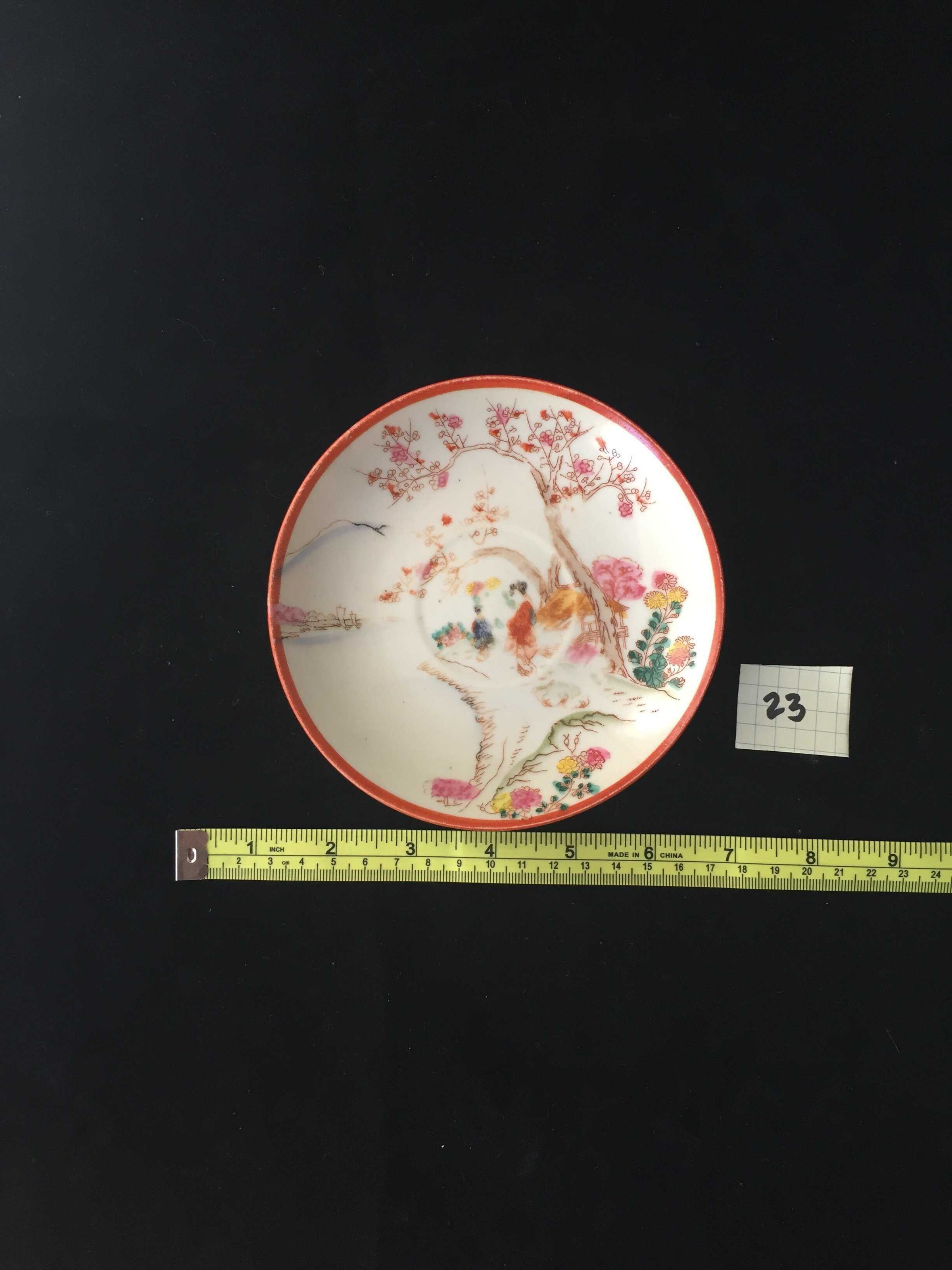 Green yellow, red and pink Asian style design, two female figures, garden, small house or hut, cherry blossom tree, pondCollection