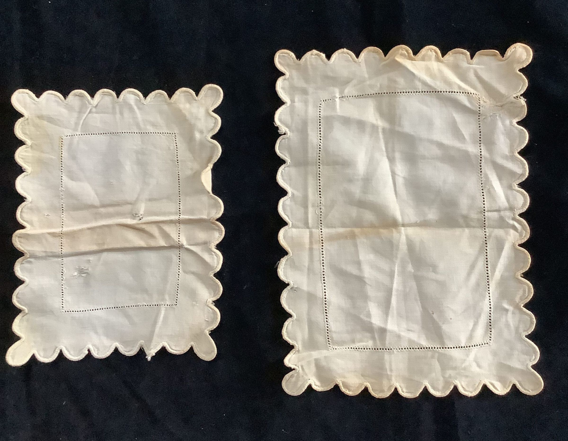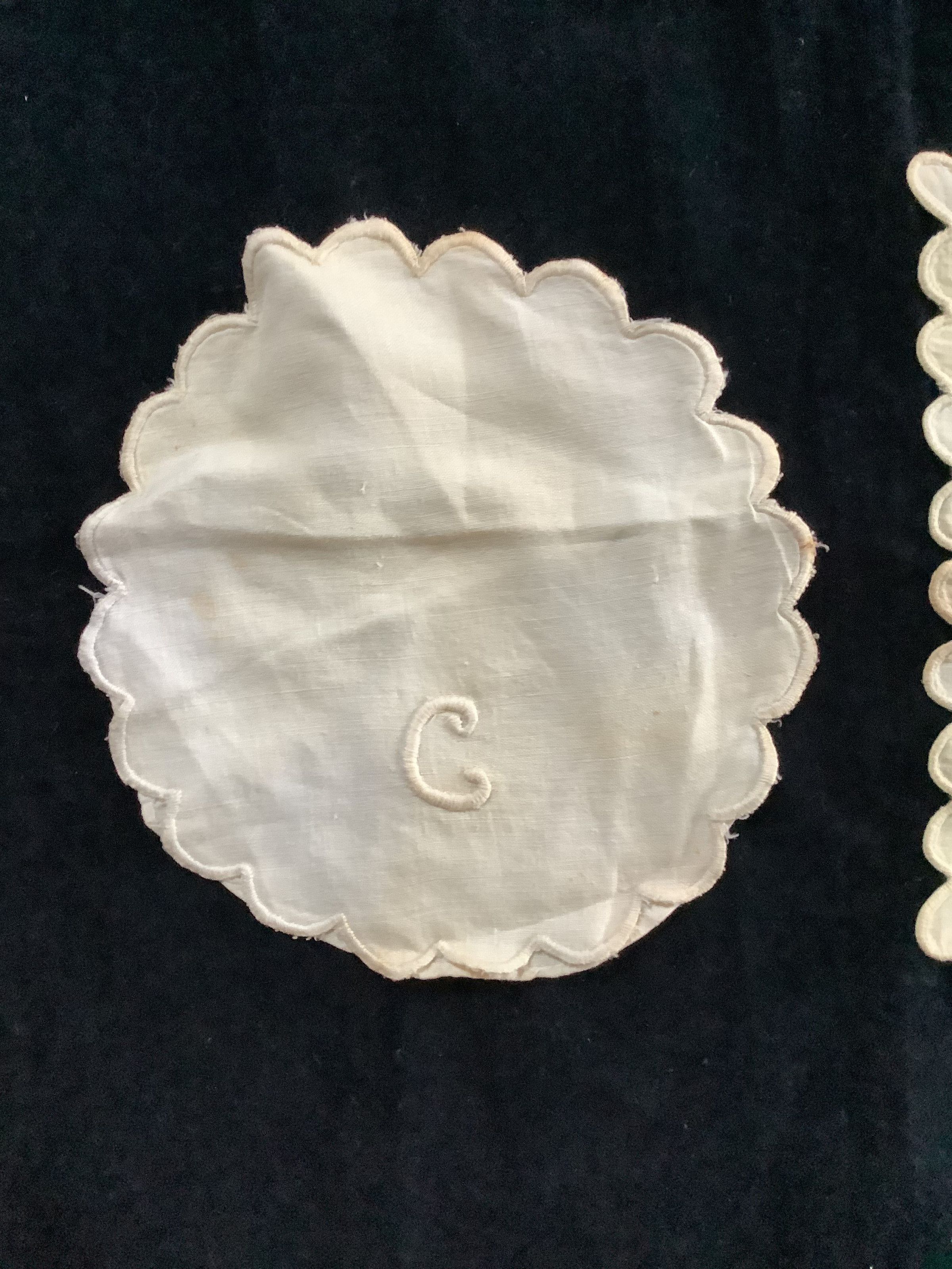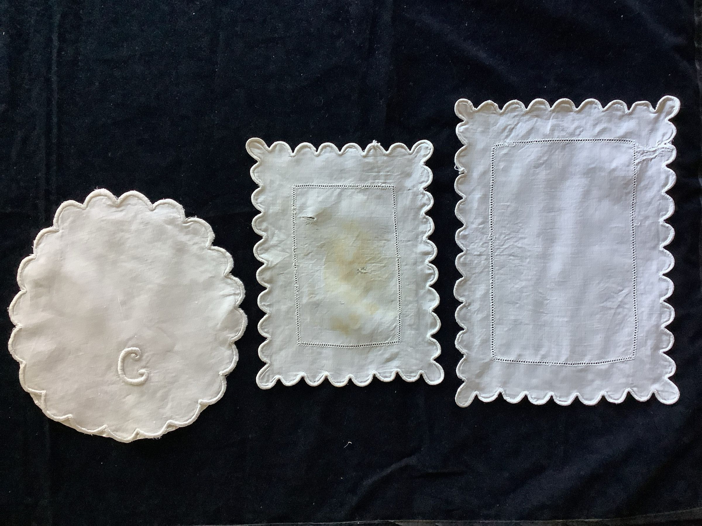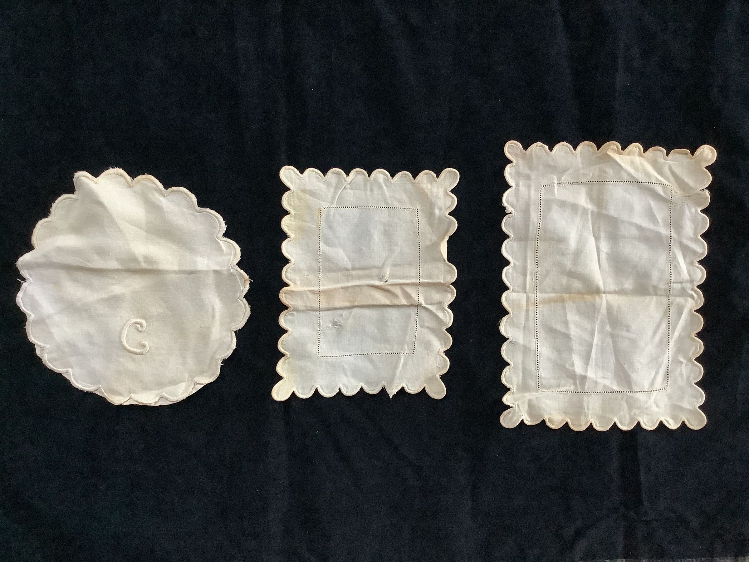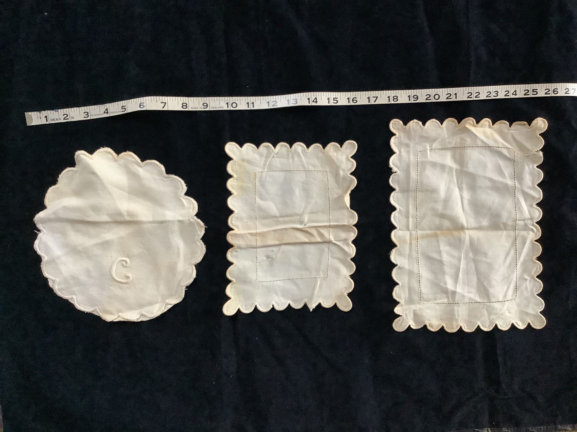 These are 3 scalloped edged handkerchiefs, two are square/rectangle shaped and one is circular with an embroidered “C.” All have folds and yellowing.Inscription/Signature/Marks