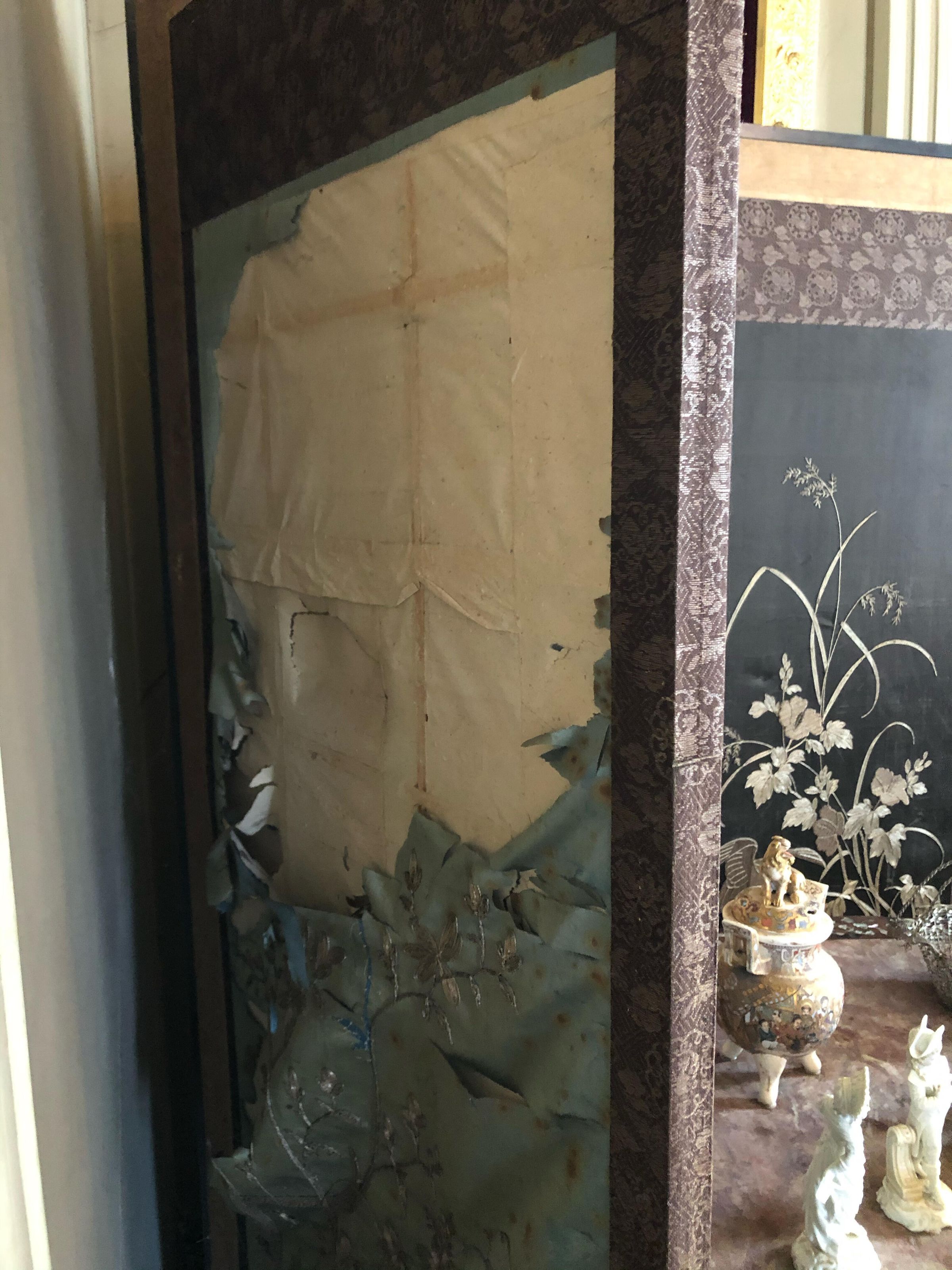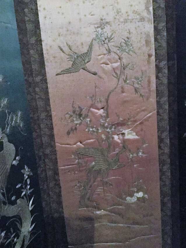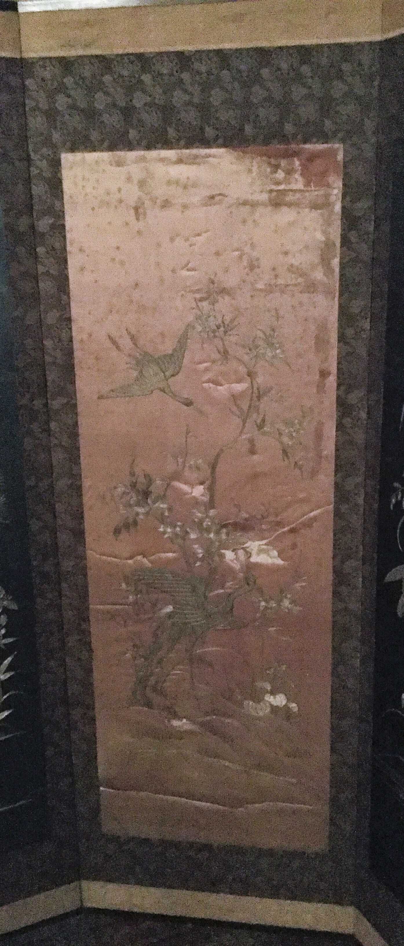 Silk screen, 4 panels, one severely damage, light blue, dark blue, black, and white backgrounds with different scenes of birds and plantsCollection