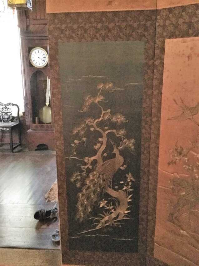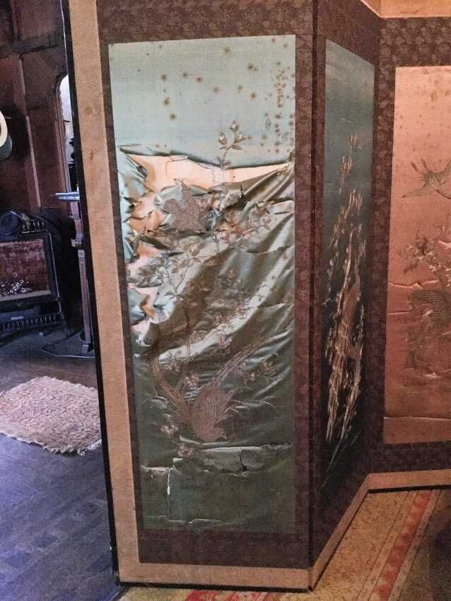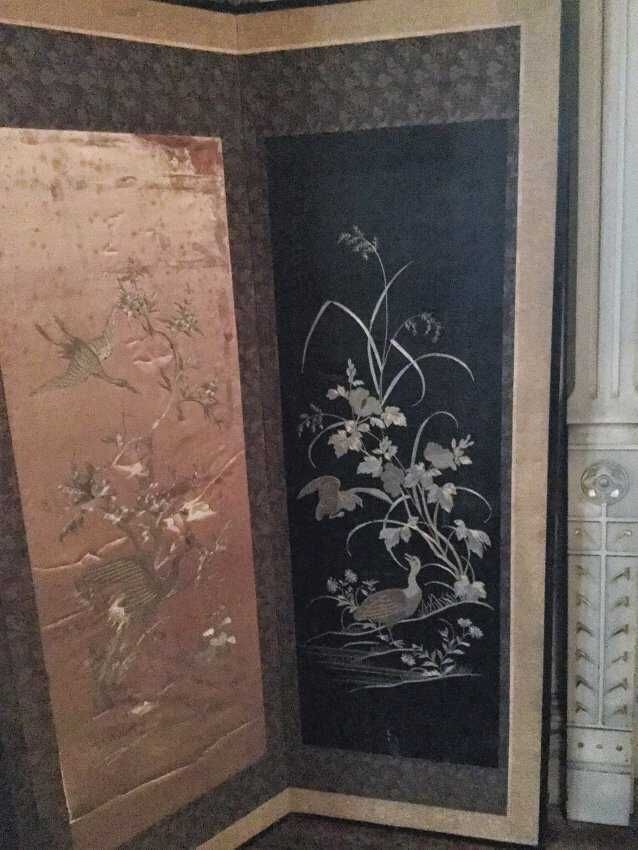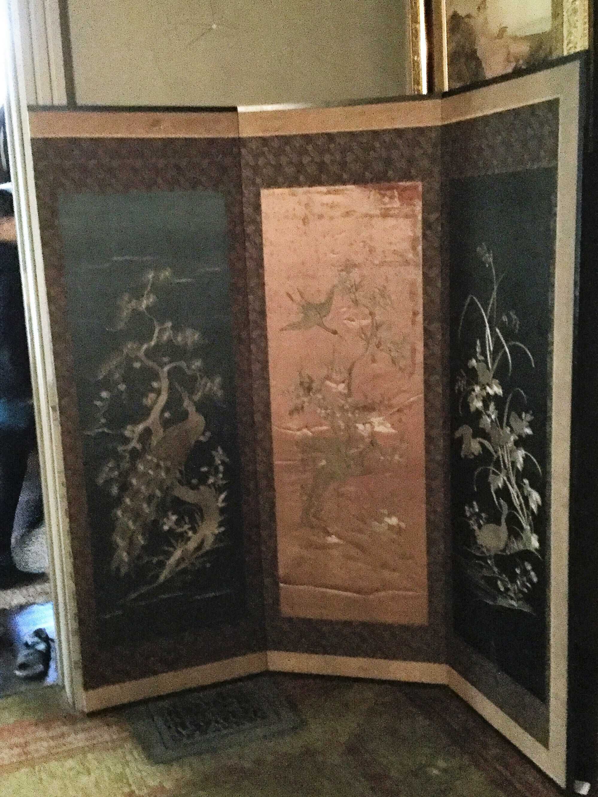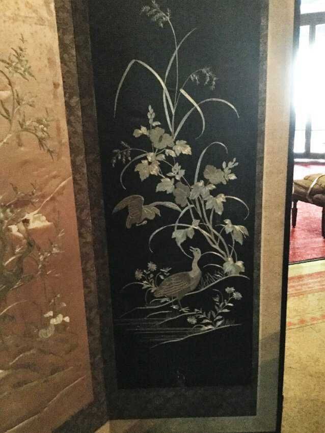 Silk screen, 4 panels, one severely damage, light blue, dark blue, black, and white backgrounds with different scenes of birds and plantsCollection