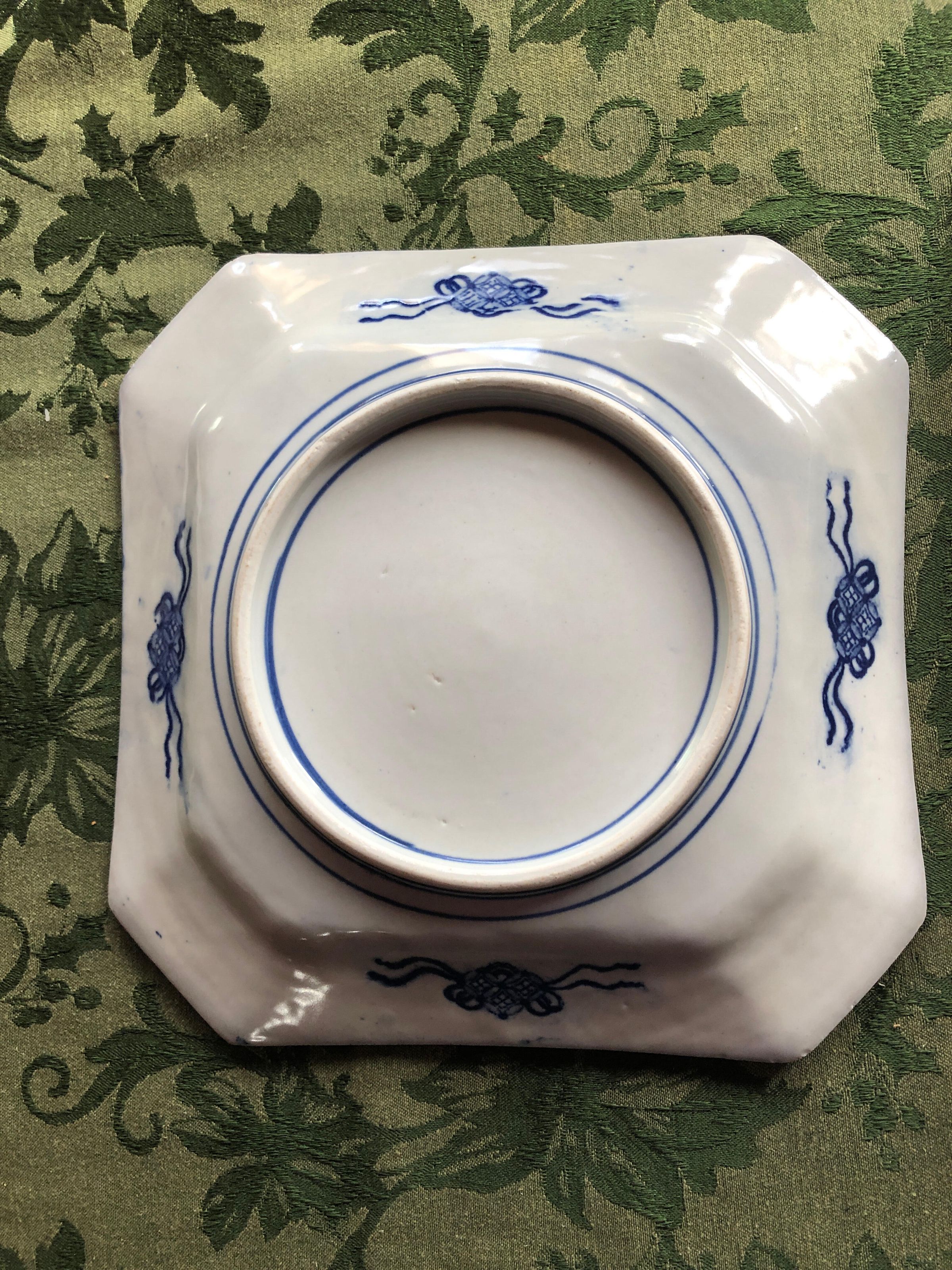 Octagonal shaped blue and white Asian-themed scenery painted in the center with hills, people and structures, framed with geometrical design, outer edges decorated with alternating sections of lattice pattern and scaled dragons. Bottom has four ribbon designs and blue outlined circles. No insignia.Create Date