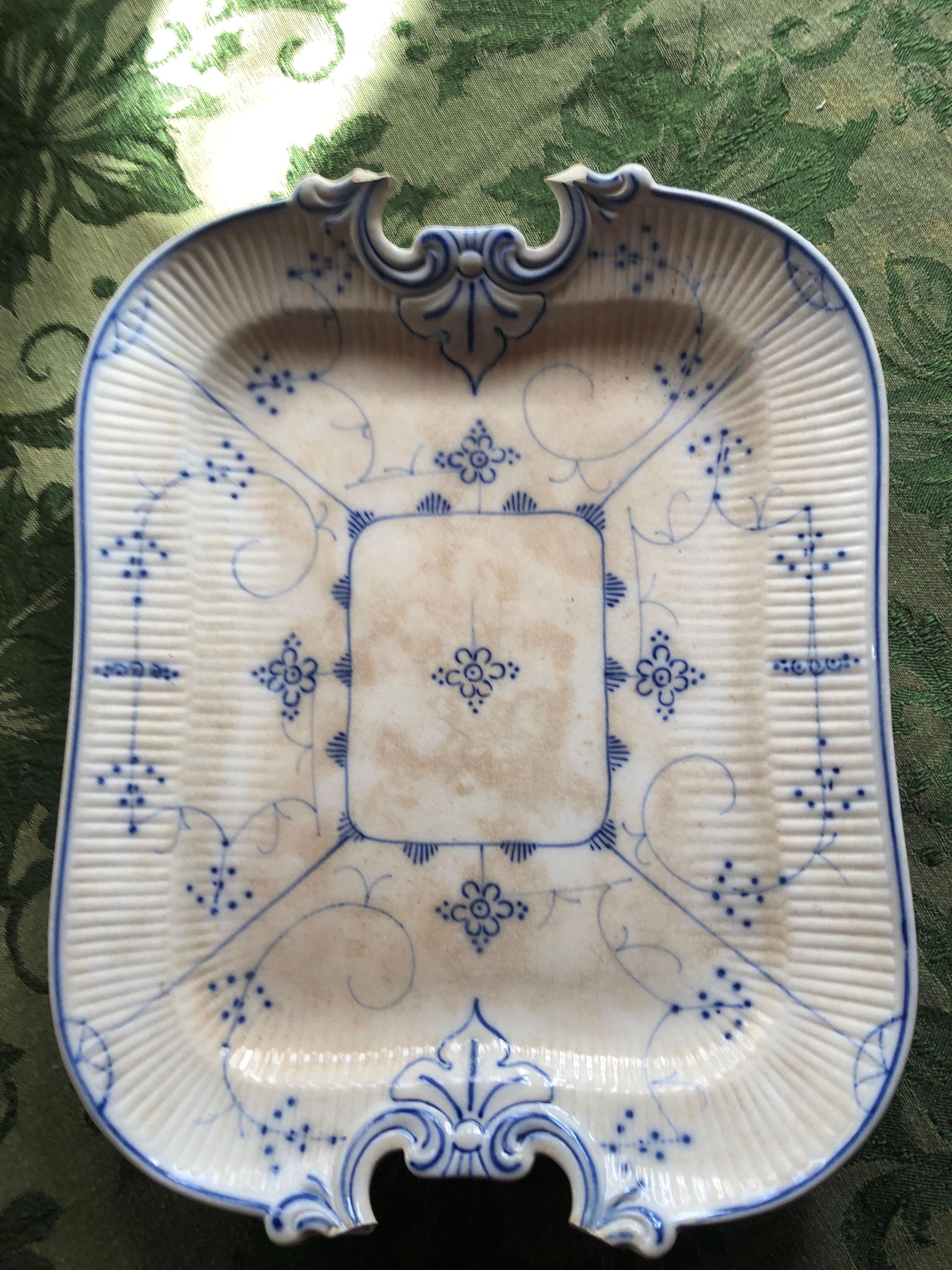 Rounded edge rectangular serving dish with textured ridges around the upper edge. White with blue geometric, floral and Fleur de Lis design. Handles are broken off.Inscription/Signature/Marks