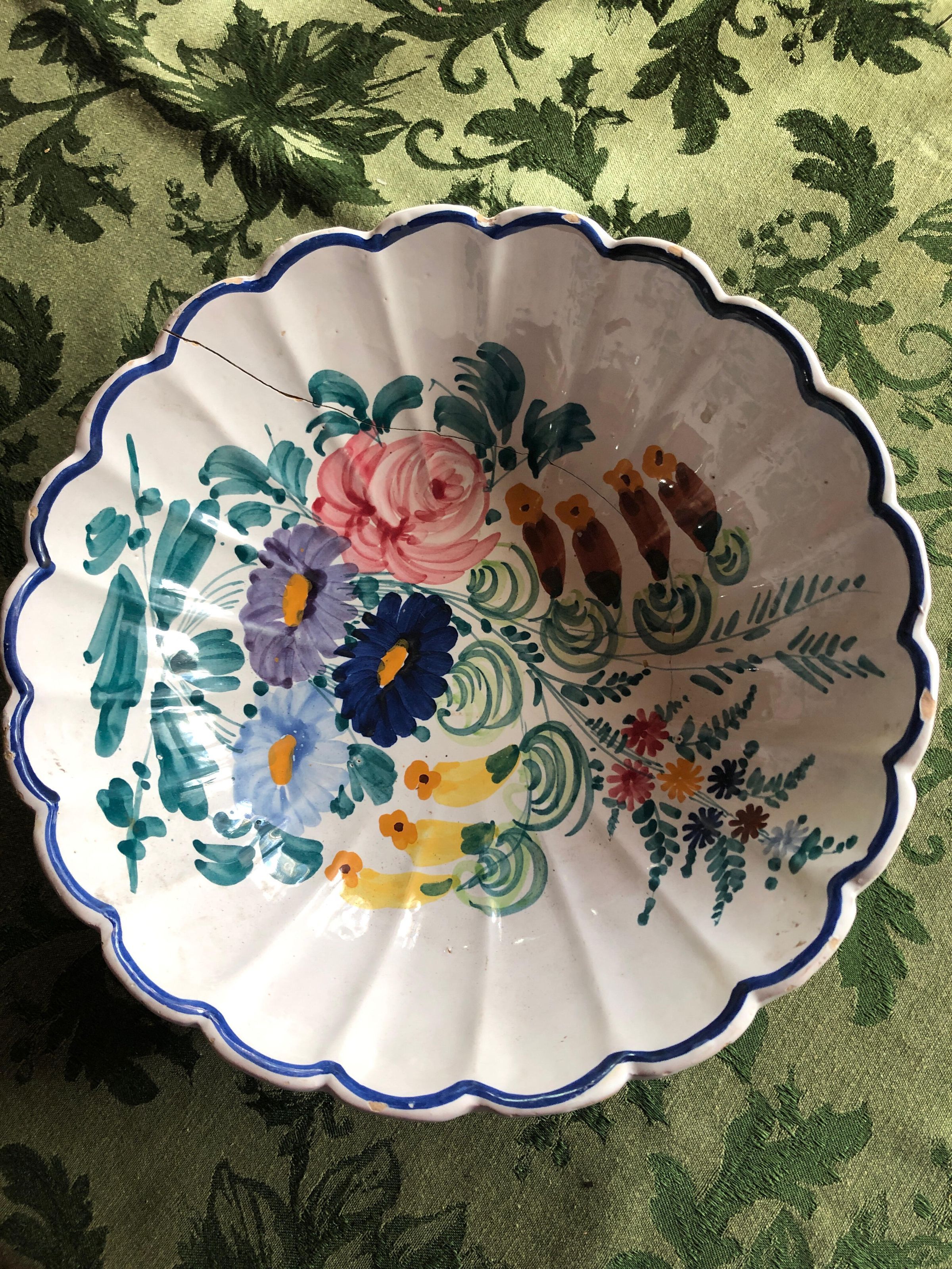 White bowl shaped dish with scalloped edges painted with one blue line, hand-painted multicolored flowers in the center.Inscription/Signature/Marks
