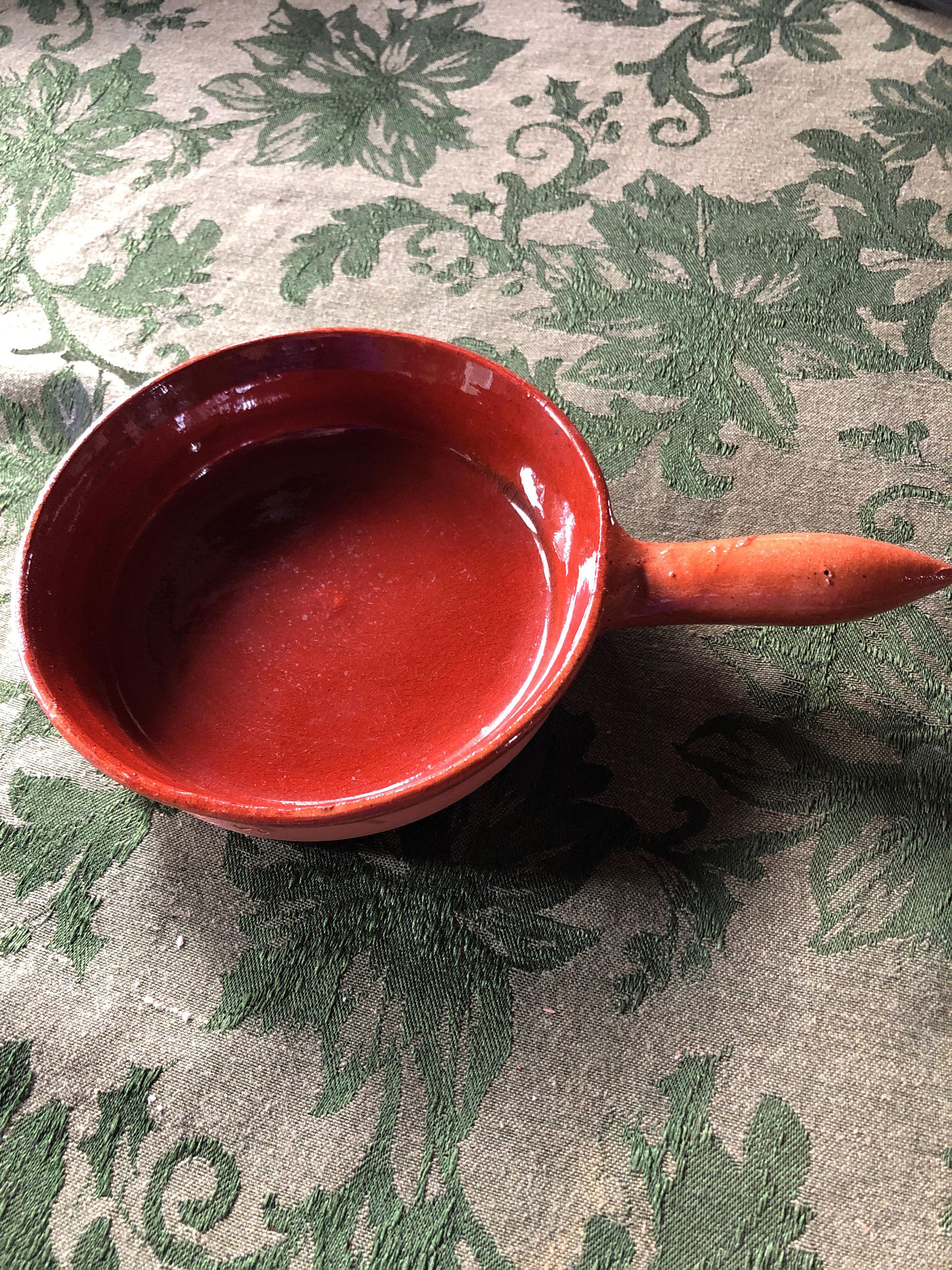 Red glazed round single handled serving dish.