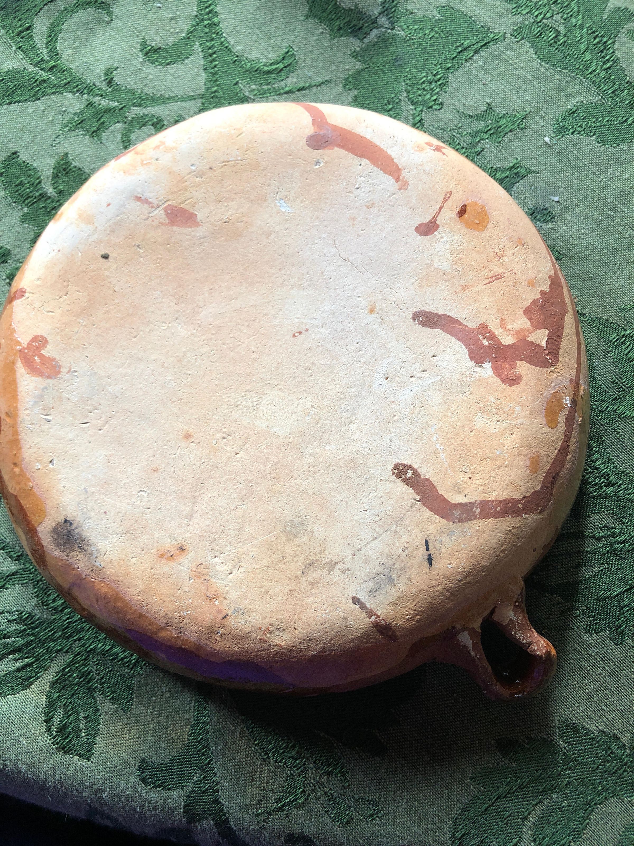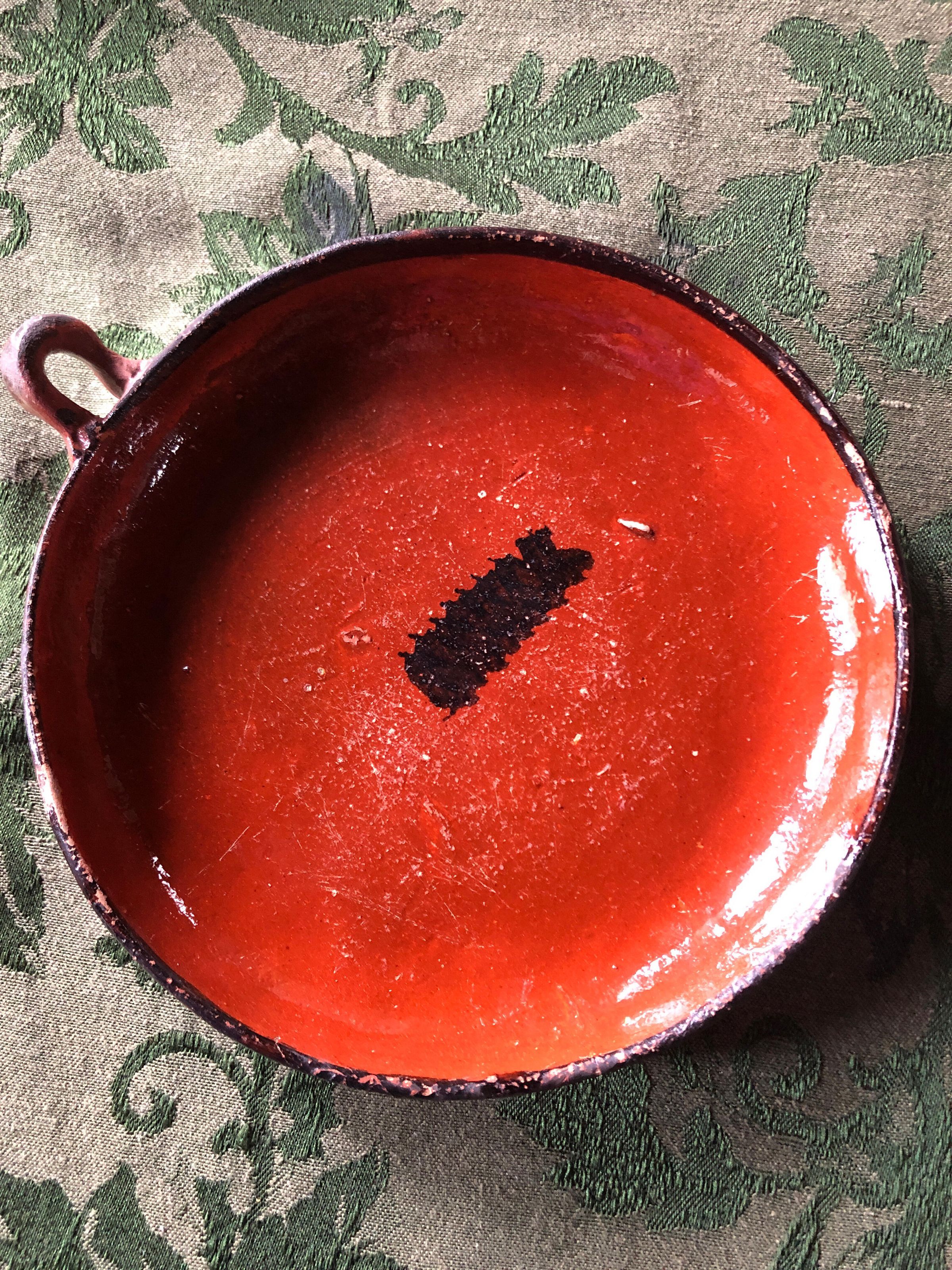 Red glazed ceramic dish, round, with black painted along outer edge and black abstract scratching in the center. Small handles on opposing sides of dish.Create Date