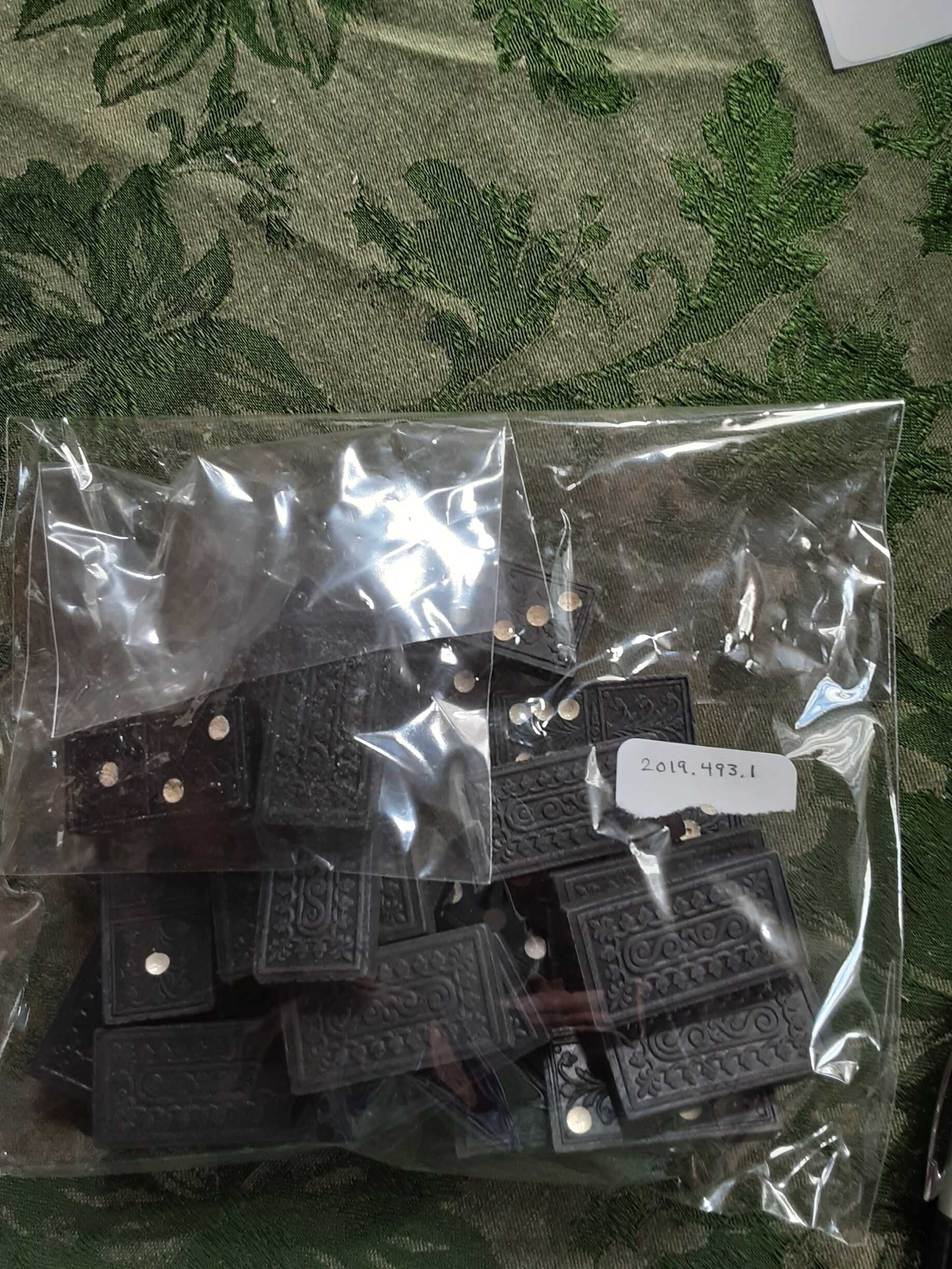 Set of black dominoes with white dots, back edges are decoratively stamped with swirls and leaves