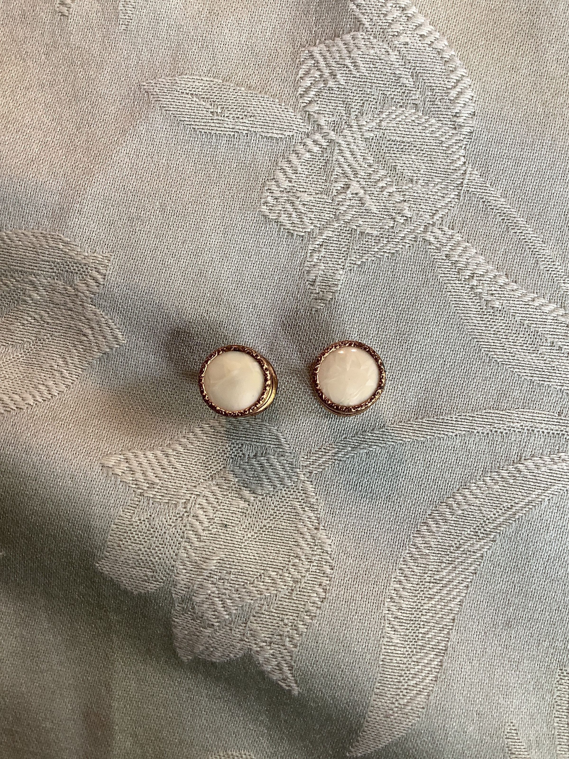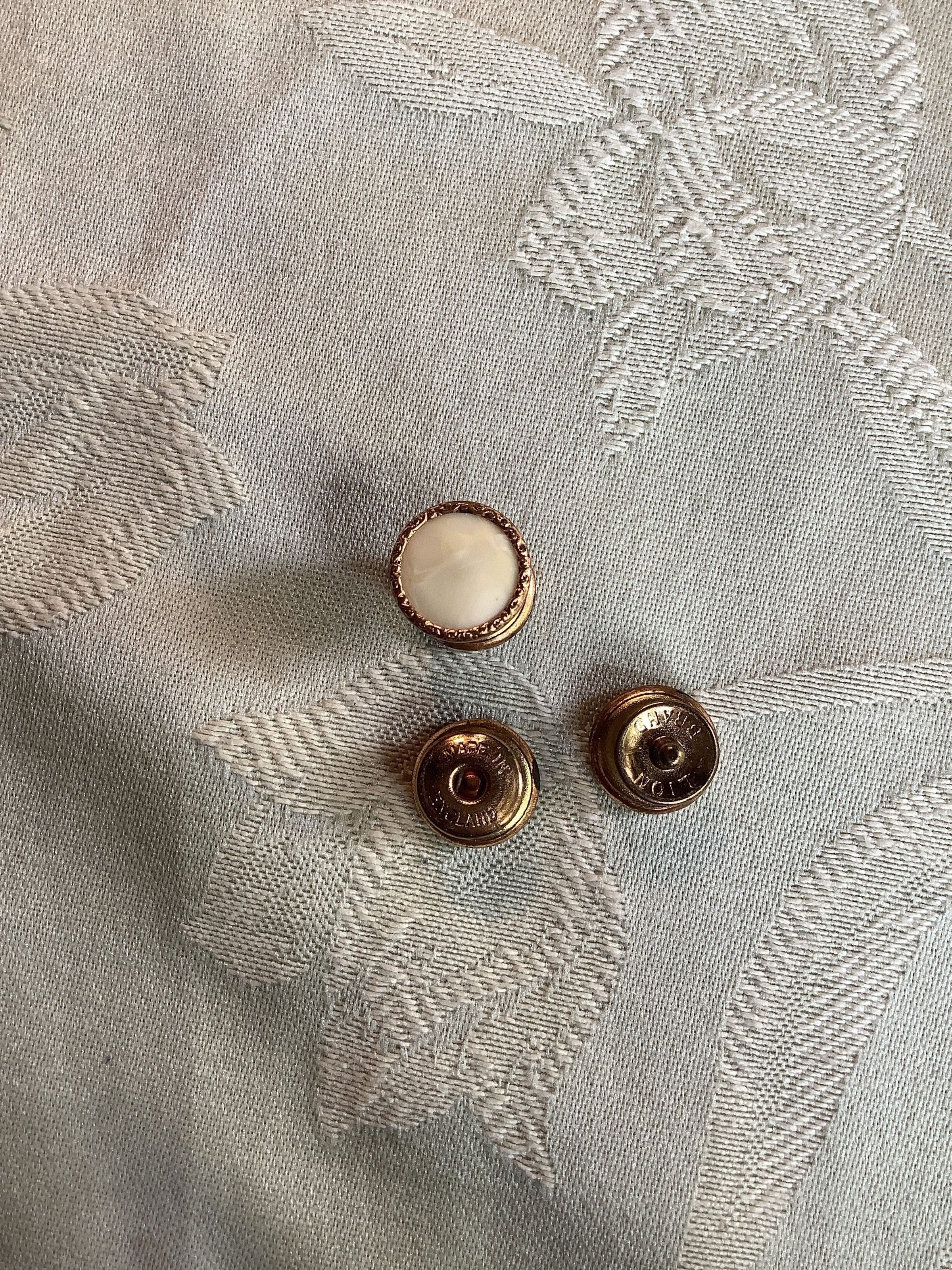 Set of gold with mother of pearl plated snap cuff links, probably from 1910-1930s. These are Lion Brand, made in England.Collection