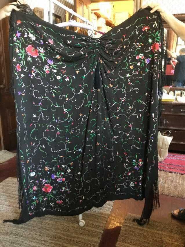shawl, black silk, embroidered flower-, abstract, square, knotted fringe trim, fringe 14.5 rouched at neckCollection
