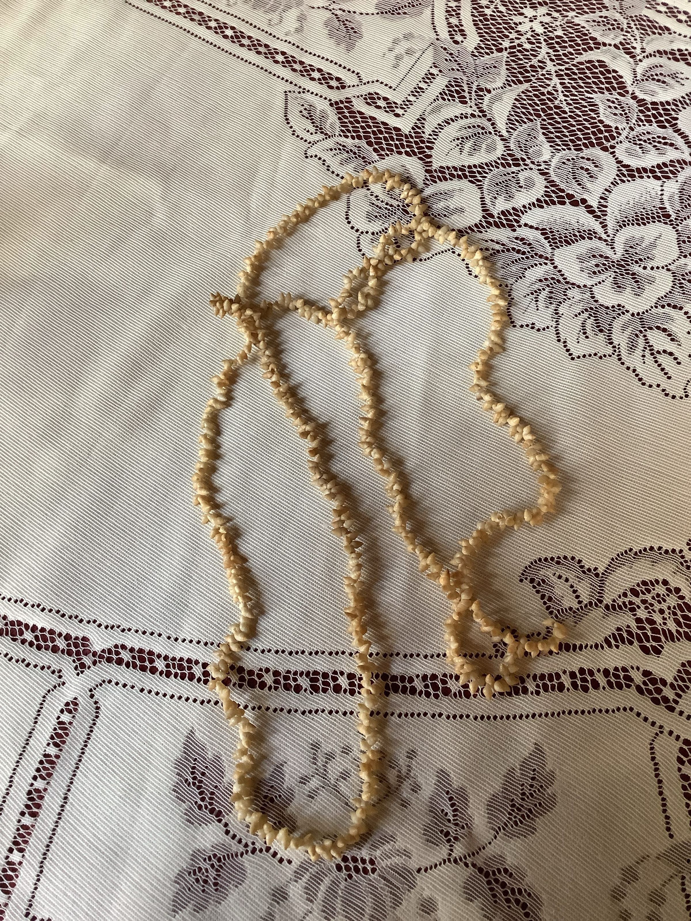 Long necklace made out of a single strand of tiny, beige colored shells.