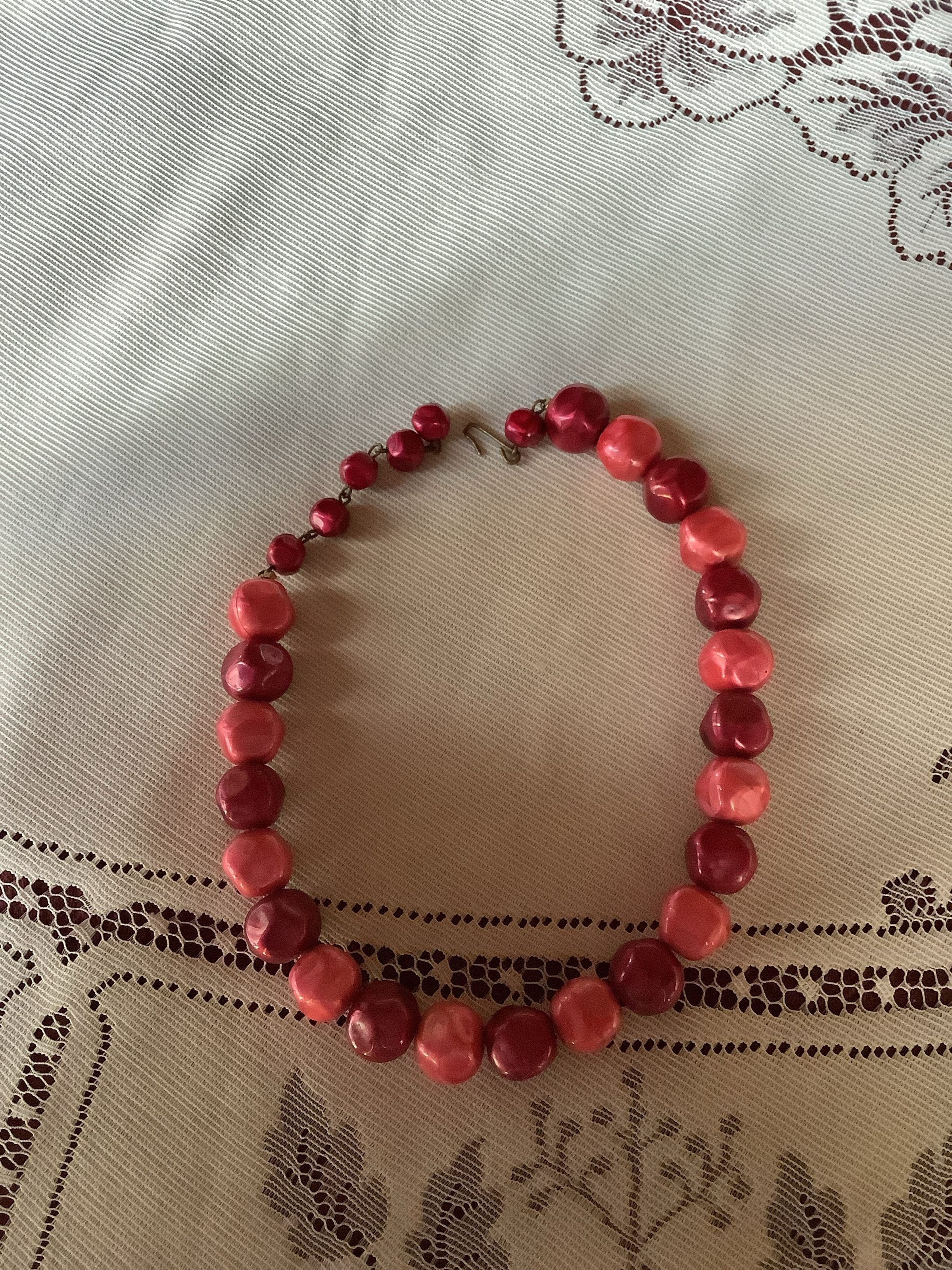 A short necklace with alternating pink and ruby colored, irregularly shaped round beads. A hook clasp connects to a row of smaller beads and metal loops on the end. Likely 1950s style.Collection