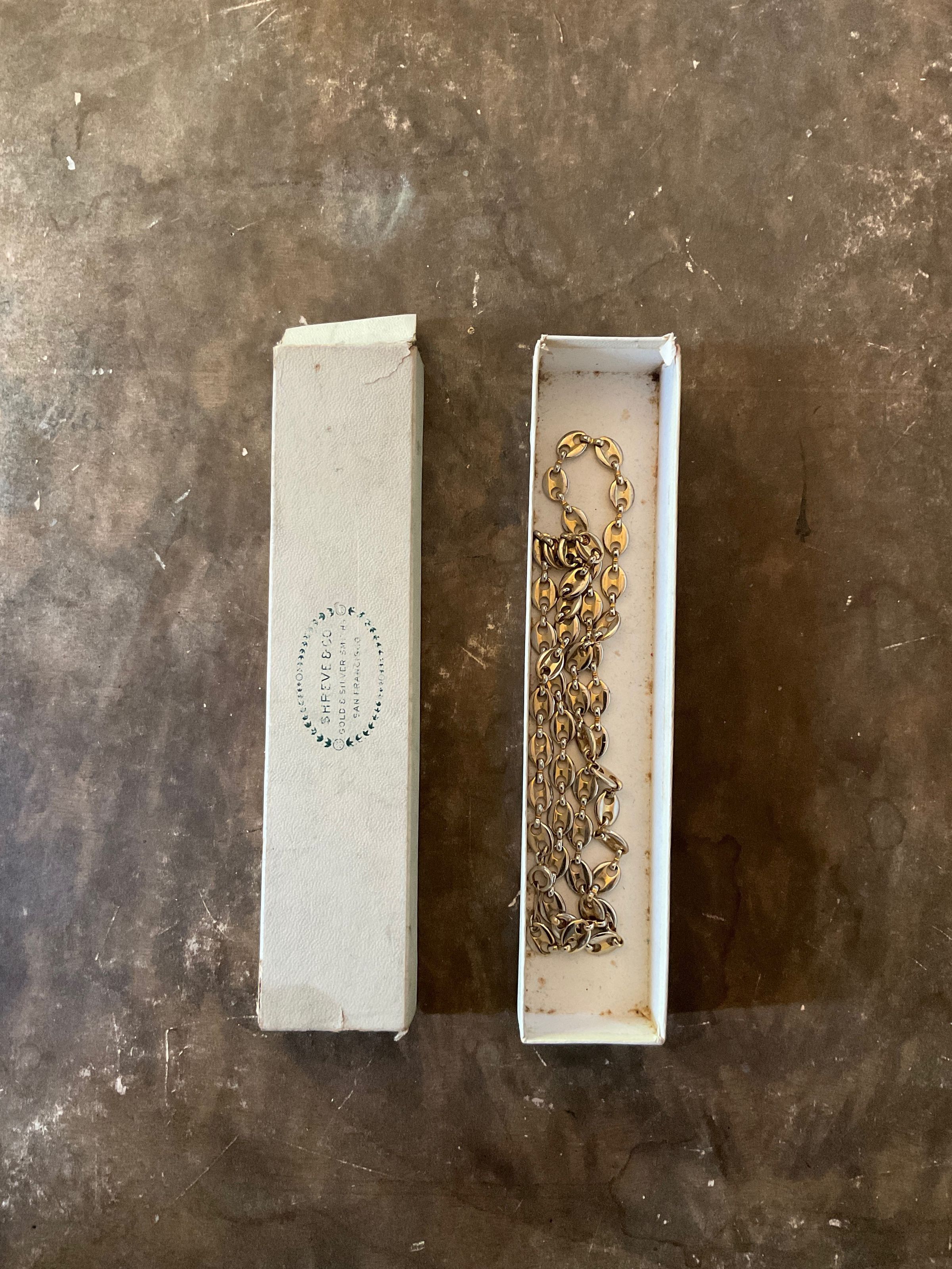 Shreve & Co gold necklace. The necklace is stored in a Shreve & Co box.