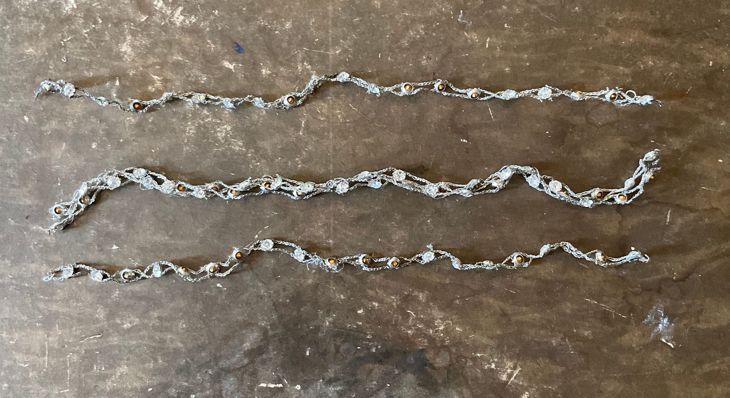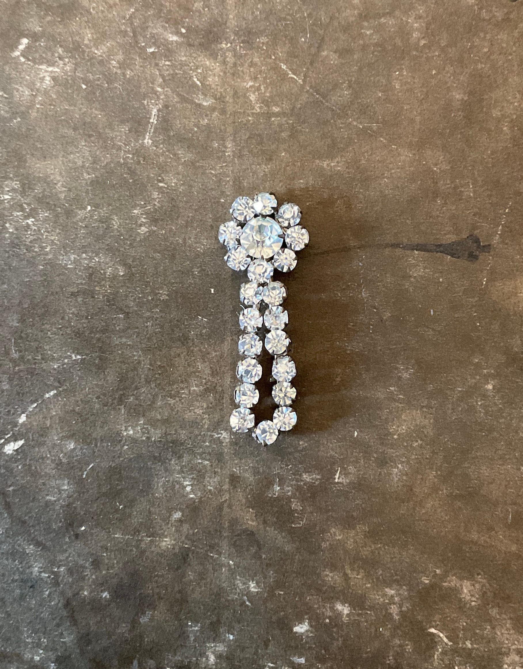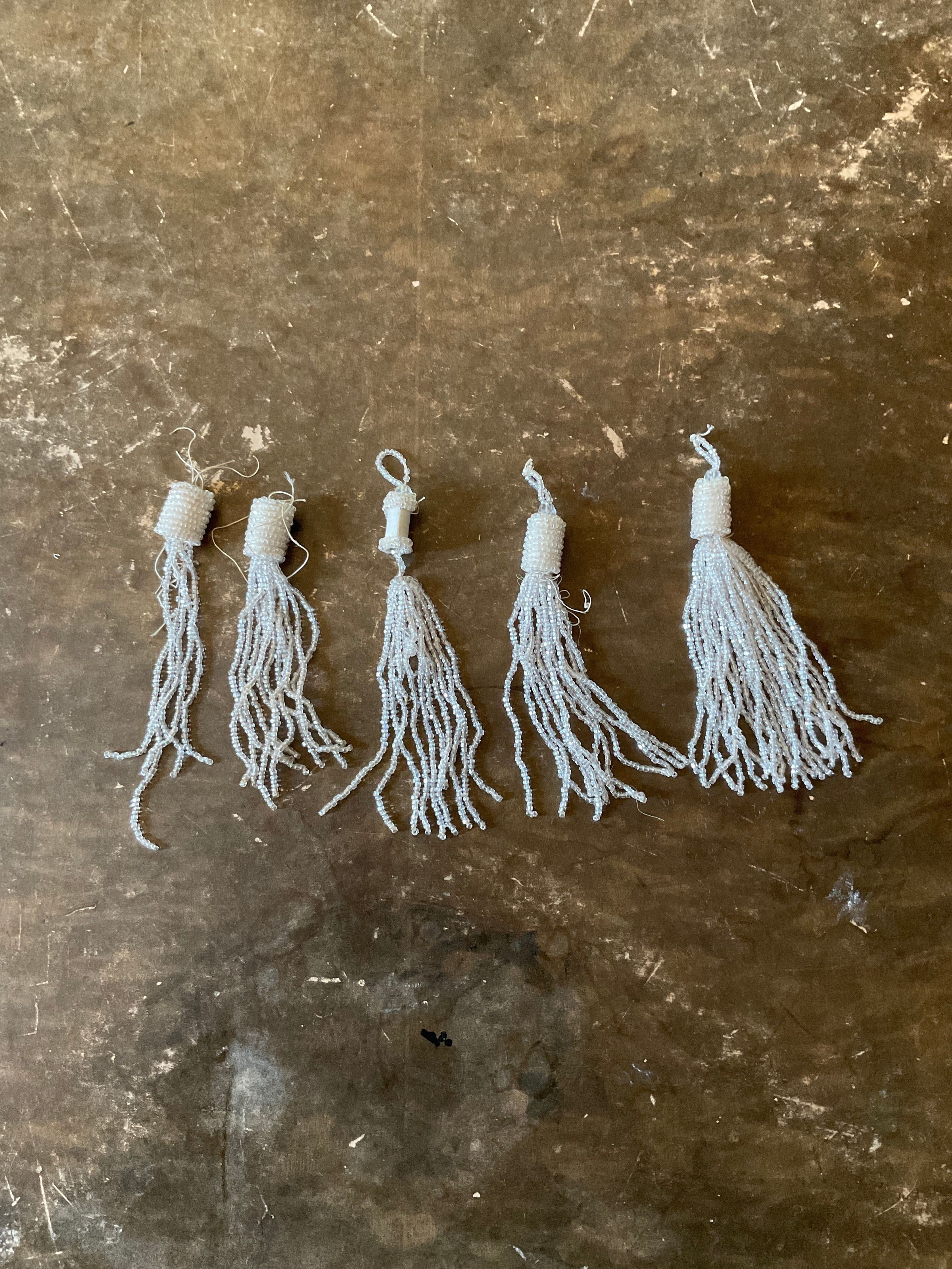 A Shreve & Company box filled with various small pieces of jewelry. There are five white beaded tassels. There are 3 braided silver strands with jewels intertwined. There is a flower made out of jewels. There are several loose beads a jewels in the box.Collection
