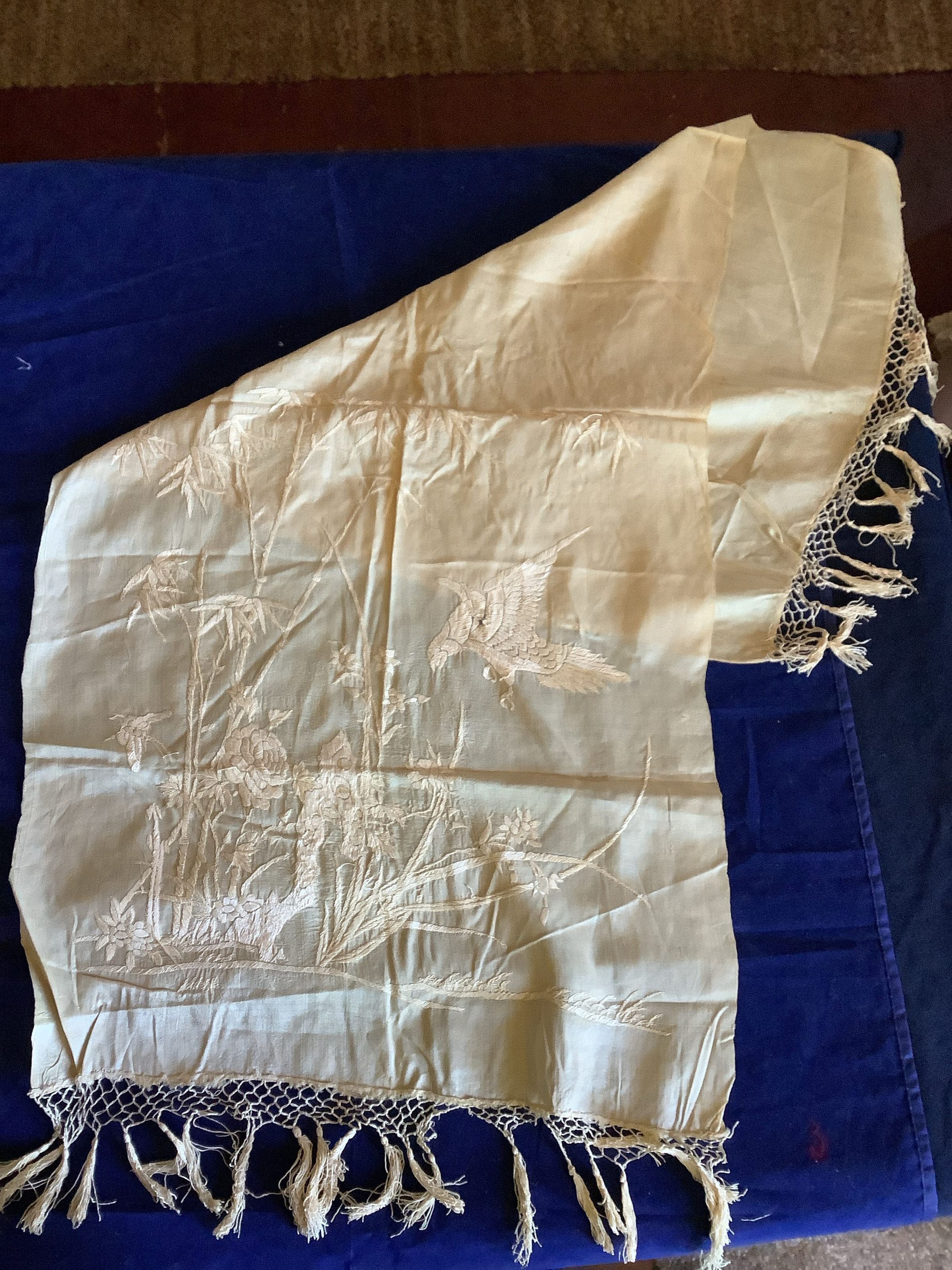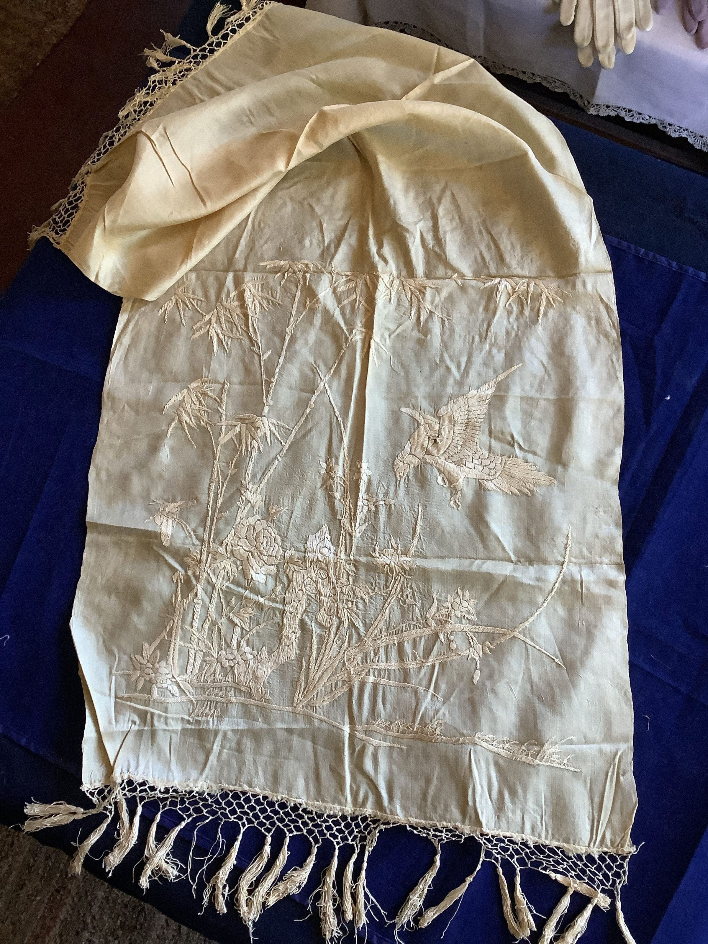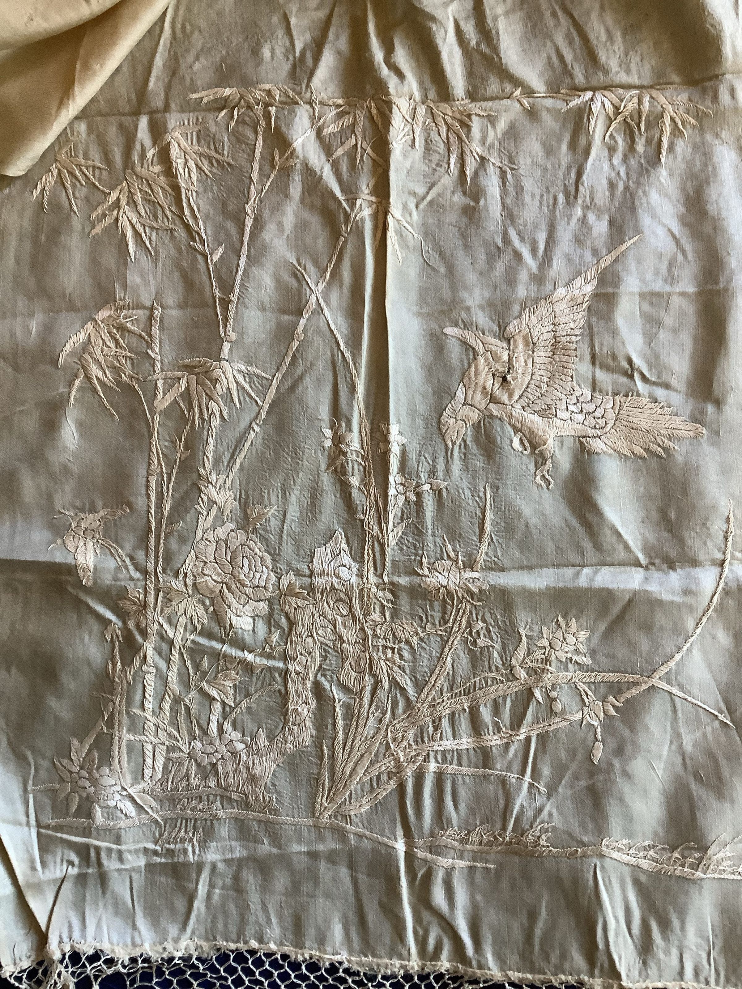 A silk textile embroidered with silk thread.