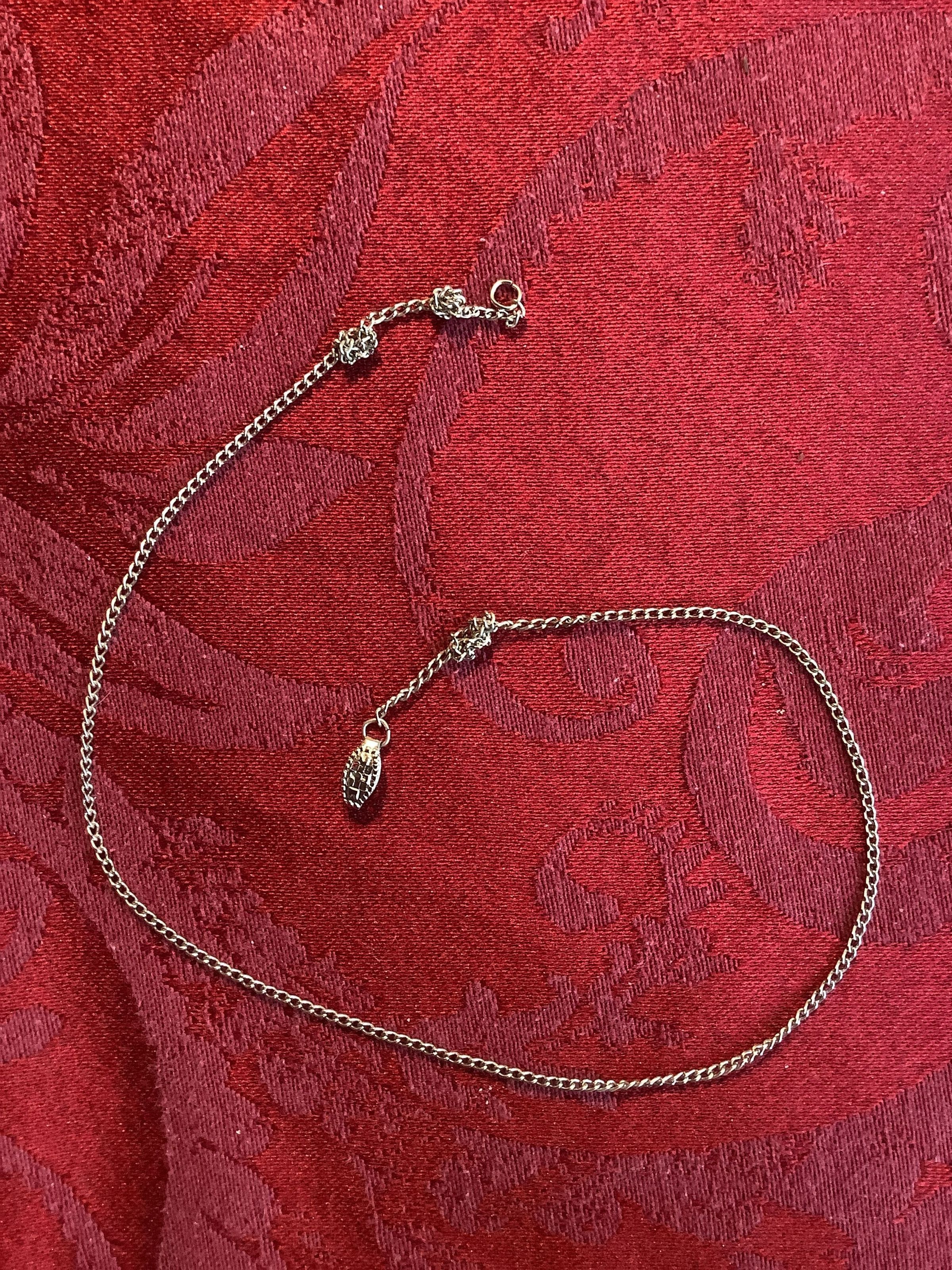 This is a silver toned, cable chain with a spring ring clasp. There are three knots in the chain.