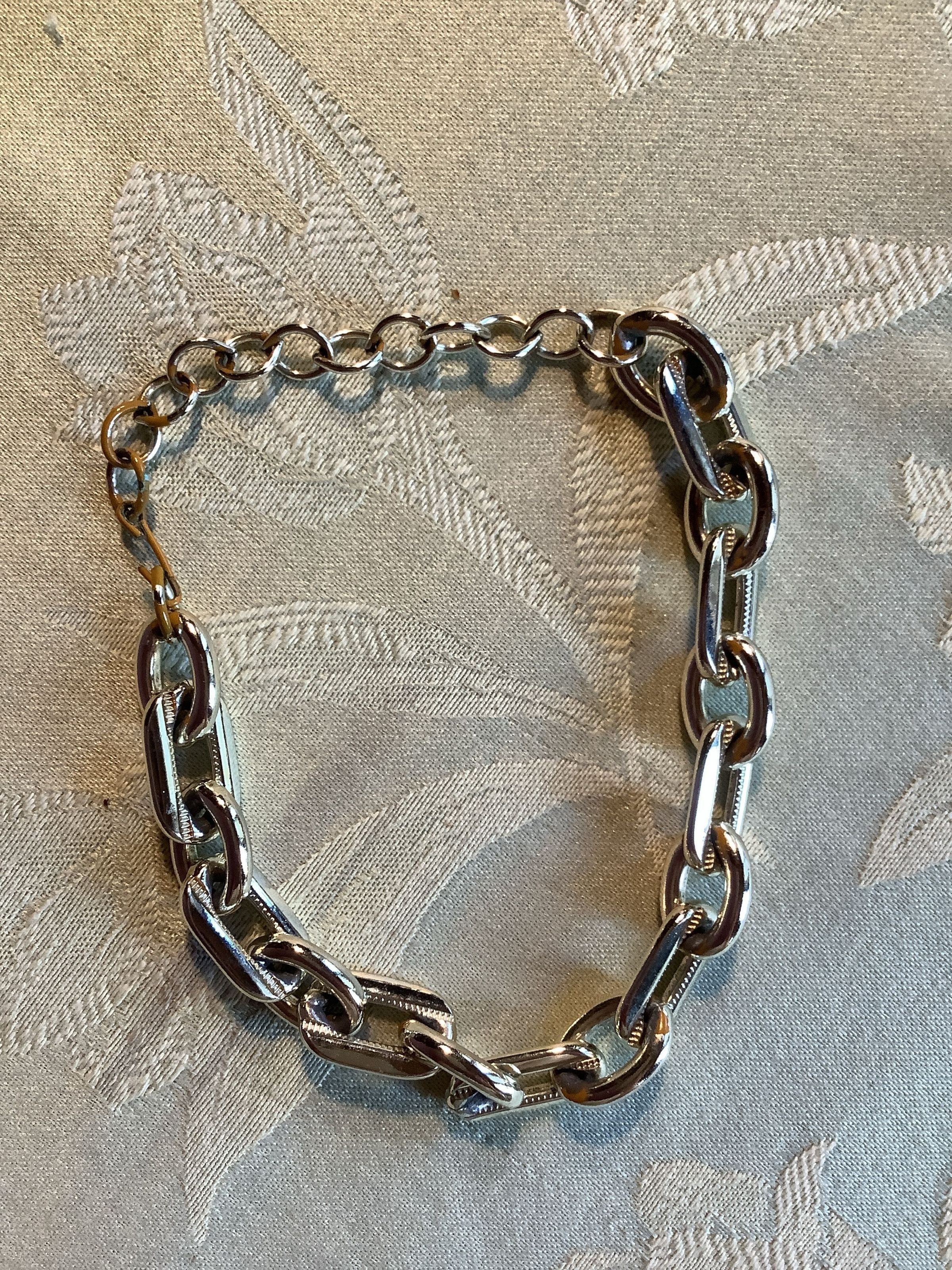 Silver toned chain bracelet with flecks of light brown paint on some of the rings.