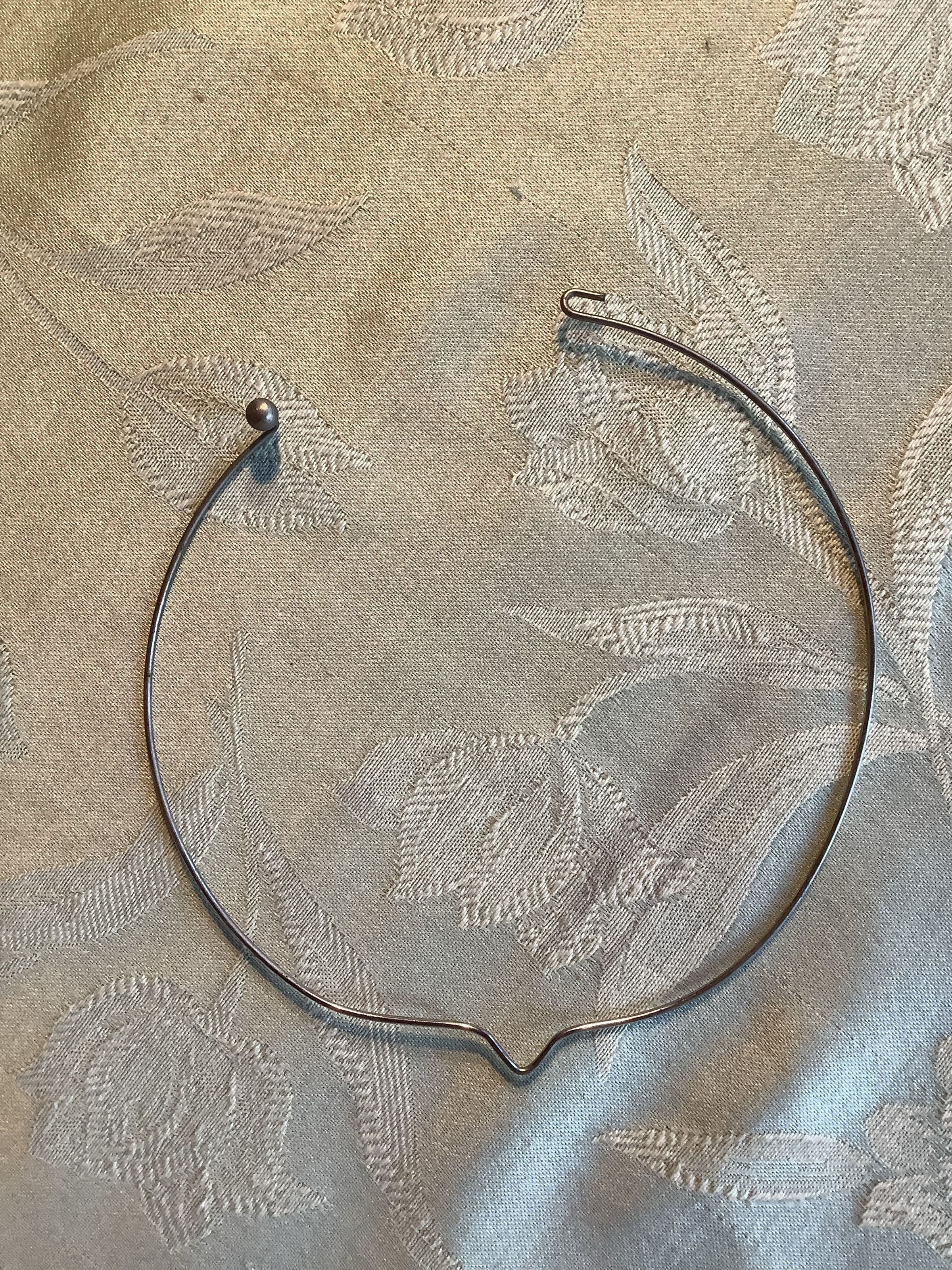 A silver toned metal collar or torque style choker necklace with a hook closure
