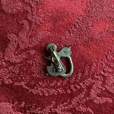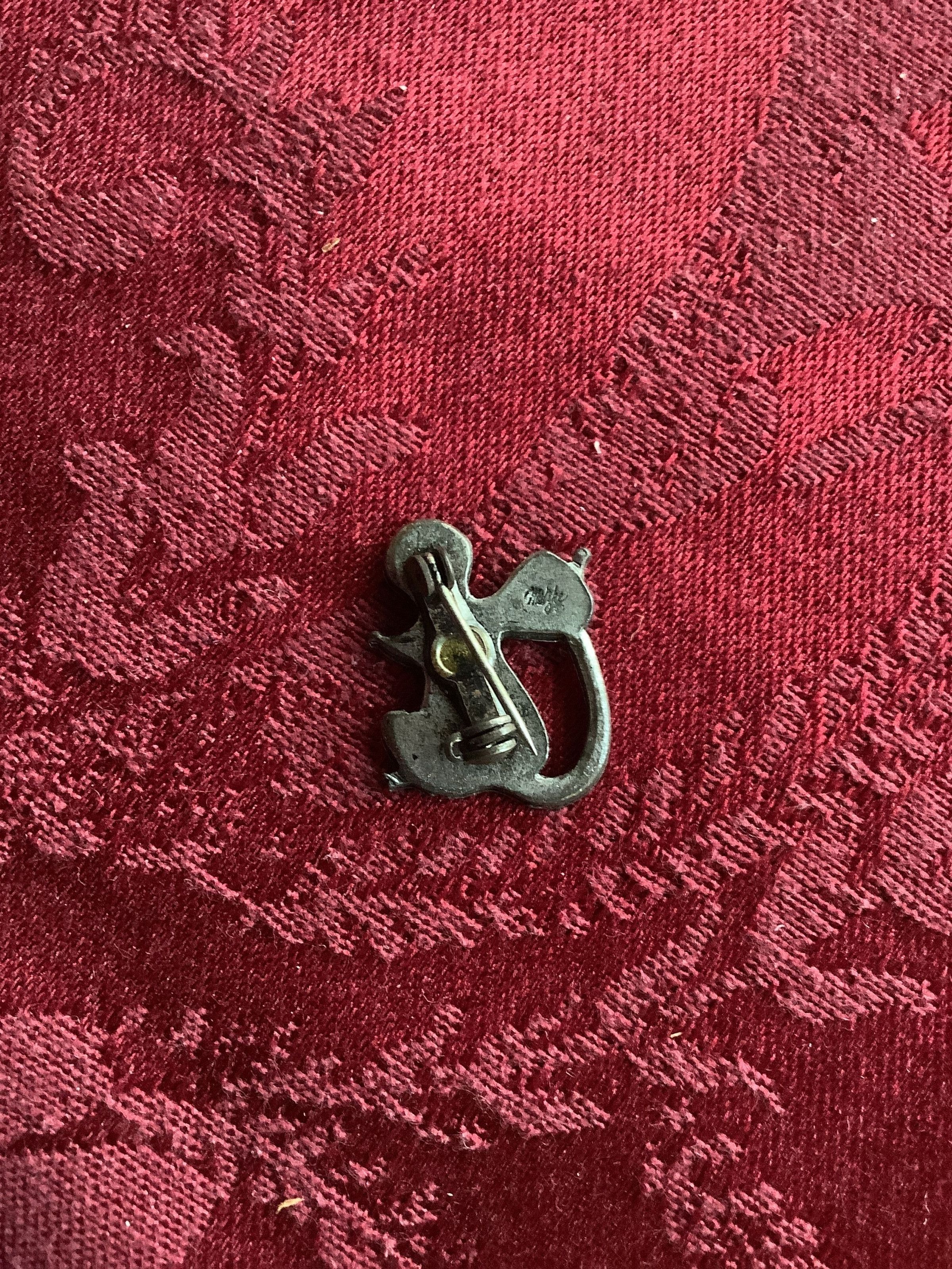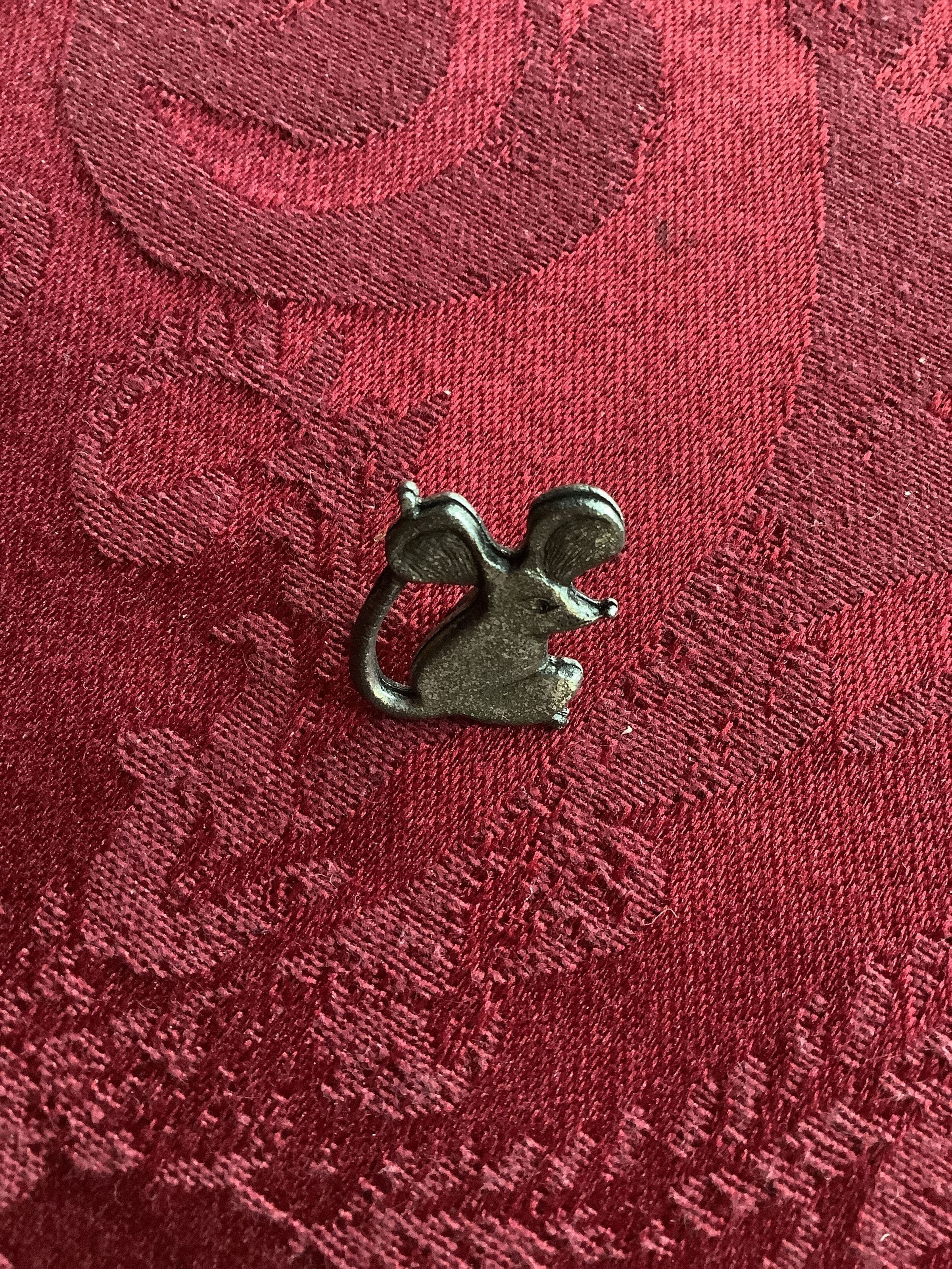 Silver toned, pewter mouse shaped pin with large ears and a curved tail with a bar pin on the back. The back of the pin has the signature “metzke” engraved on the metal, which was a jewelry company founded in 1963 and closed in 1997.Collection