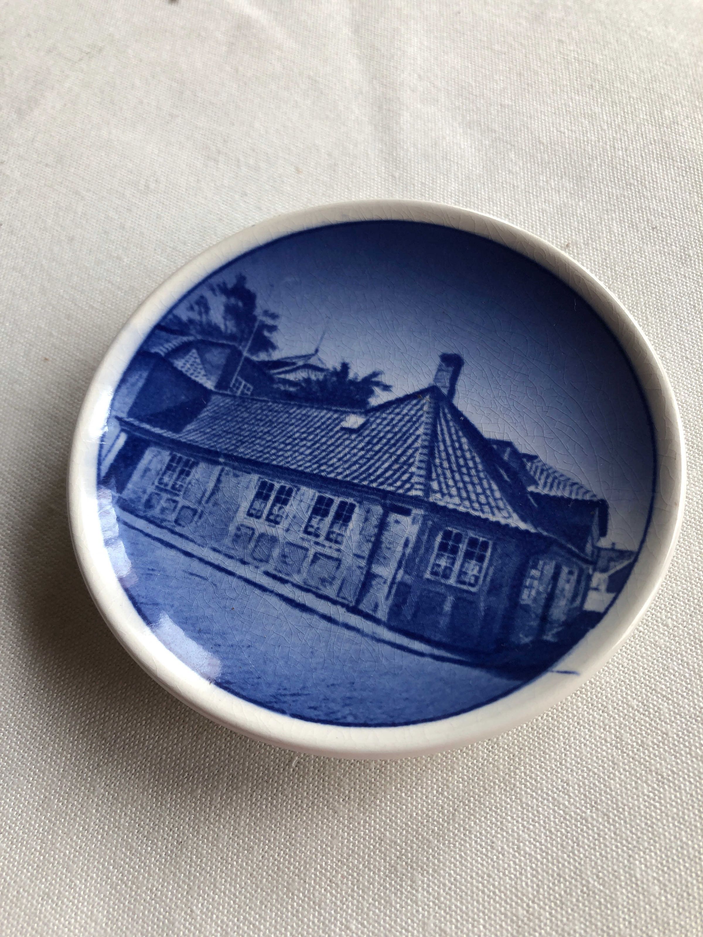 Small dish with white edges and in the center is a scene of a house with clay tile roof, done completely in blue.Inscription/Signature/Marks