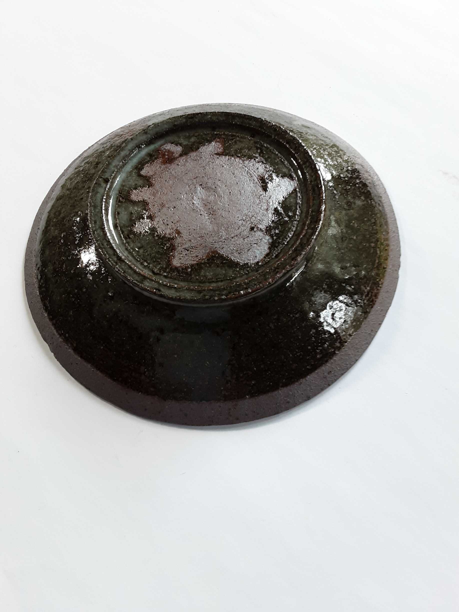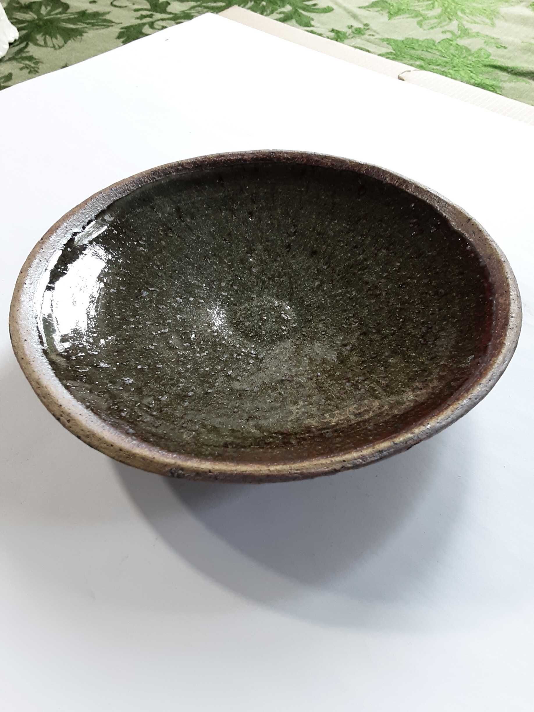 Ceramic bowl glazed in olive green with a dark brown outer edge, pewter colored splotch mark on bottom of dish