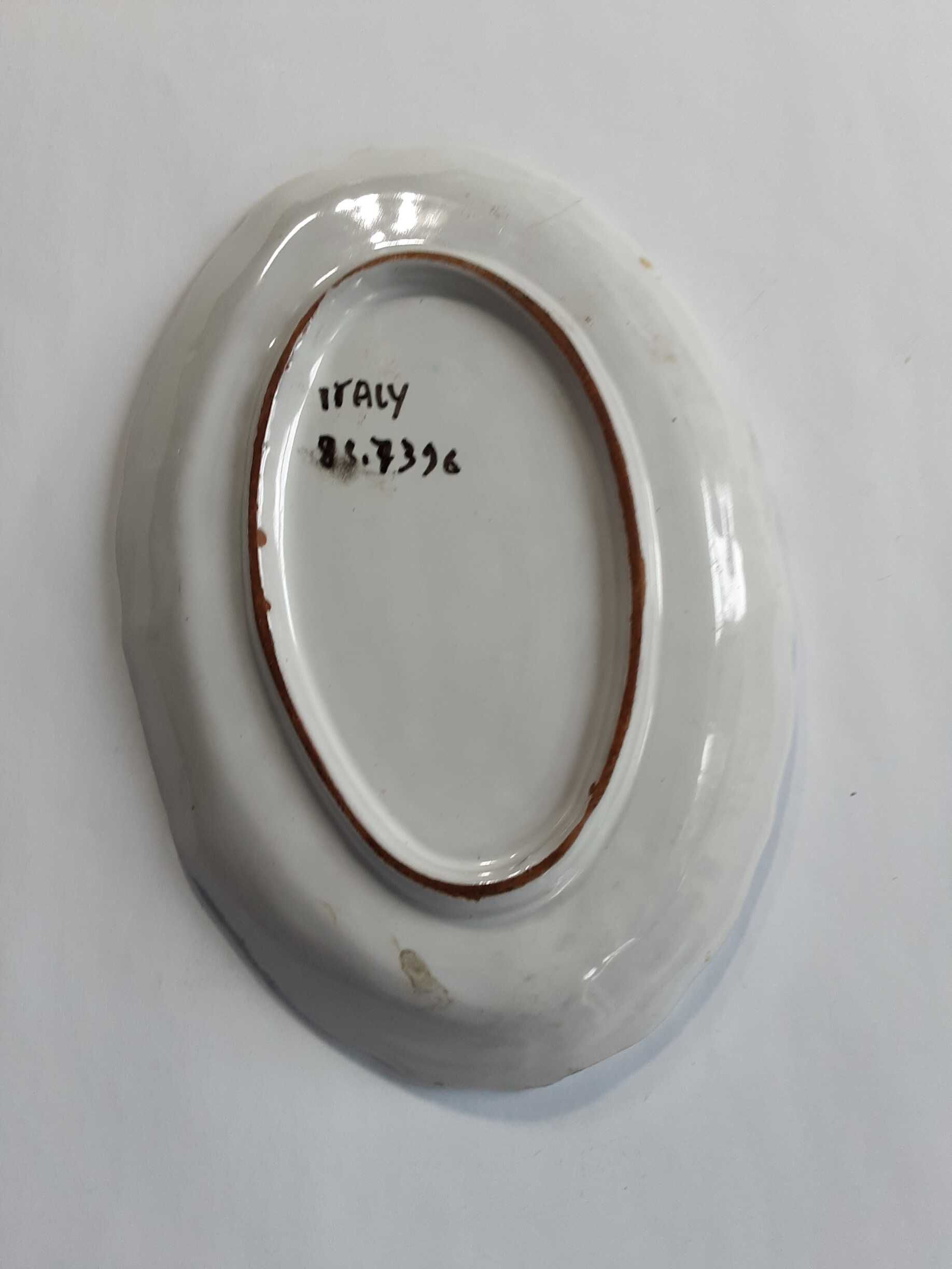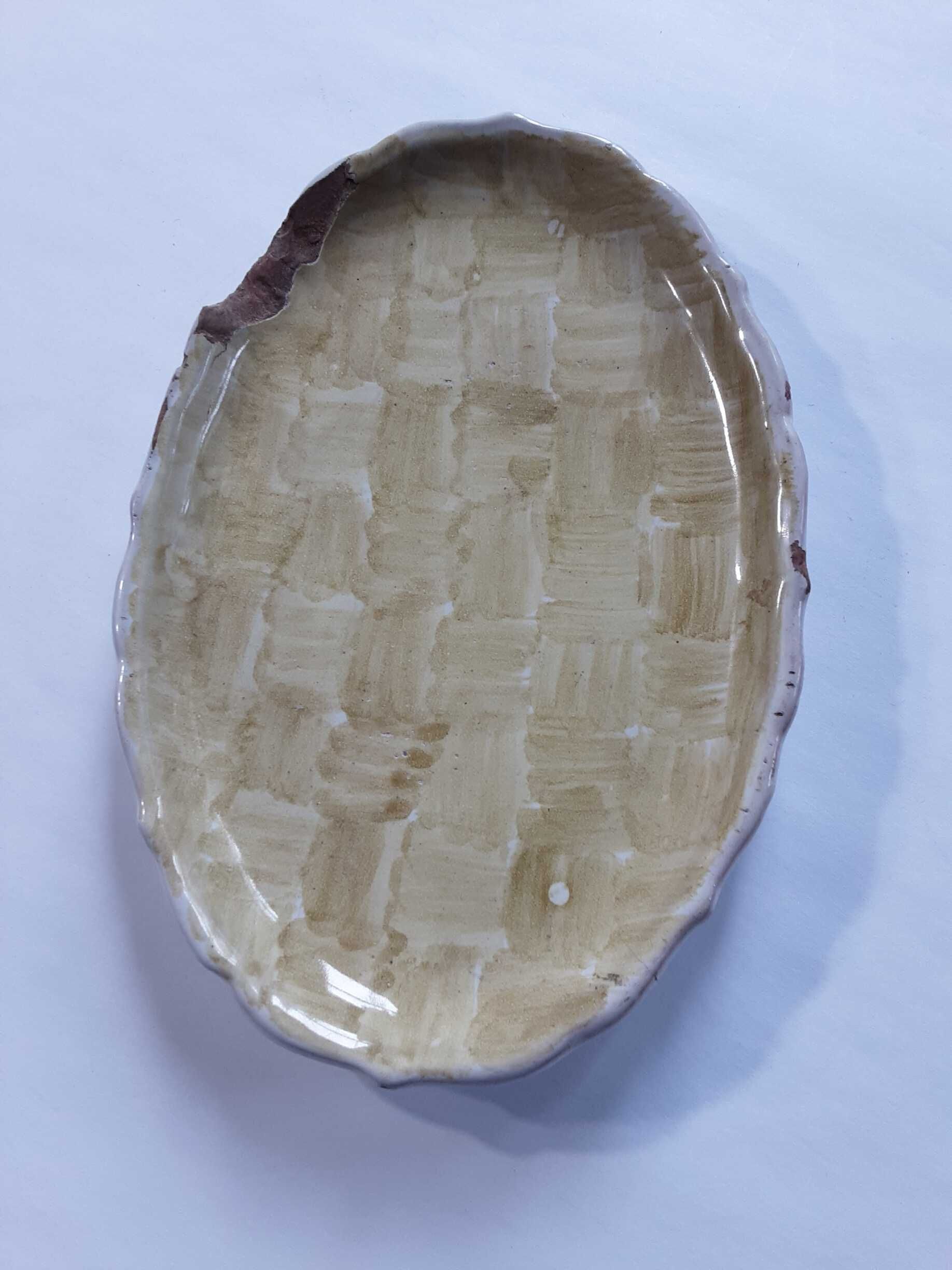 Oval ceramic dish painted in alternating brush strokes to imitate a basked weaveInscription/Signature/Marks