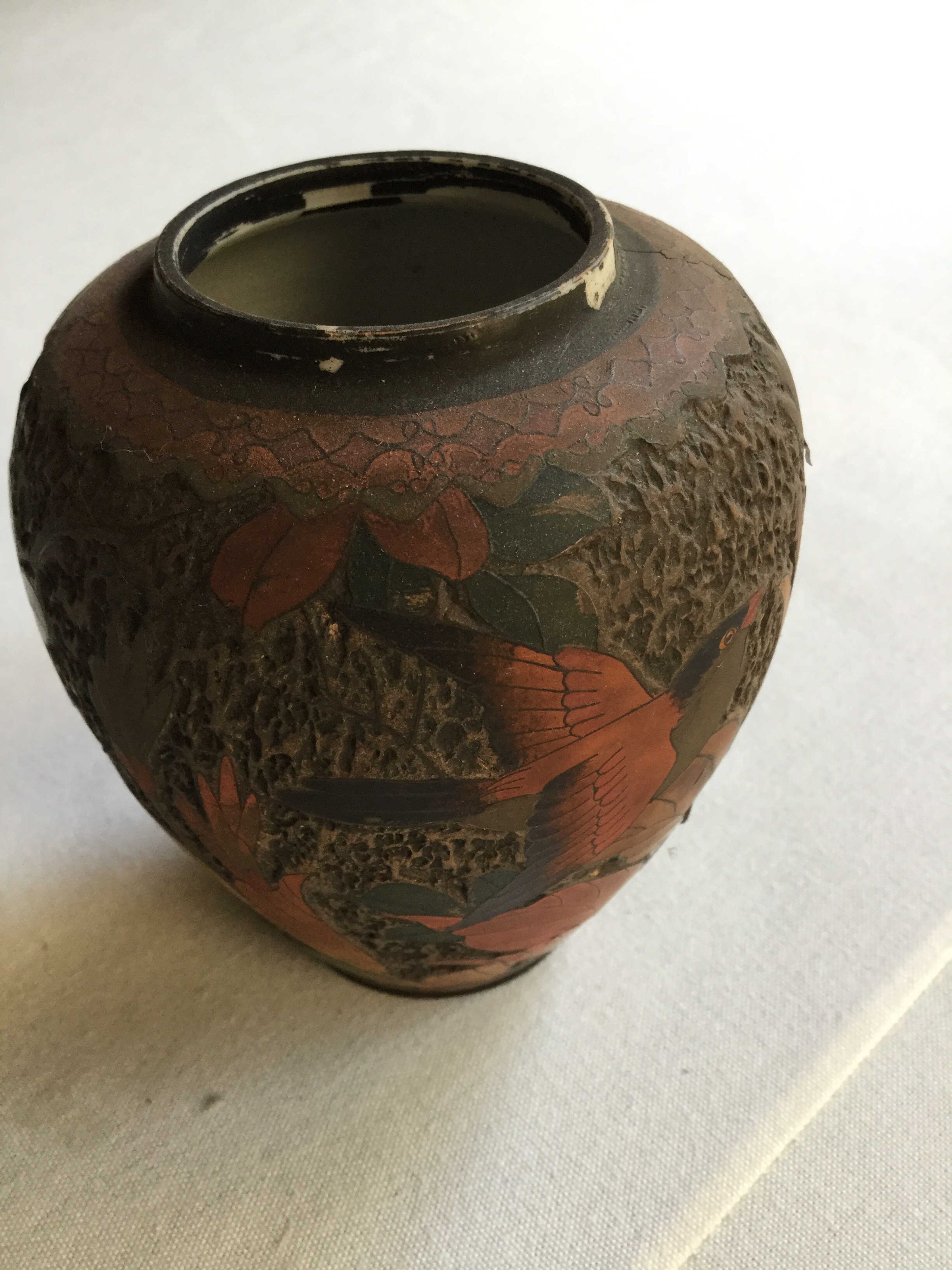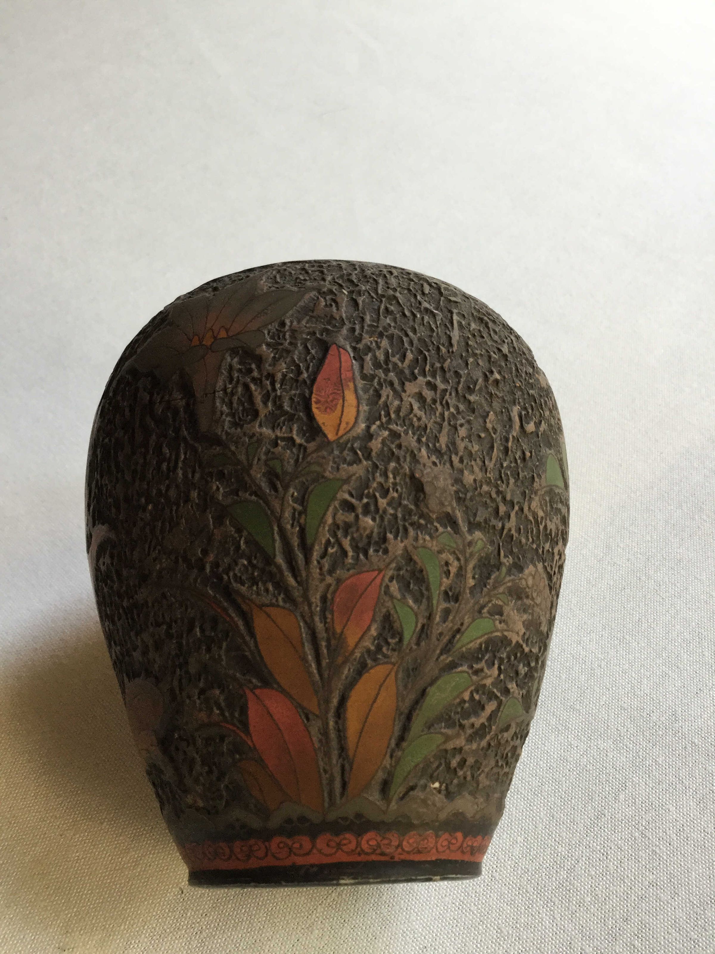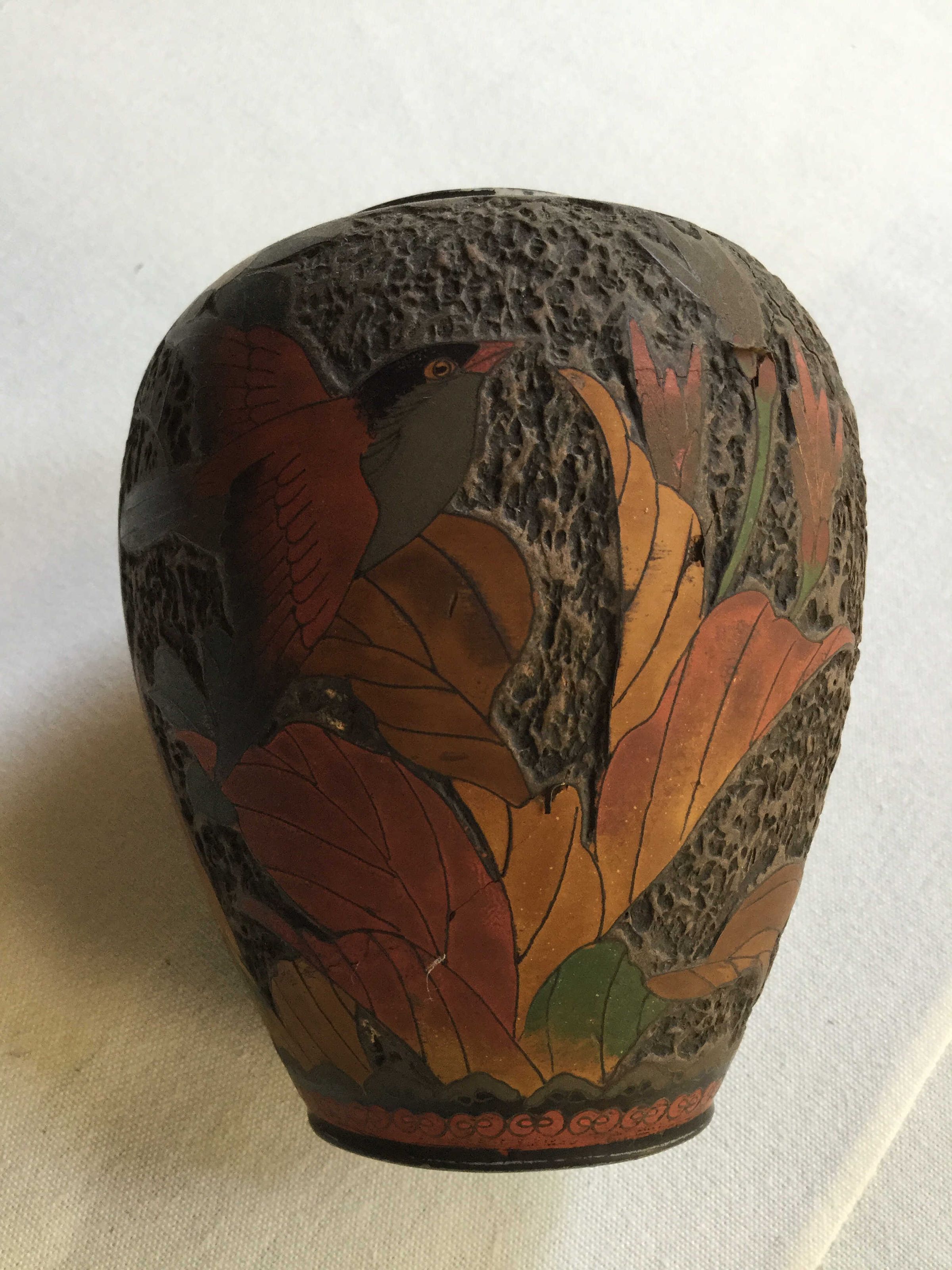 Small vase, dark brown in color, with a stylized depiction done in a raised etching of a bird in flight, dark auburn in color ending in black tipped wings, along with dark green, orange and yellow leavesCreate Date