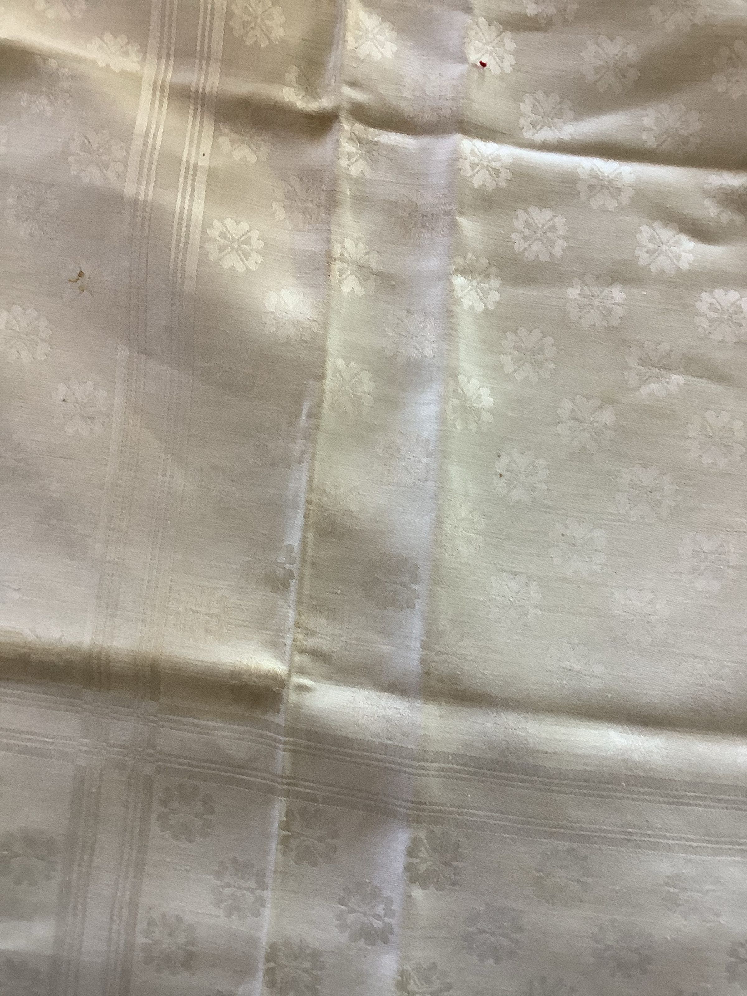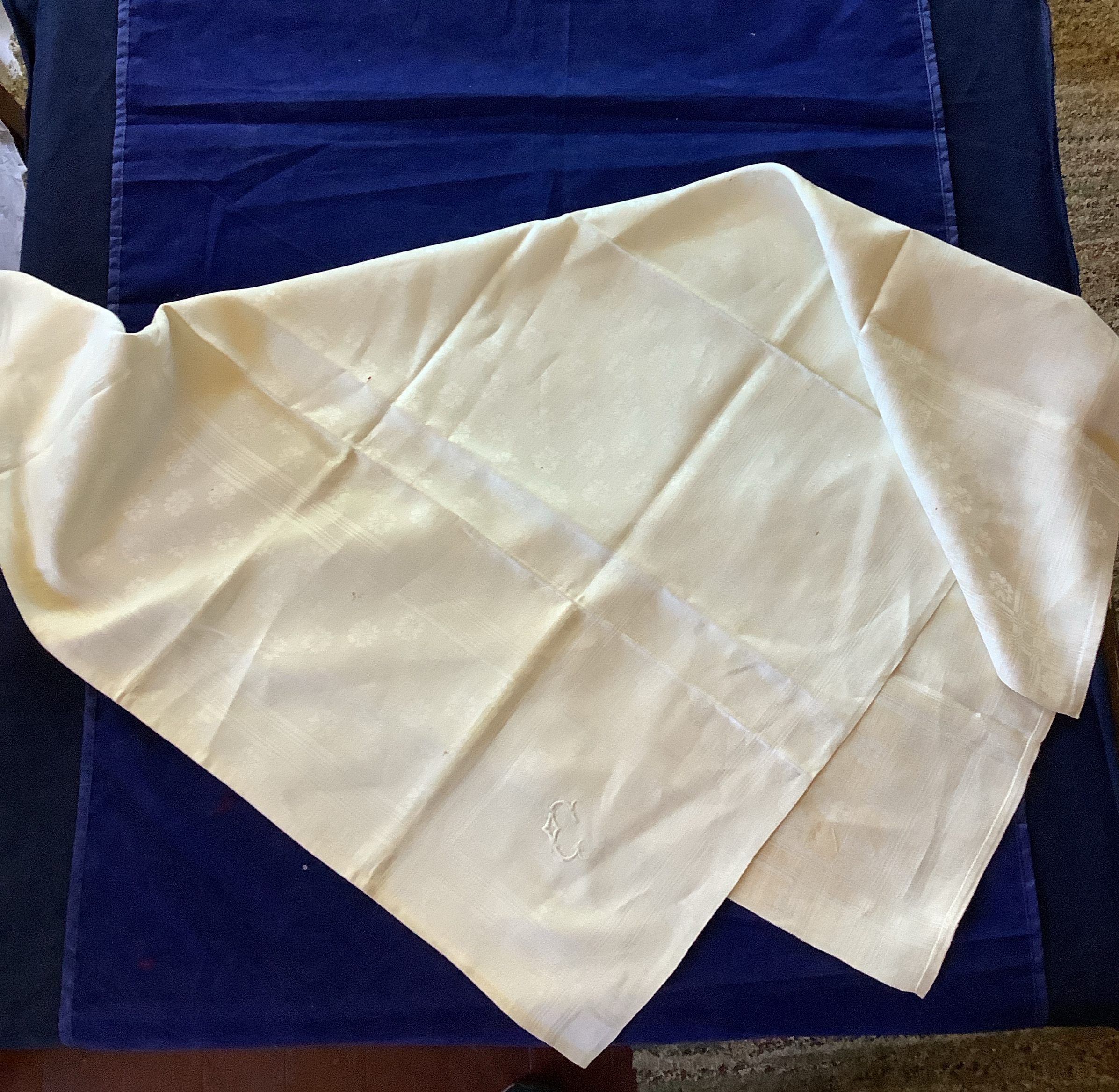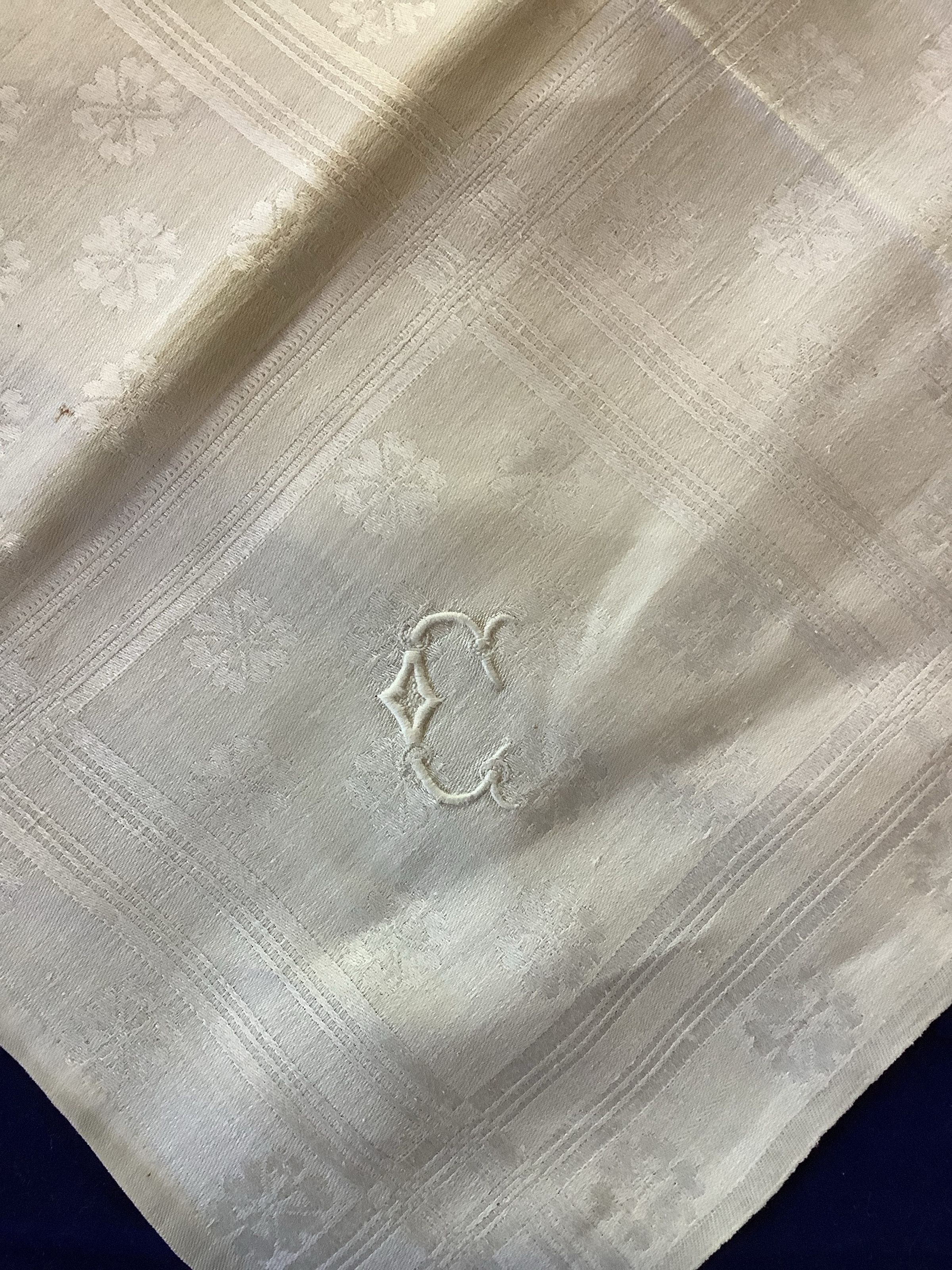 Soft white cloth with a woven background flower design. There is an embroidered “C” for Cohen.