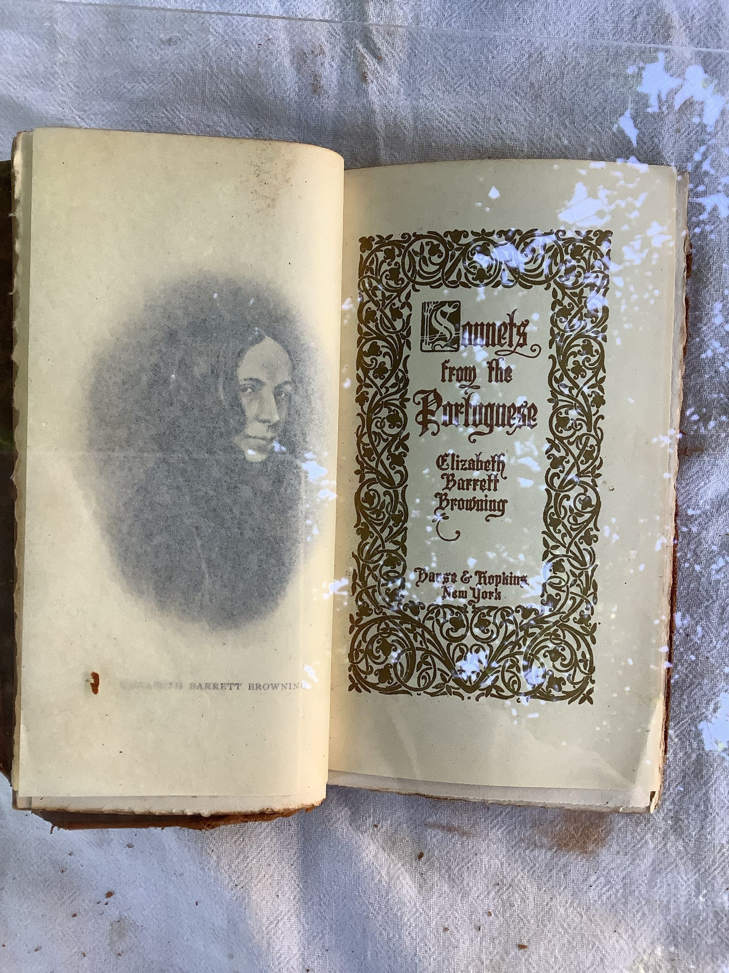Sonnets from the Portuguese is the collection of love poems written by Elizabeth Barrett Browning in the time leading up to her marriage to Robert Browning. Elizabeth hesitated in publishing the poems, as they were so personally revealing, but her husband persuaded her of their high worth. She decided to pass them off as translations, in order to obscure her authorship, and so the title of the collection came about. They were, and remain, immensely popular. --WorldCatInscription/Signature/Marks