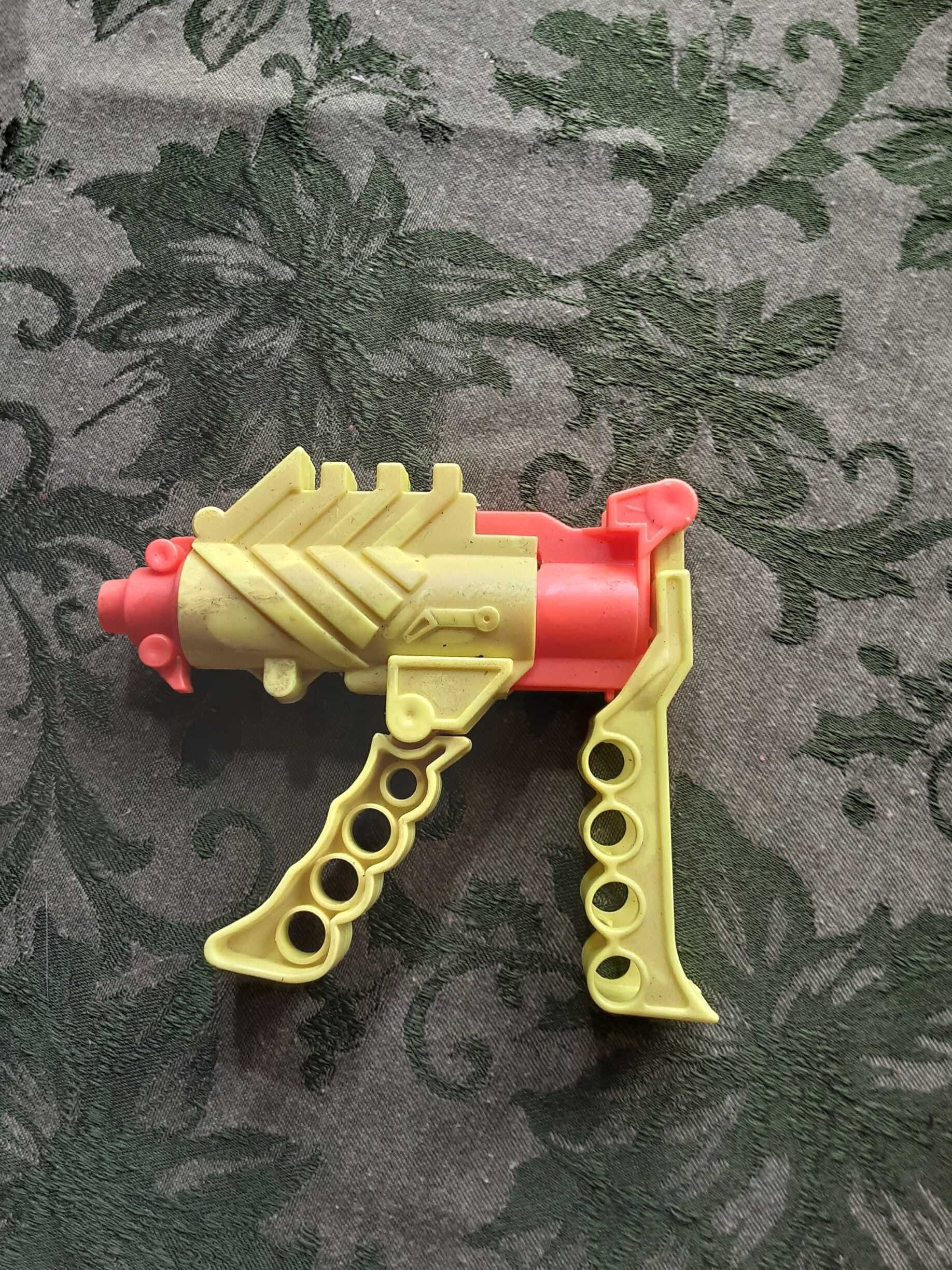 Pump action plastic squirt gun with yellow barrel and red accents, stamped maker's logo reads "Jaru."