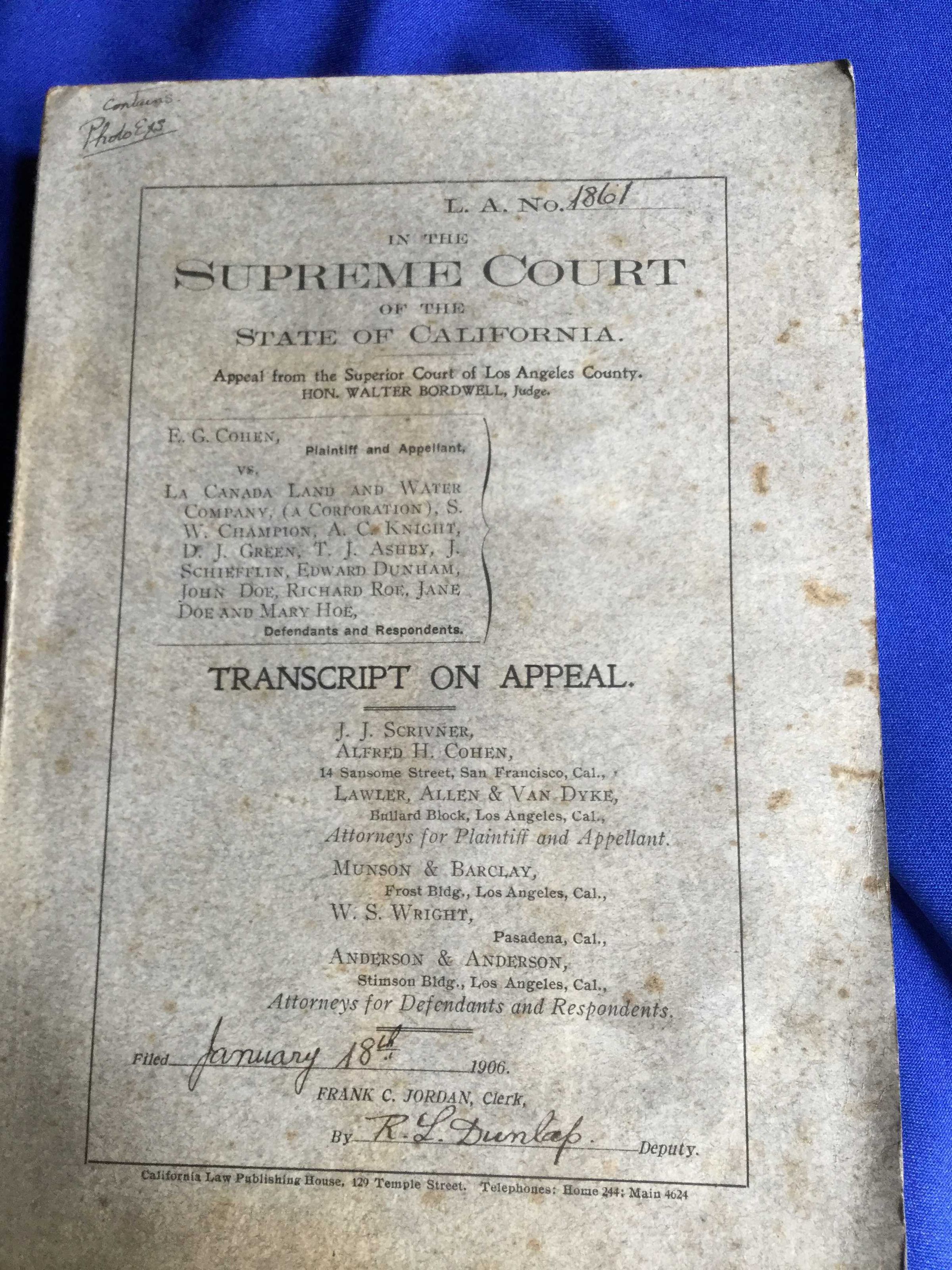 Supreme Court transcript for appeal of E.G. Cohen v. La Canada Water Company; PHYSDESC: 25.5cm x 18cm; 376 pages.Relationships