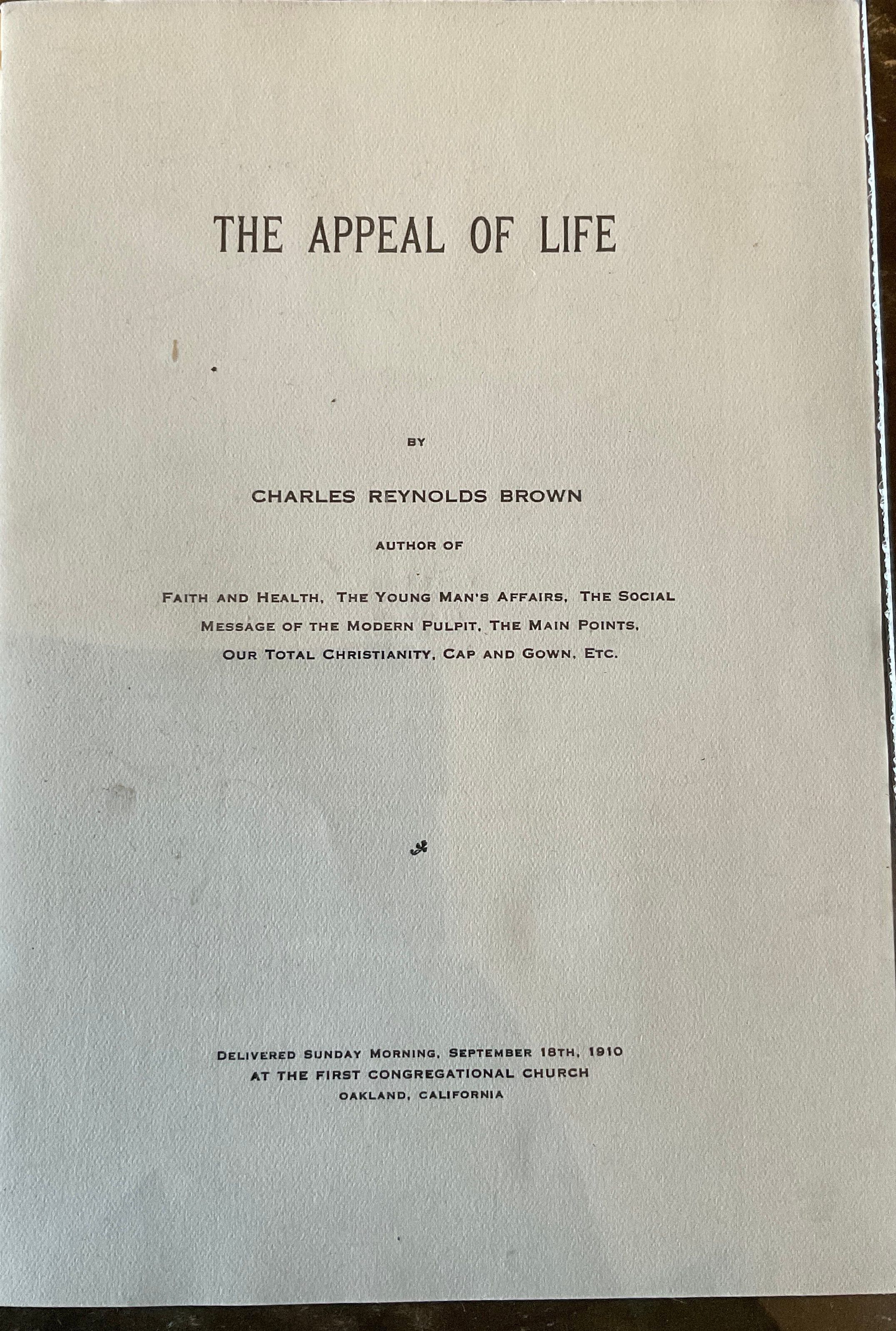 A book of sermons by Charles Reynolds Brown. Found amongst Emma Cohen Bray’s belongings.
