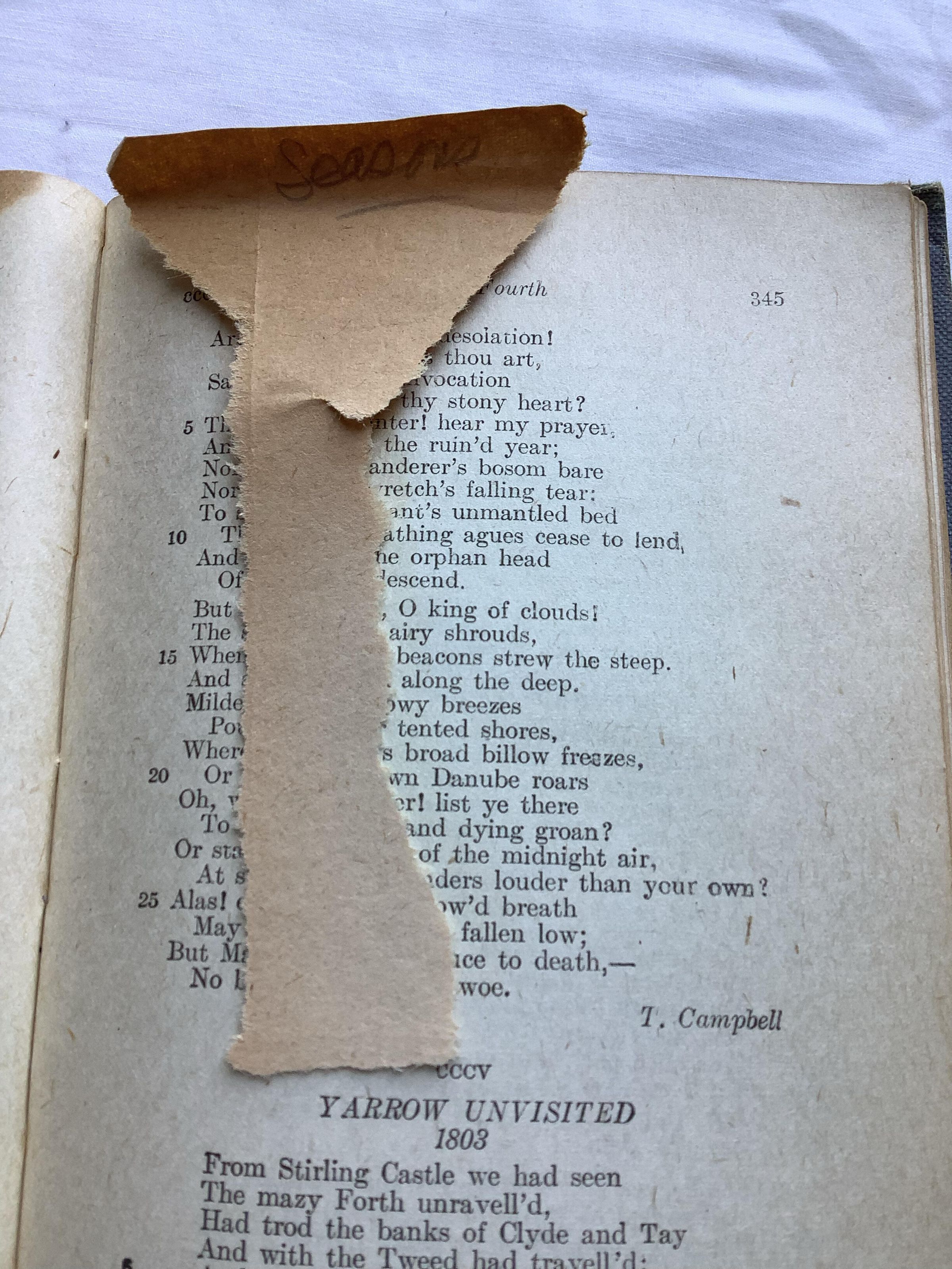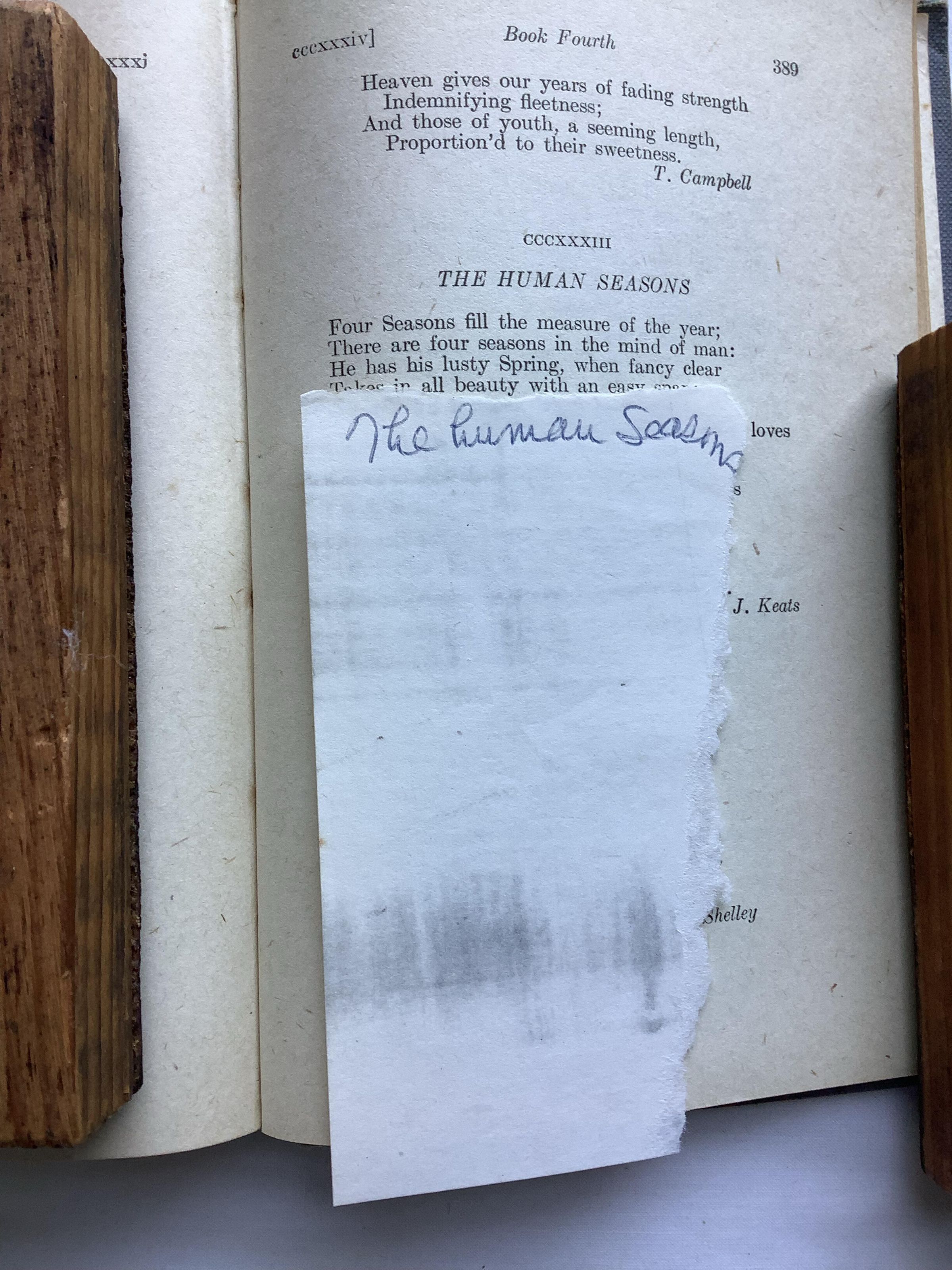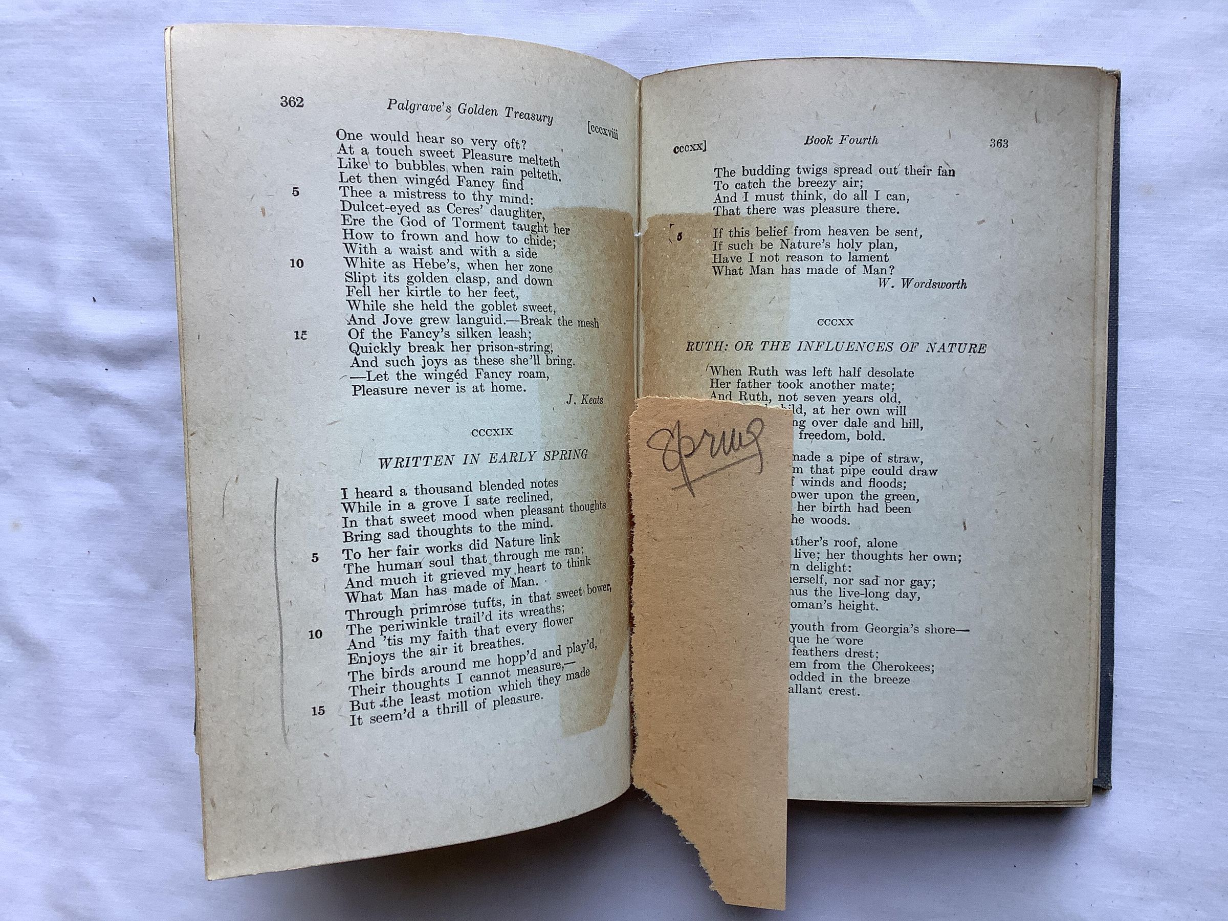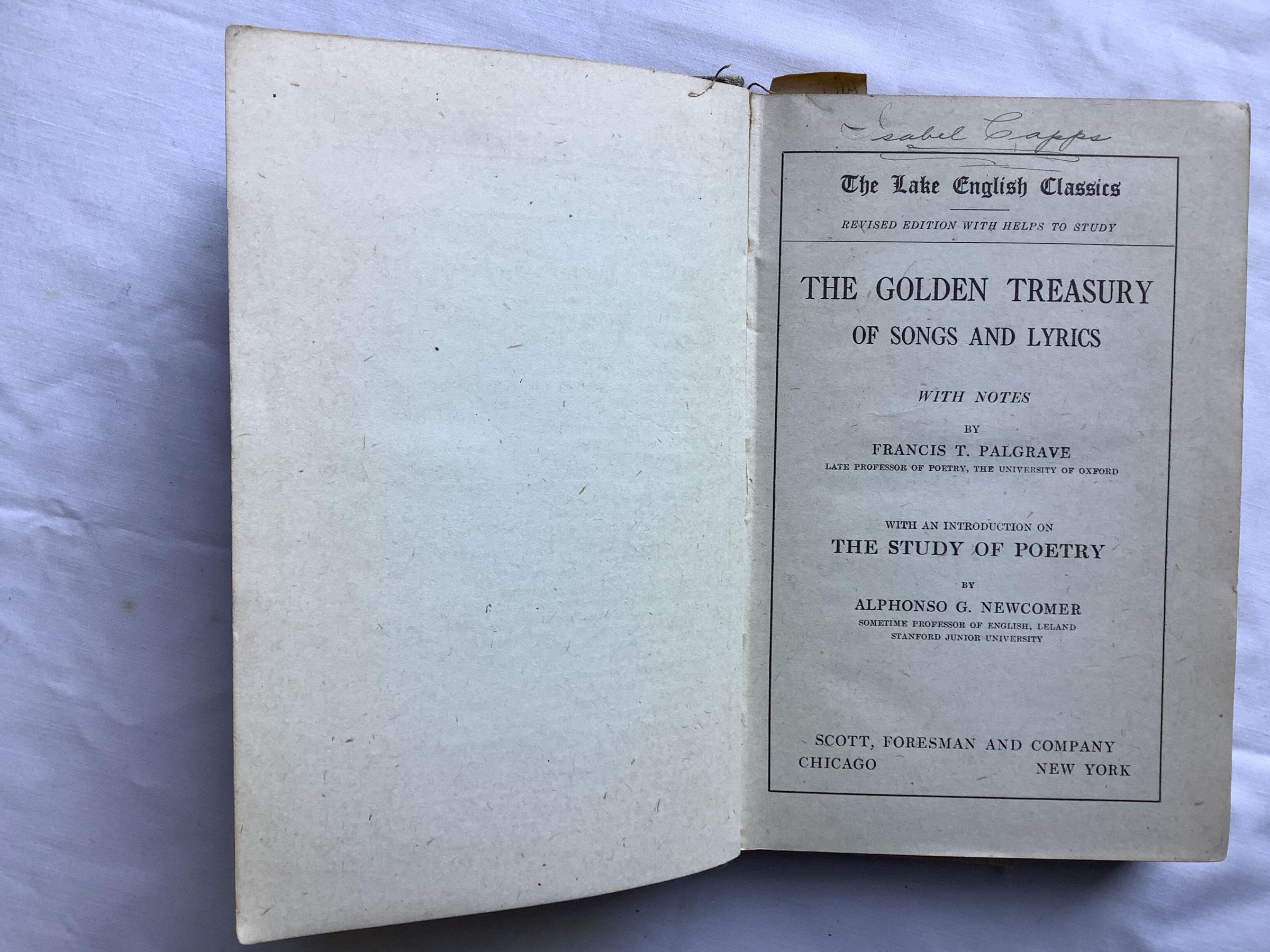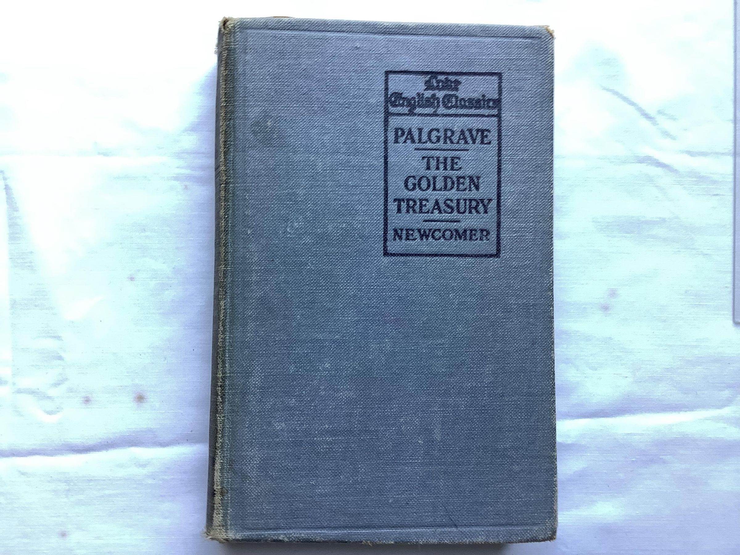 Popular anthology of English poetry, originally selected for publication by Francis Turner Palgrave in 1861. It was considerably revised, with input from Tennyson, about three decades later. Palgrave excluded all poems by poets then still alive. The book continues to be published in regular new editions; still under Palgrave's name. These reproduce Palgrave's selections and notes, but usually include a supplement of more recent poems. --WikipediaInscription/Signature/Marks
