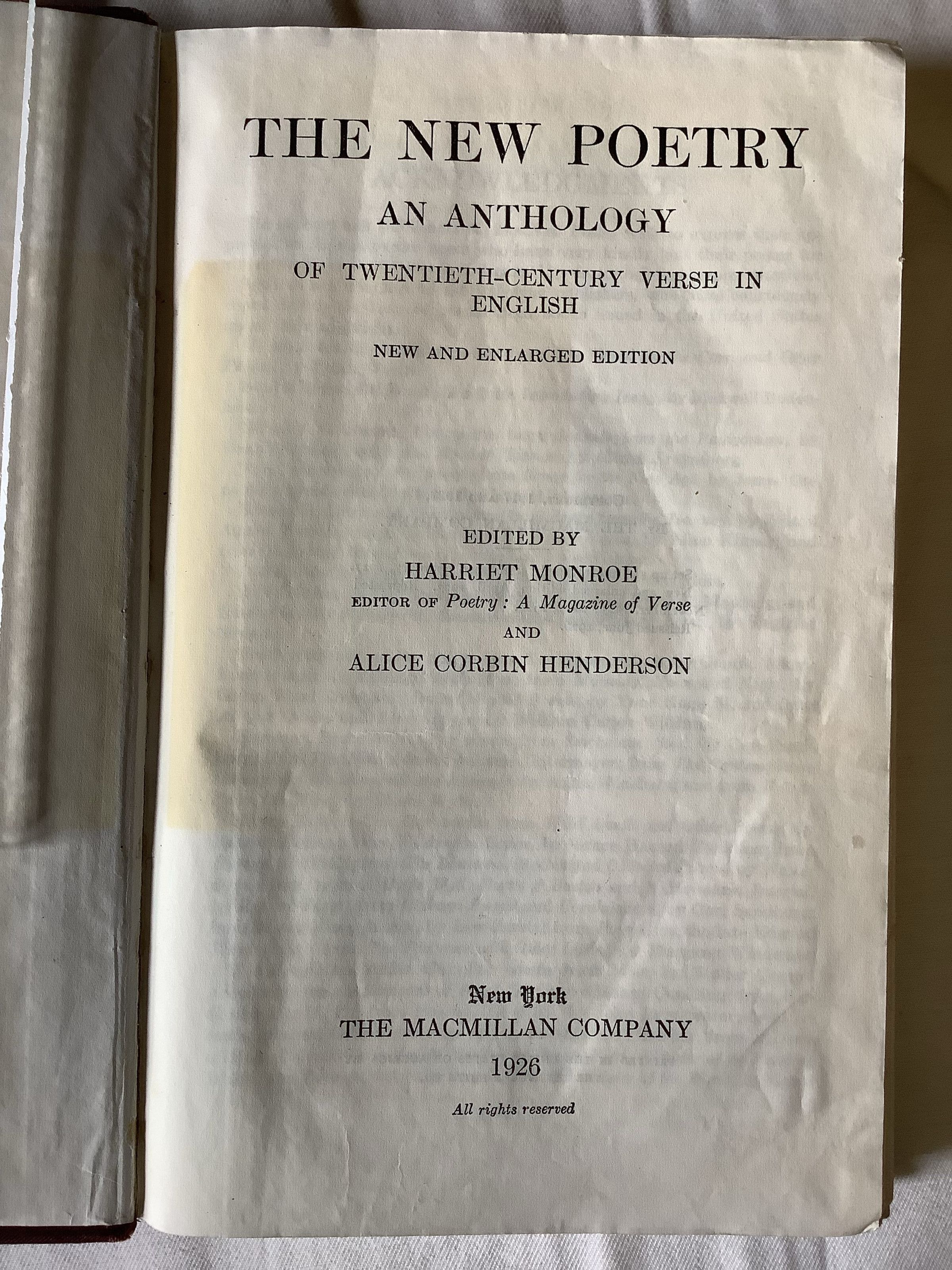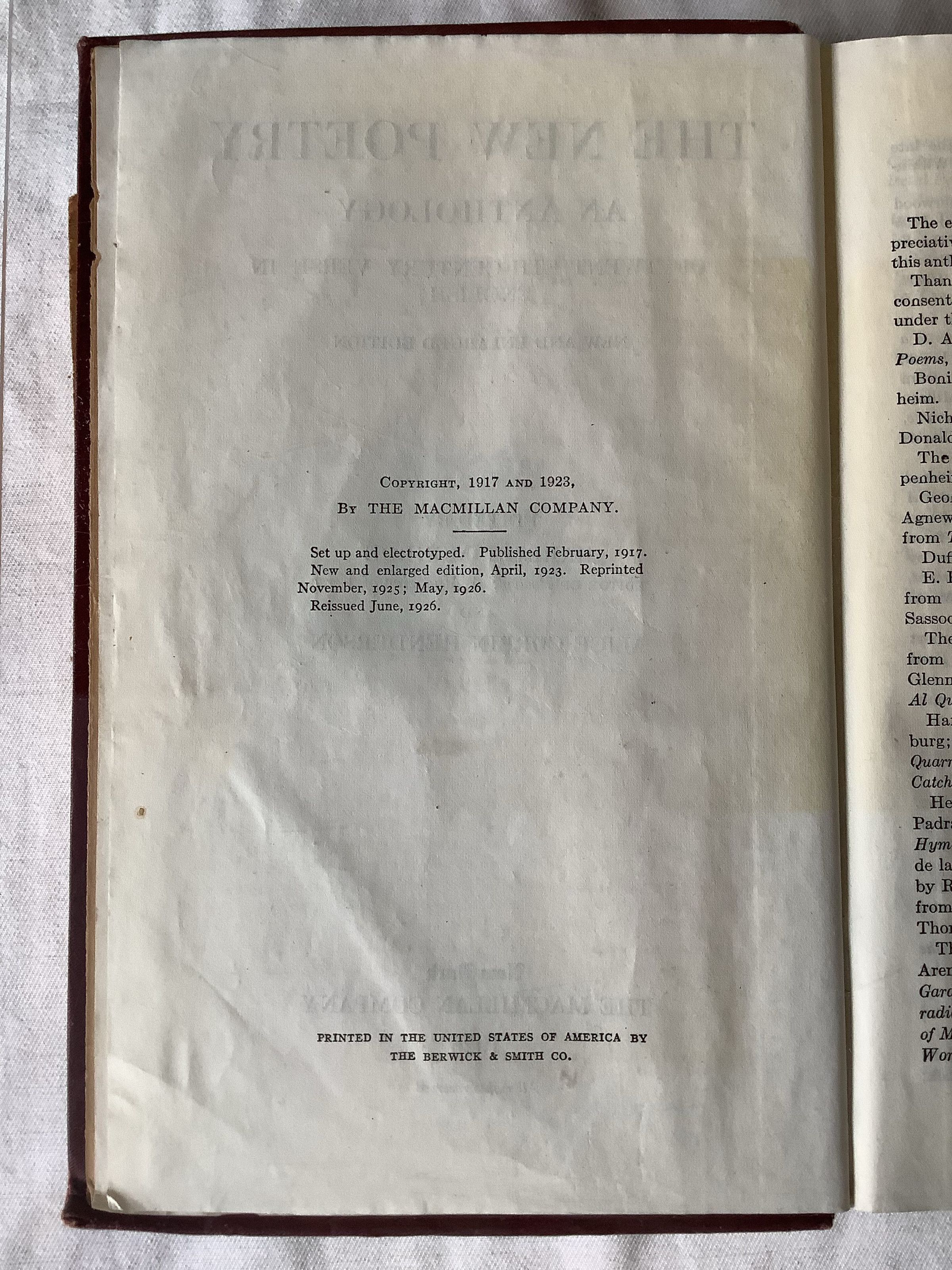 The editors of this anthology wish to present in convenient form representative work of the poets who are today creating what is commonly called “the new poetry,” [...] The new poetry strives for a concrete and immediate realization of life; it would discard the theory, the abstraction, the remoteness, found in all classics not of the first order. It is less vague, less verbose, less eloquent, than most poetry of the Victorian period and much work of earlier periods. --Book's introductionInscription/Signature/Marks