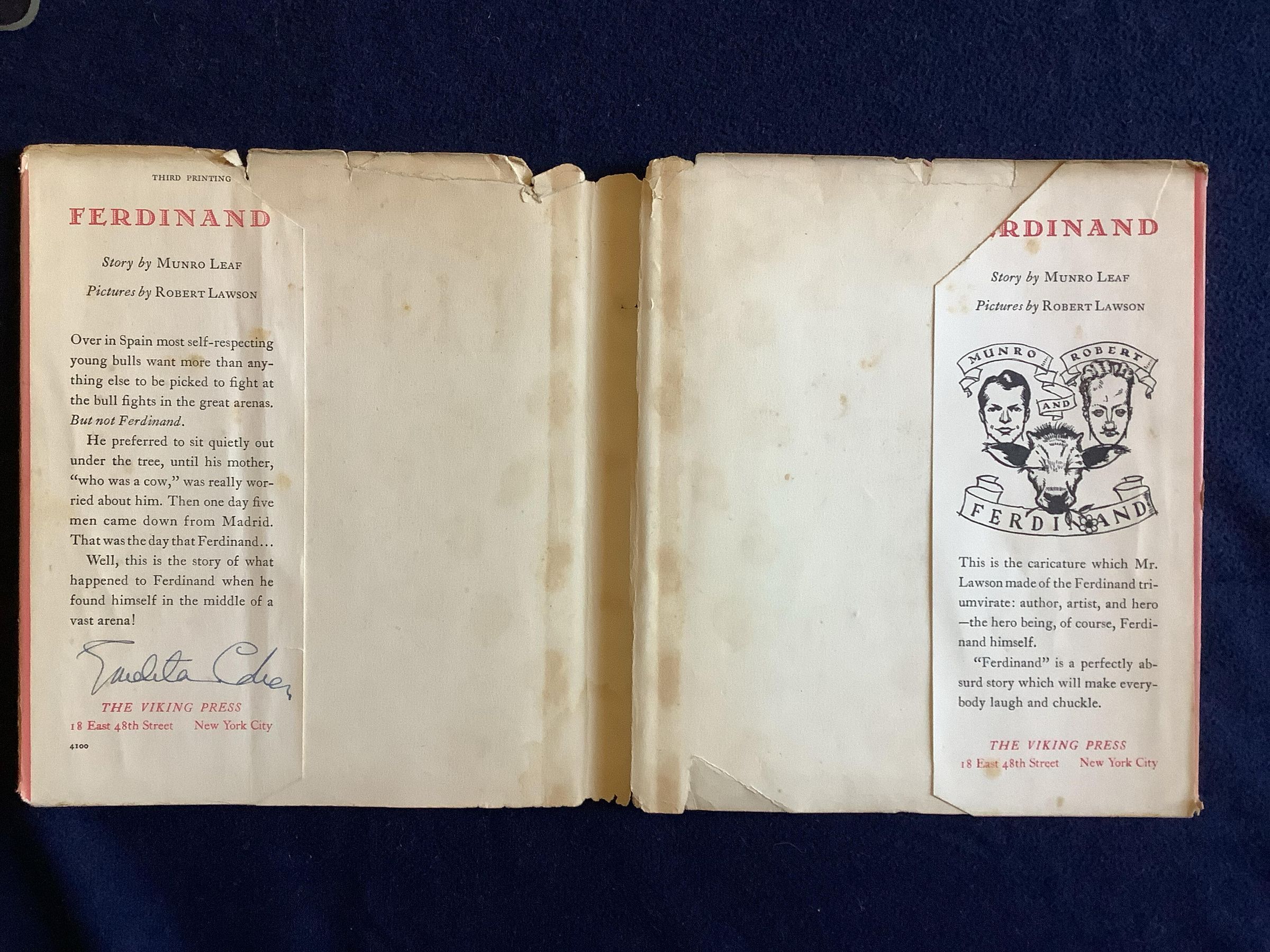 All the other bulls run, jump, and butt their heads together in fights. Ferdinand, on the other hand, would rather sit and smell the flowers. So what will happen when Ferdinand is picked for the bullfights in Madrid? --Publisher.Inscription/Signature/Marks