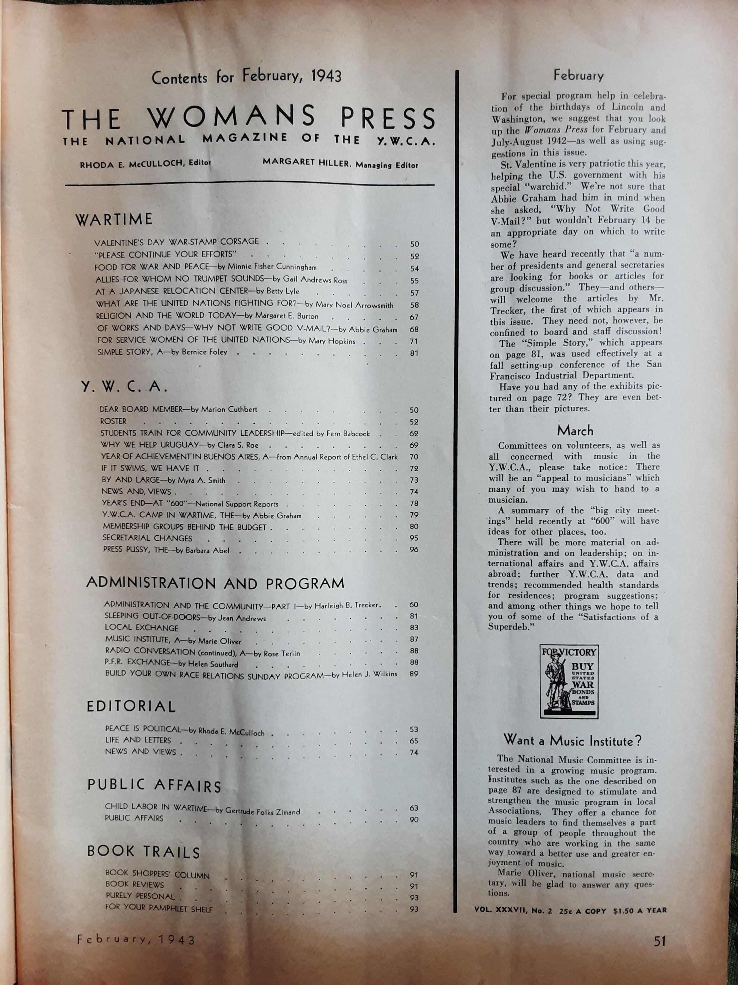 February: For special program help in celebration of the birthdays of Lincoln and Washington, we suggest that you look up the Womans Press for February and July-August 1942--as well as using suggestions in this issue...
