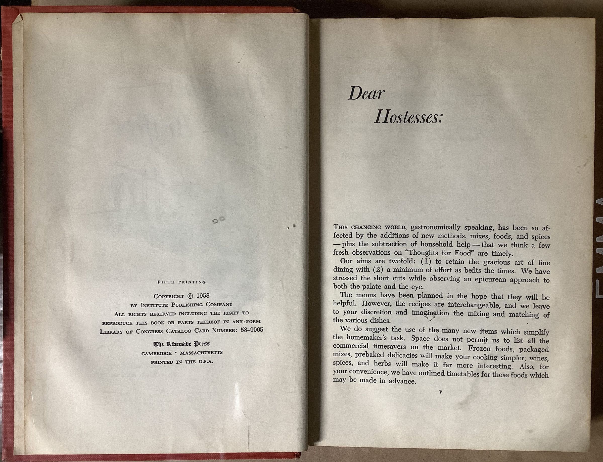 Book created by Chicago hostesses with 100 menus for buffets. "The hostess-cook will find her job simplified by specific instructions with each menu for all those dishes which can be prepared well in advance, and the authors have taken full advantage of all the recent developments in frozen foods..."Create Date