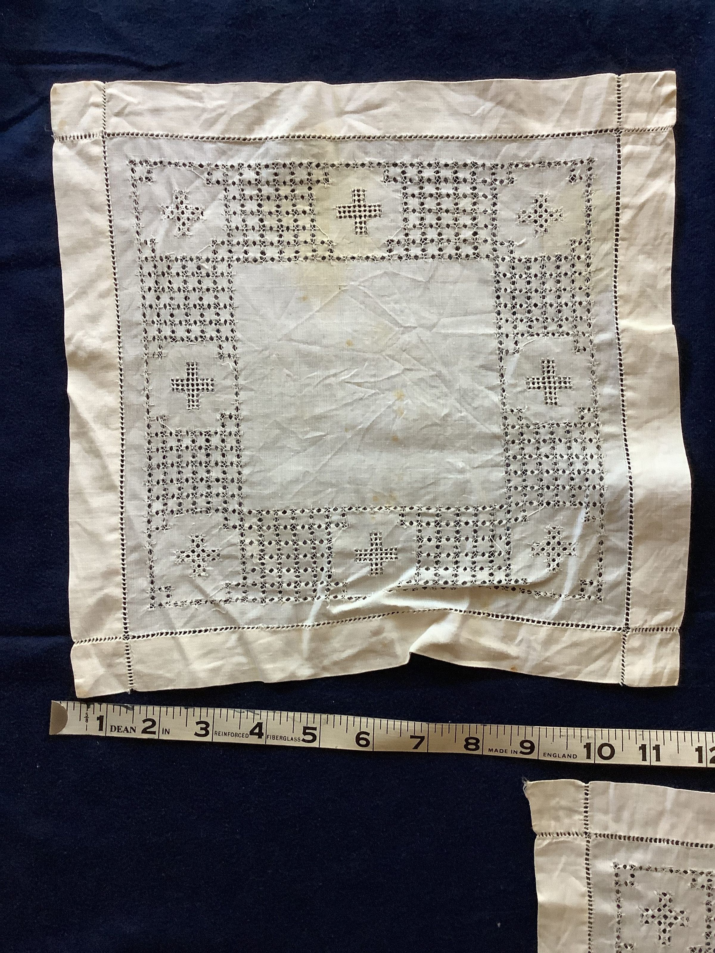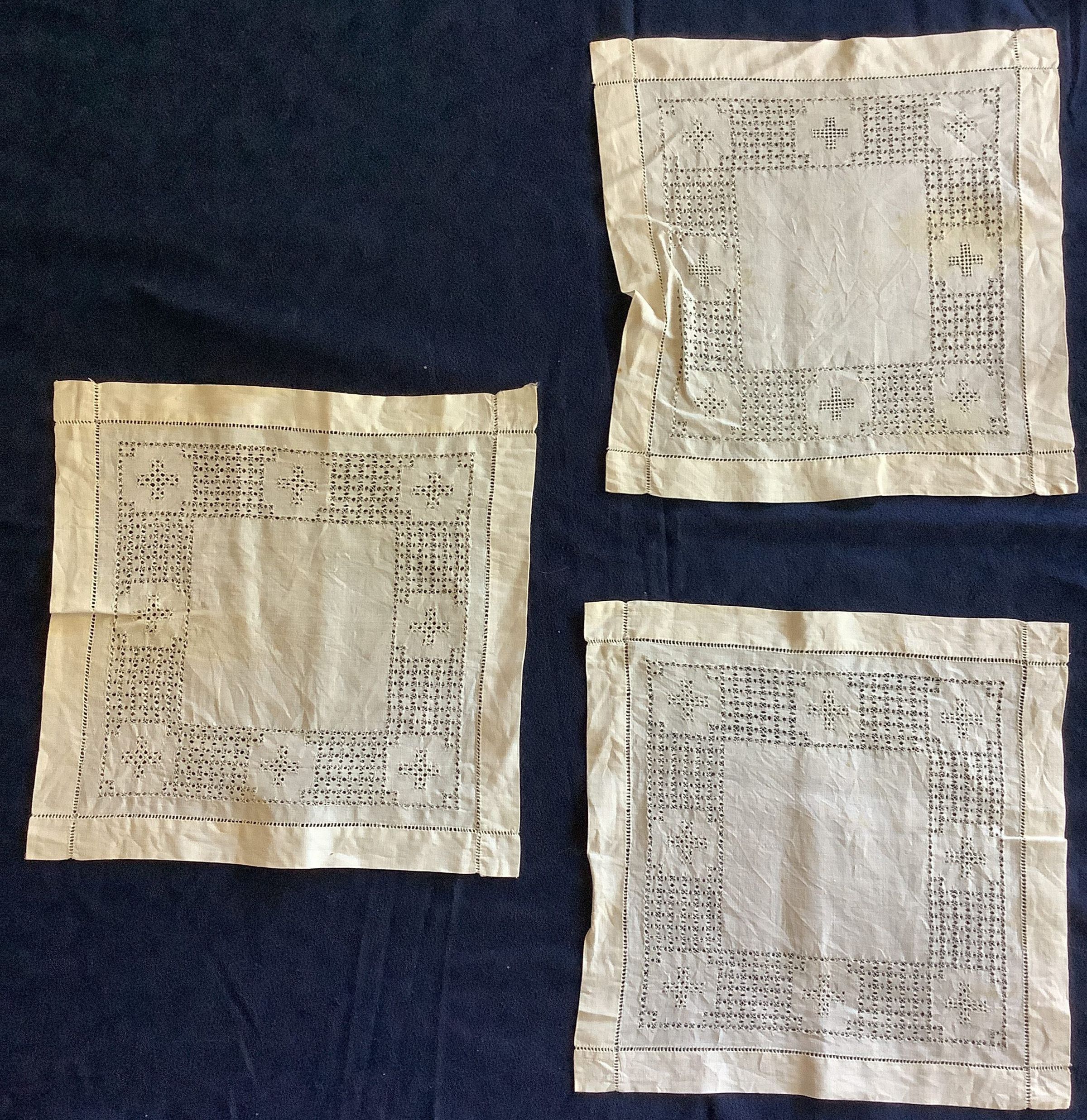 These are 3 medium sized square textiles with a drawn hole design.