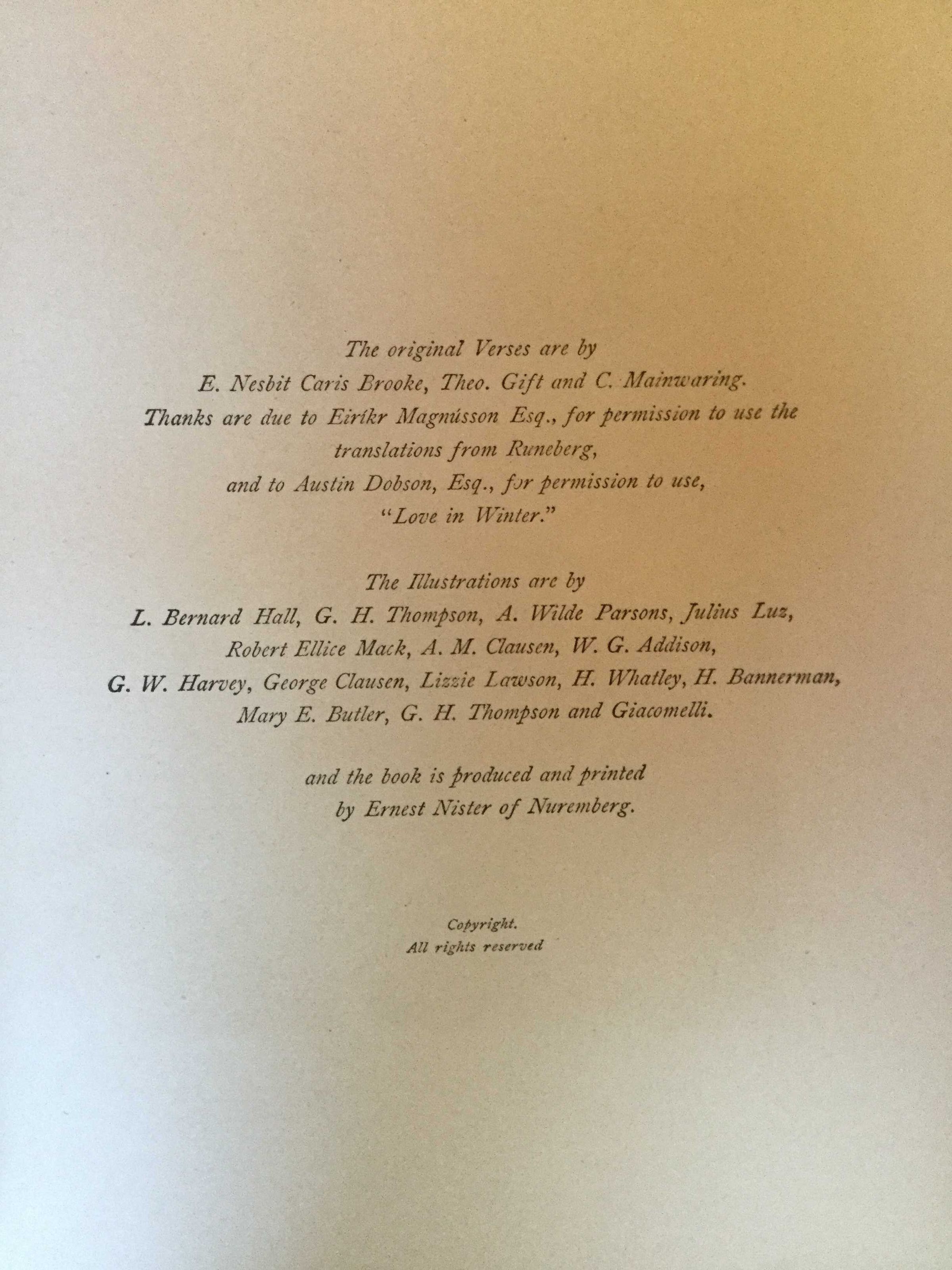 Compilation of Verses and illustrations; PHYSDESC: Green cover w/gold and silver design. Inscription "Many Happy returns to Alfred And Emma from Ethel May 17-19 -1892Collection